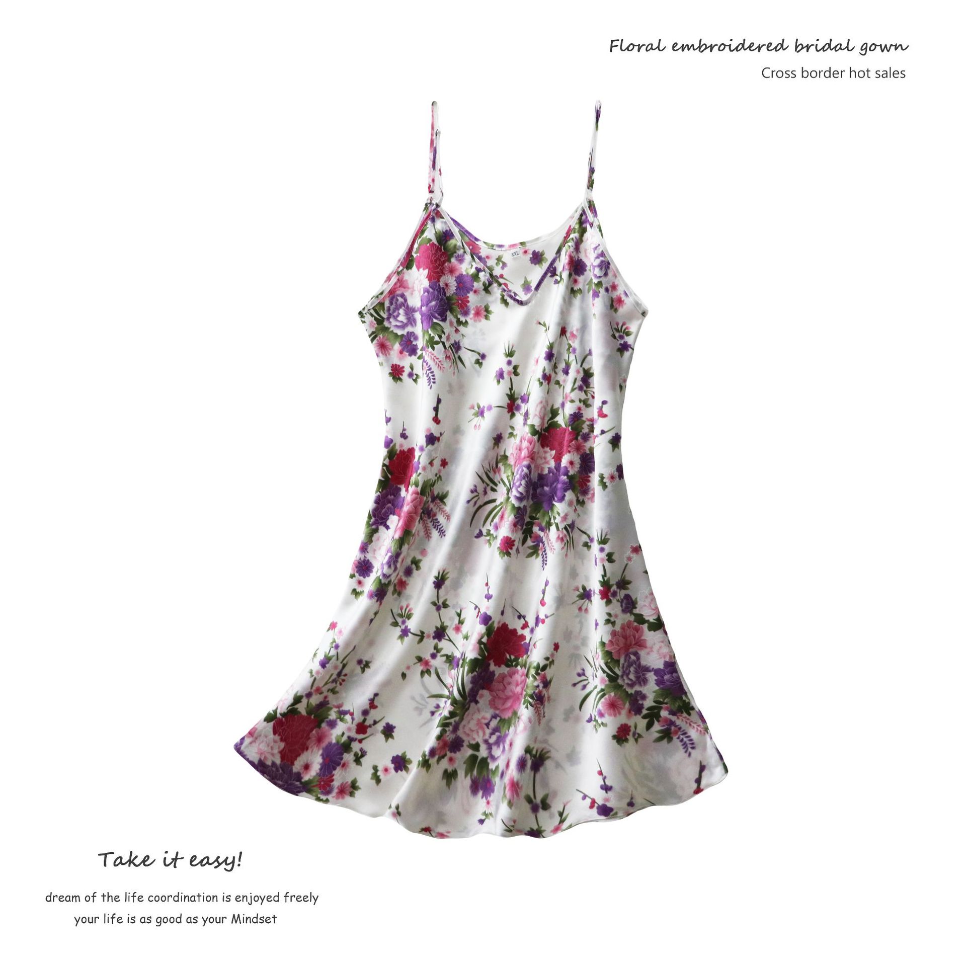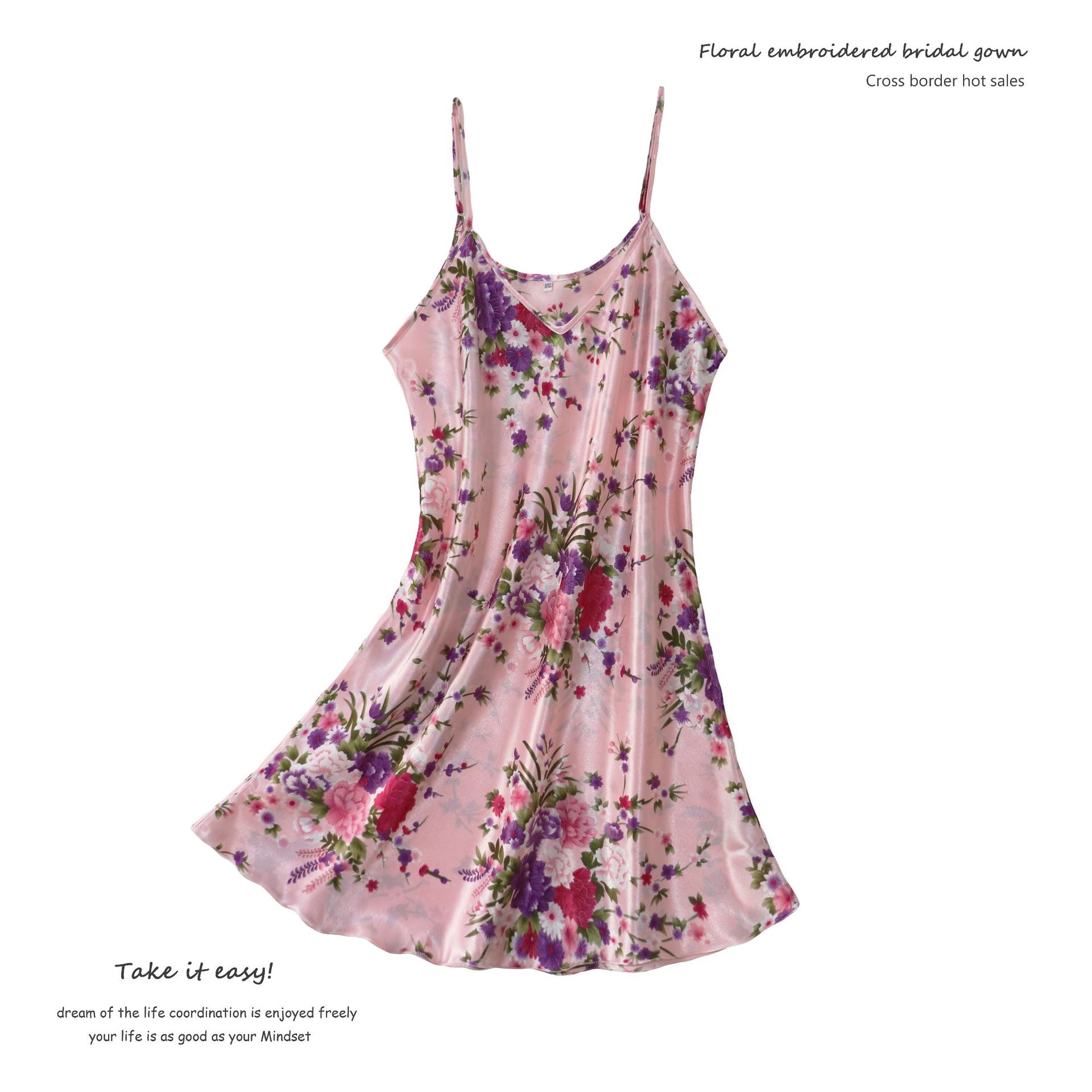2024 새로운 도착 잠옷 여성의 여름 얇은 인공 실크 슬링 나이트 가운 외부 착용 대형 슬리밍 인쇄 홈 옷스토어 가기