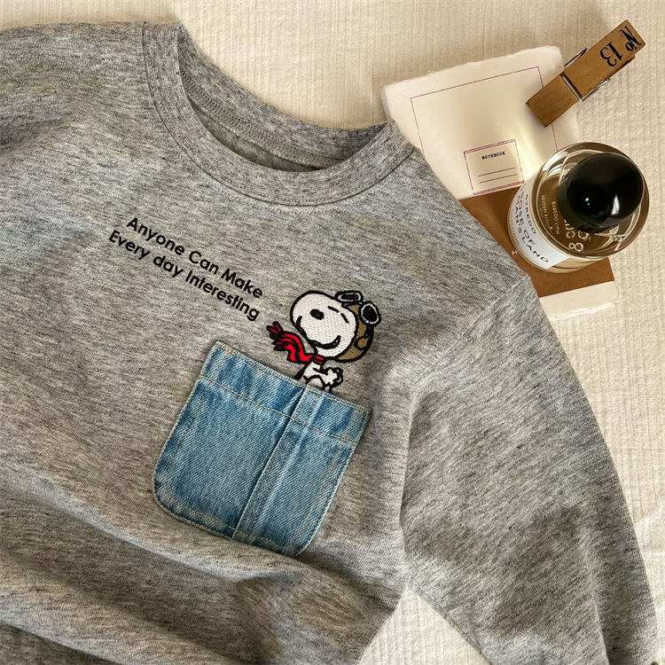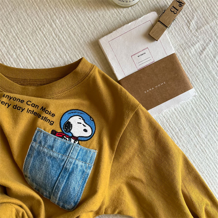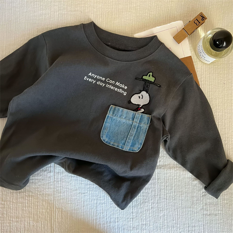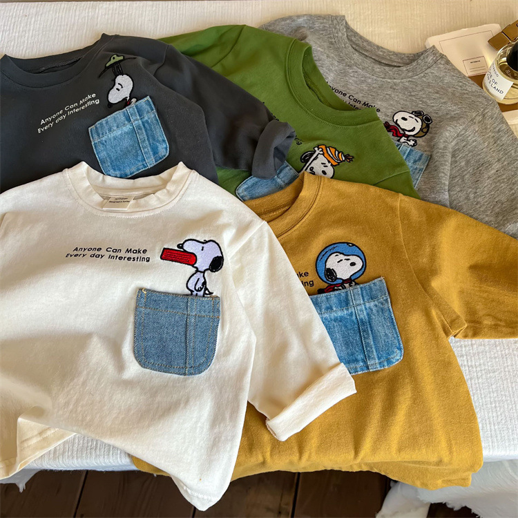 만화 아동복 어린이 간단한 티셔츠 긴 소매 2023 소년 소녀 봄 새로운 포켓 아기 만화 최고 유행