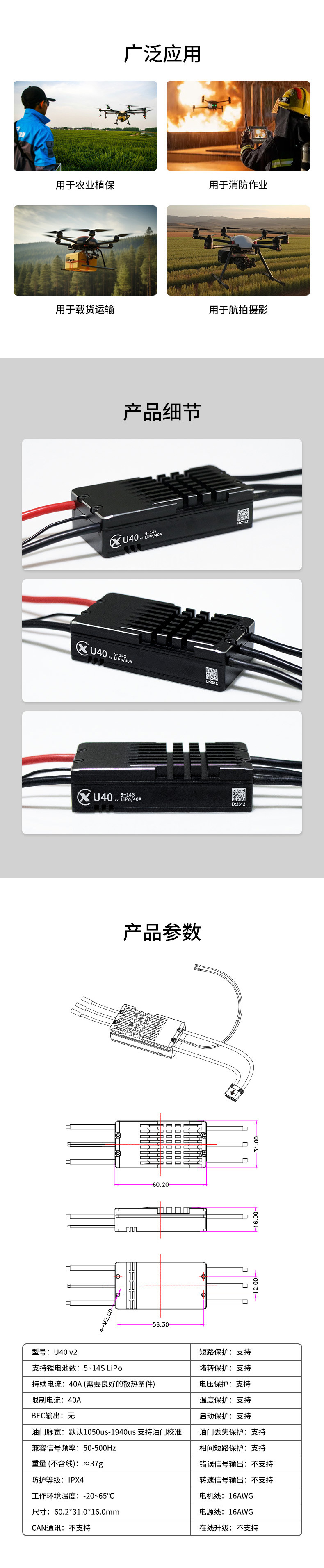 Xiongcai U40 UAV ESC 멀티 로터 고정 날개 수직 이륙 및 착륙 UAV 14S/40A 브러시리스 ESC