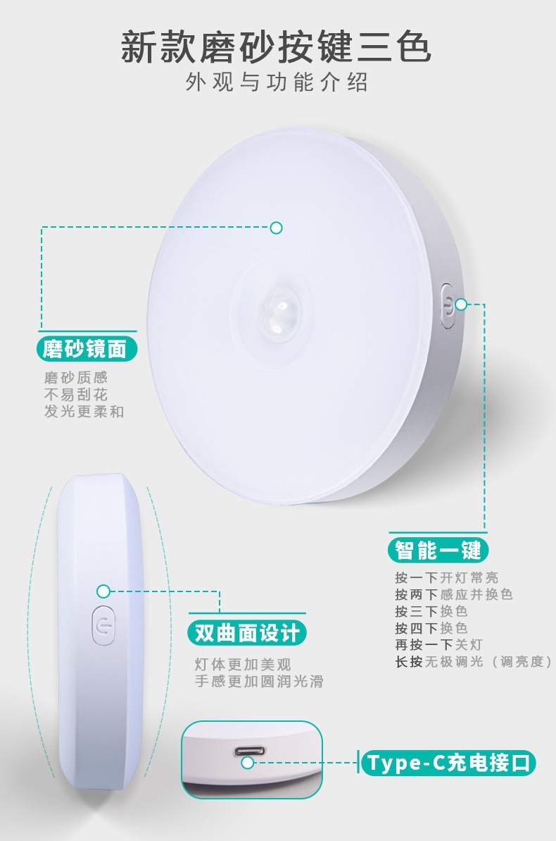 • 새로운 프로스트 버튼 Type-c 충전 포트 무단 디밍-ABS 소재 중성 빛 항상 밝은 인체 유도 (흰색 빛 따뜻한 빛 중립 빛)