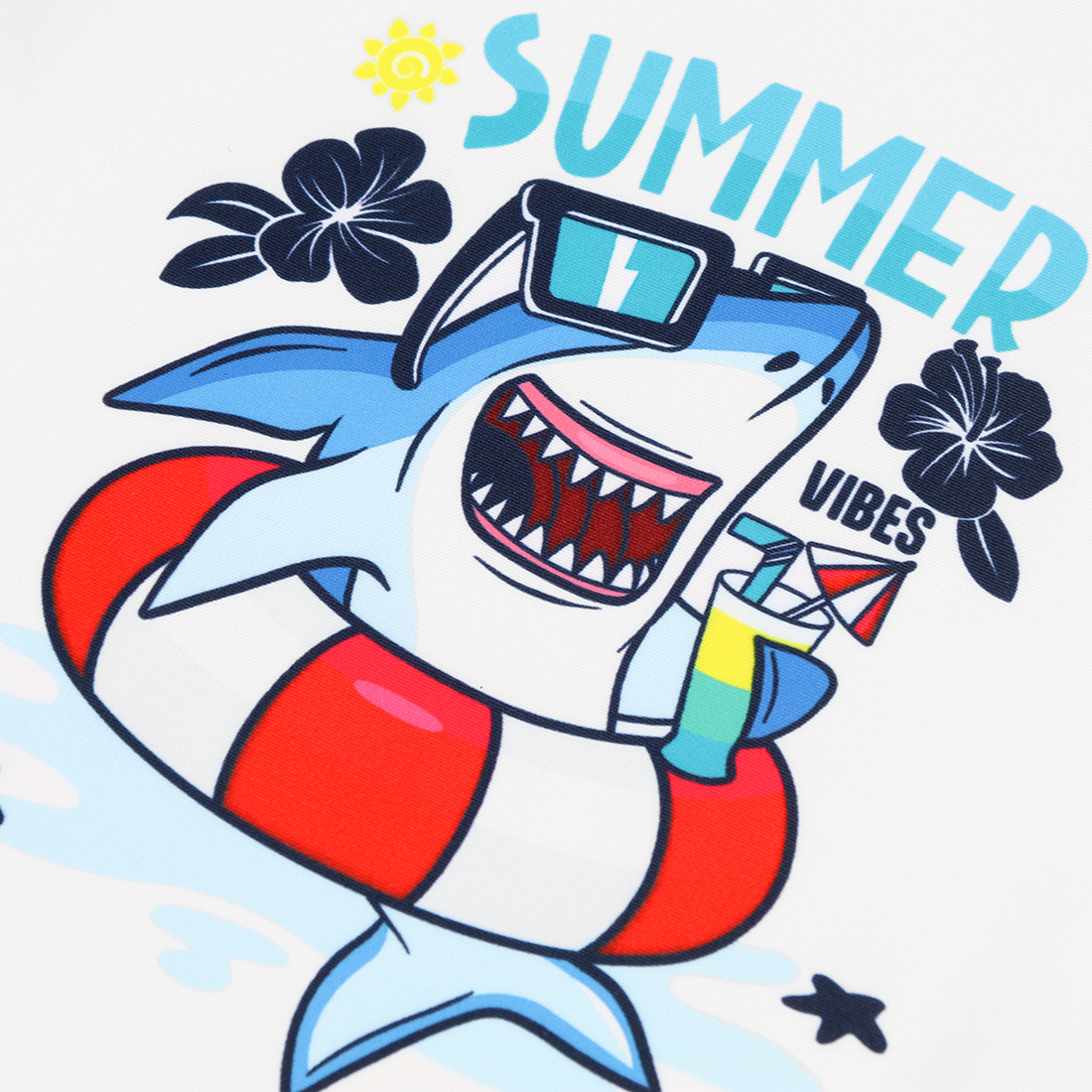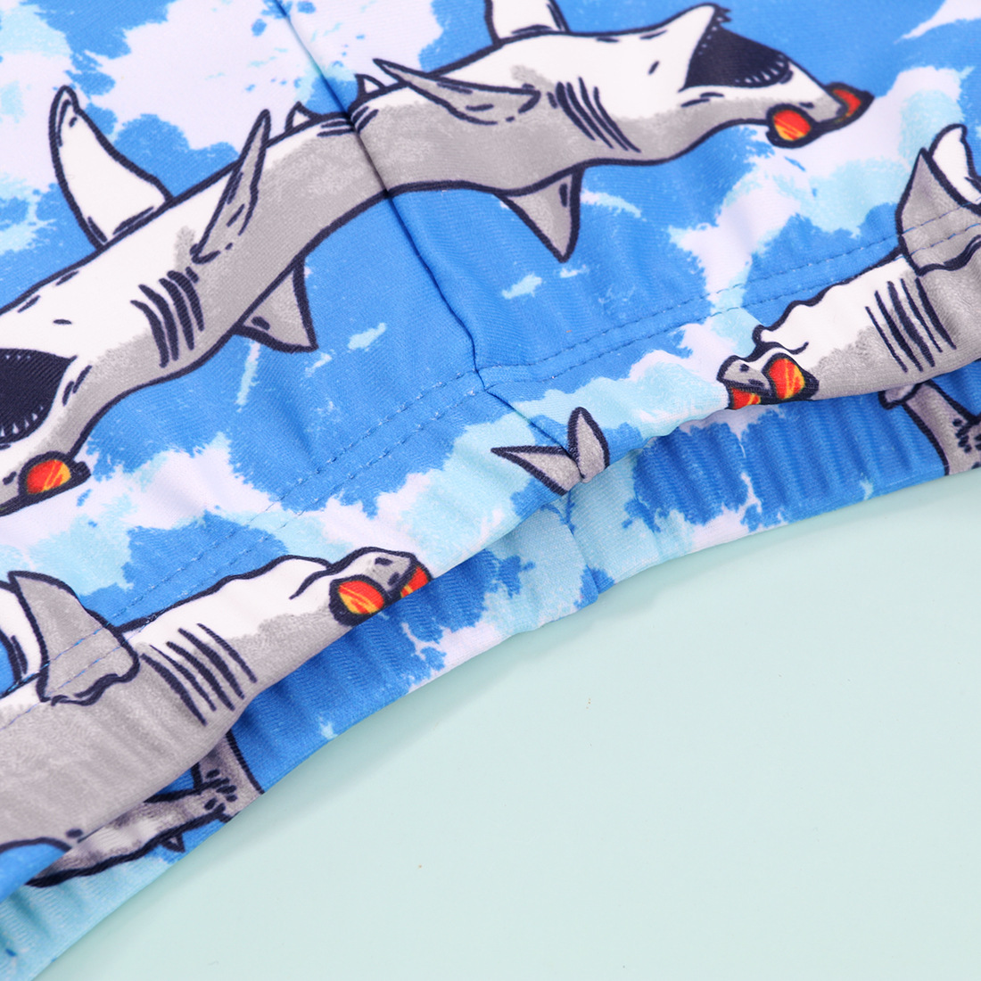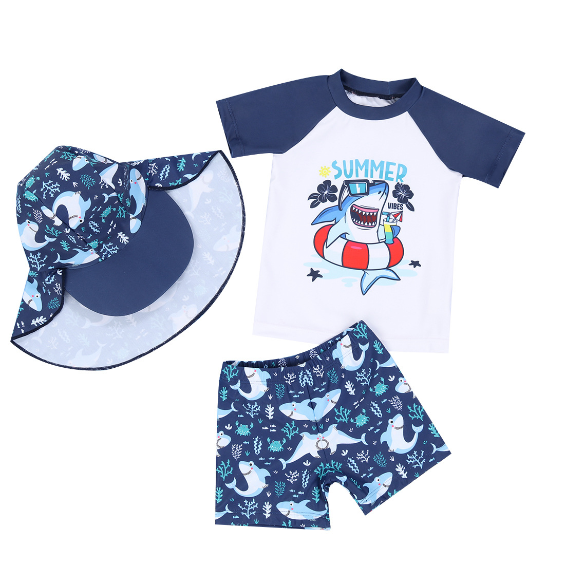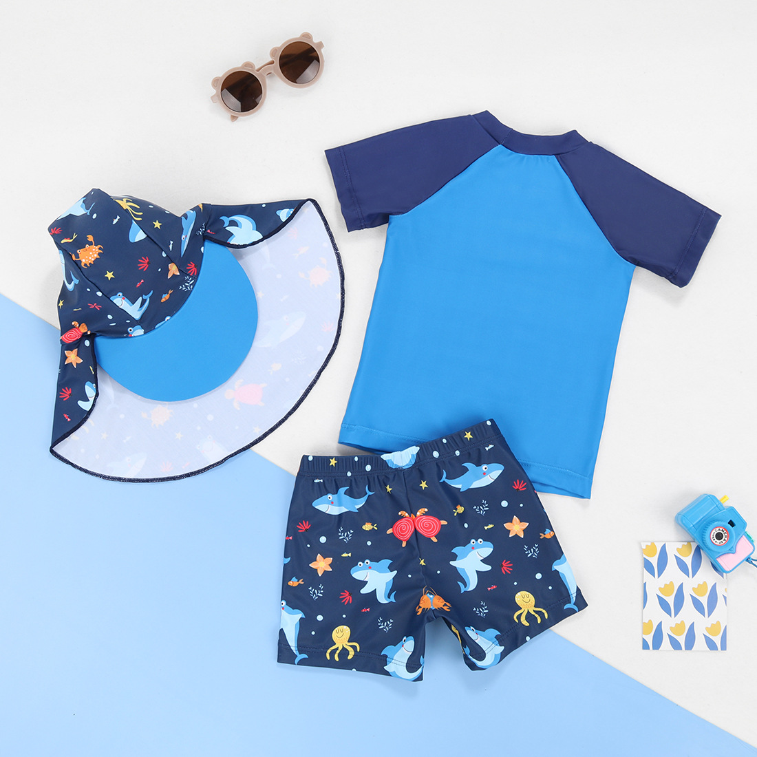 어린이 수영복 남아 수영복 분리형 반팔 반바지 사각형 모자 자외선 차단 라운드넥 만화 상어 어린이용