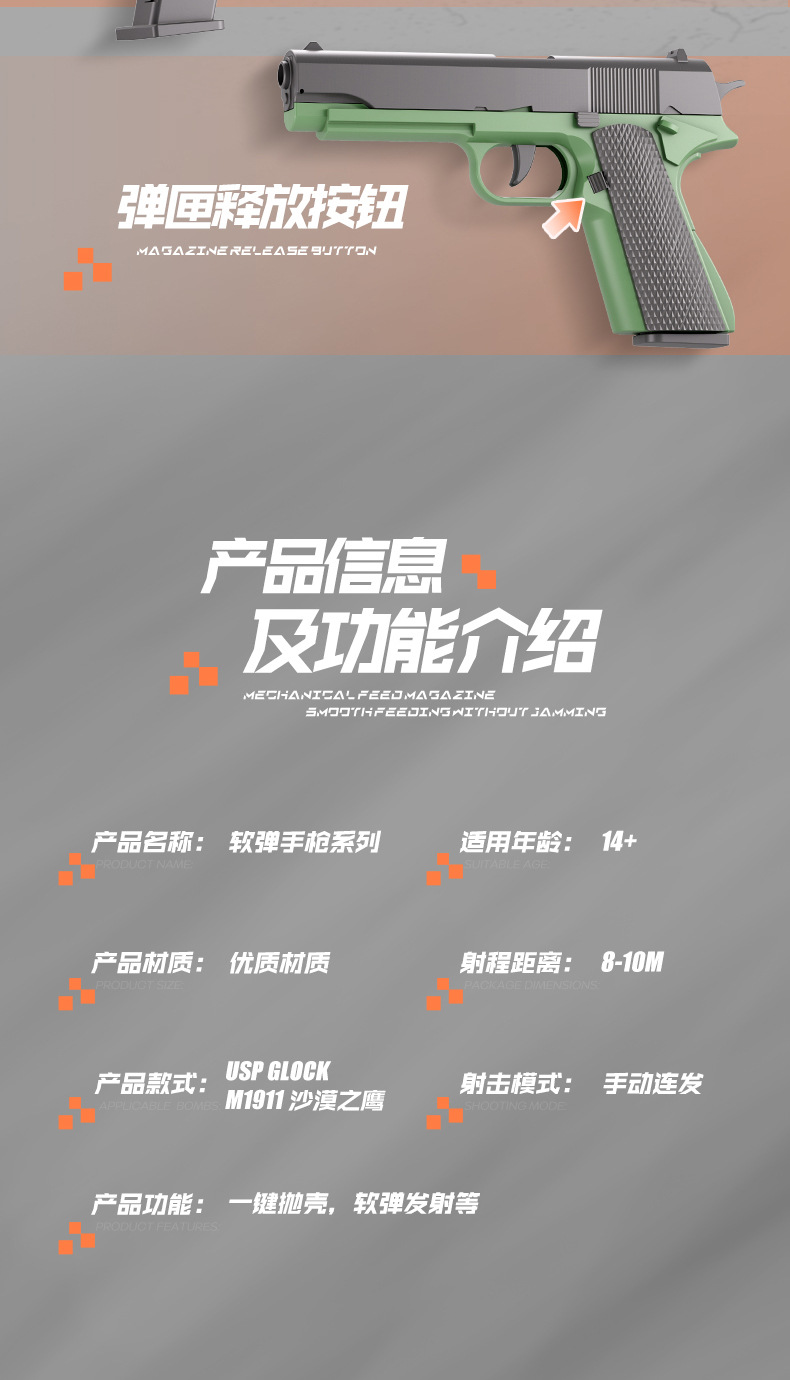 명장당 장난감 총 USP 탄창 1911 기계식 배출식 글록 교육용 모형 총 권총 연사 리피터