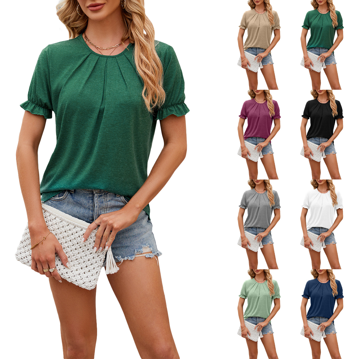 아마존 2024 유럽과 미국의 국경 대외 무역 봄과 여름 새로운 단색 둥근 목 느슨한 짧은 소매 티셔츠 탑