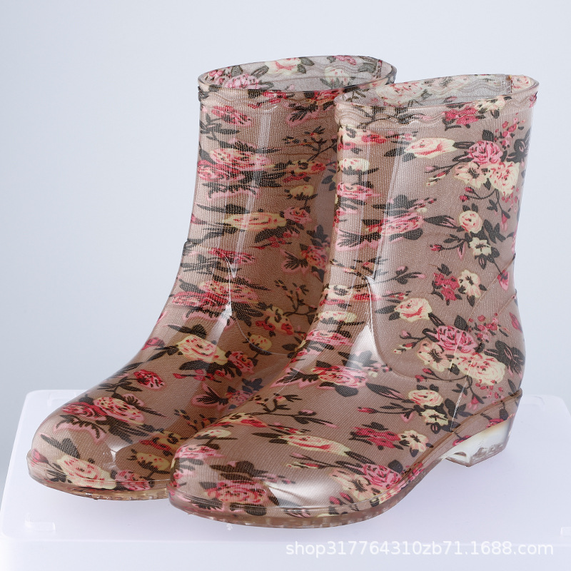 중저 튜브 장화 여성의 짧은 튜브 장화 반 튜브 워터 부츠 꽃 천 성인면 벨벳 방비 방수 고무 신발