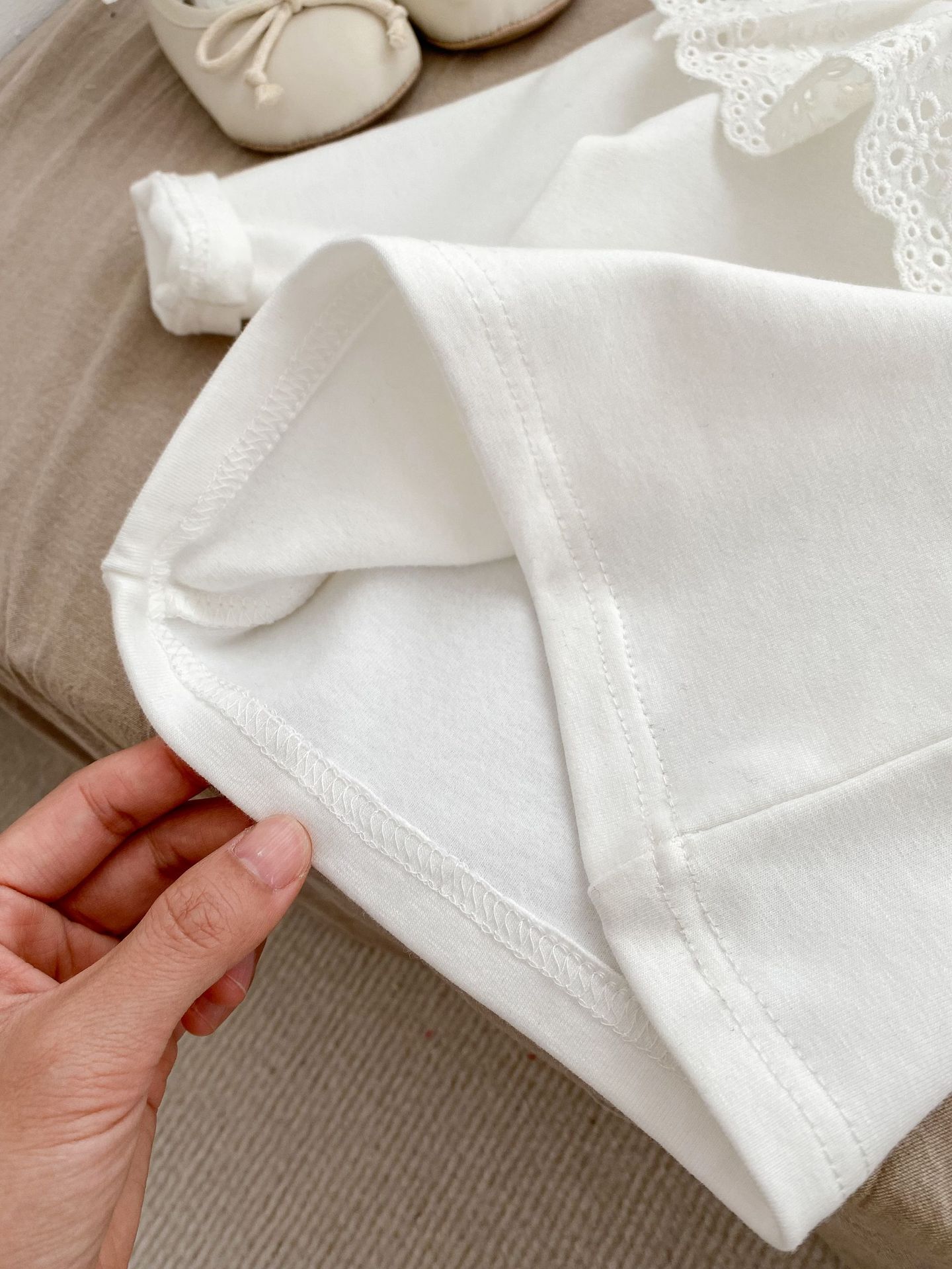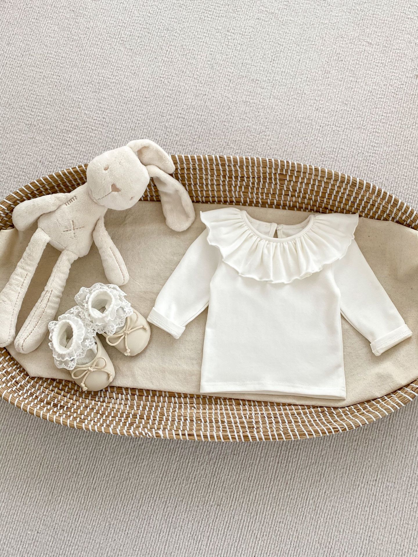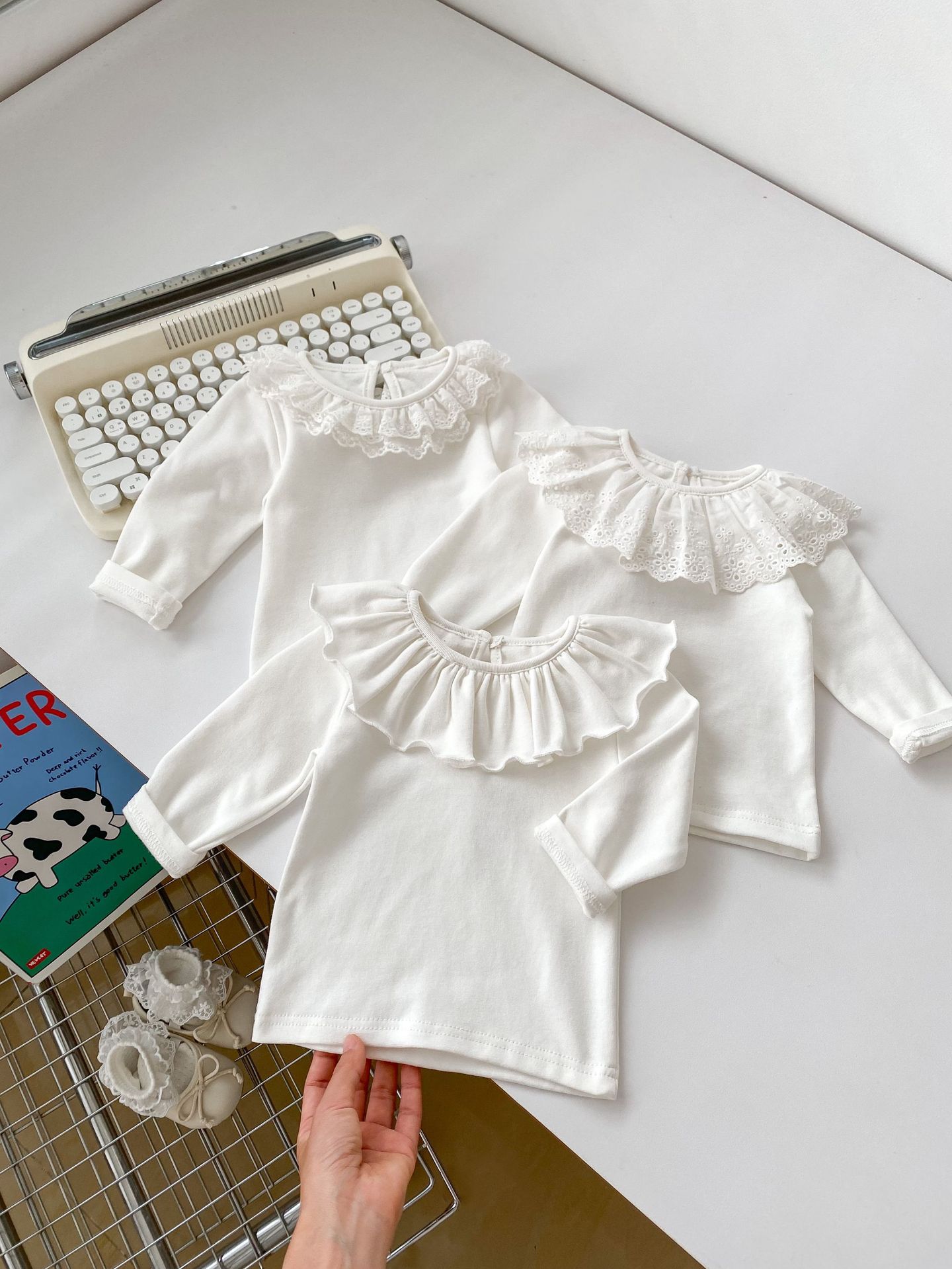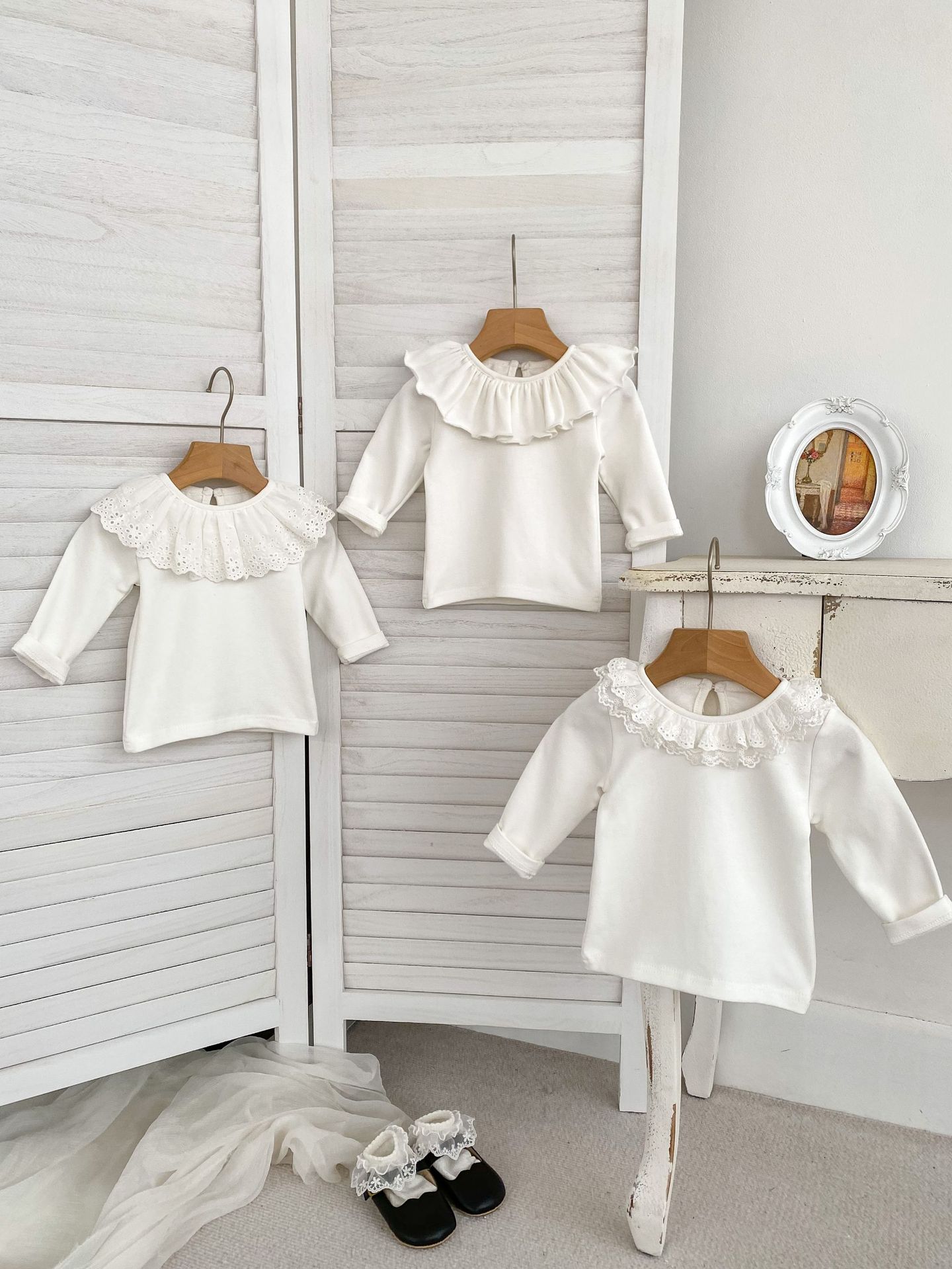 봄 2024 새로운 아기 다목적 레이스 칼라 바닥 셔츠 아기 긴 소매 아기 소녀 옷 단색 탑스토어 가기