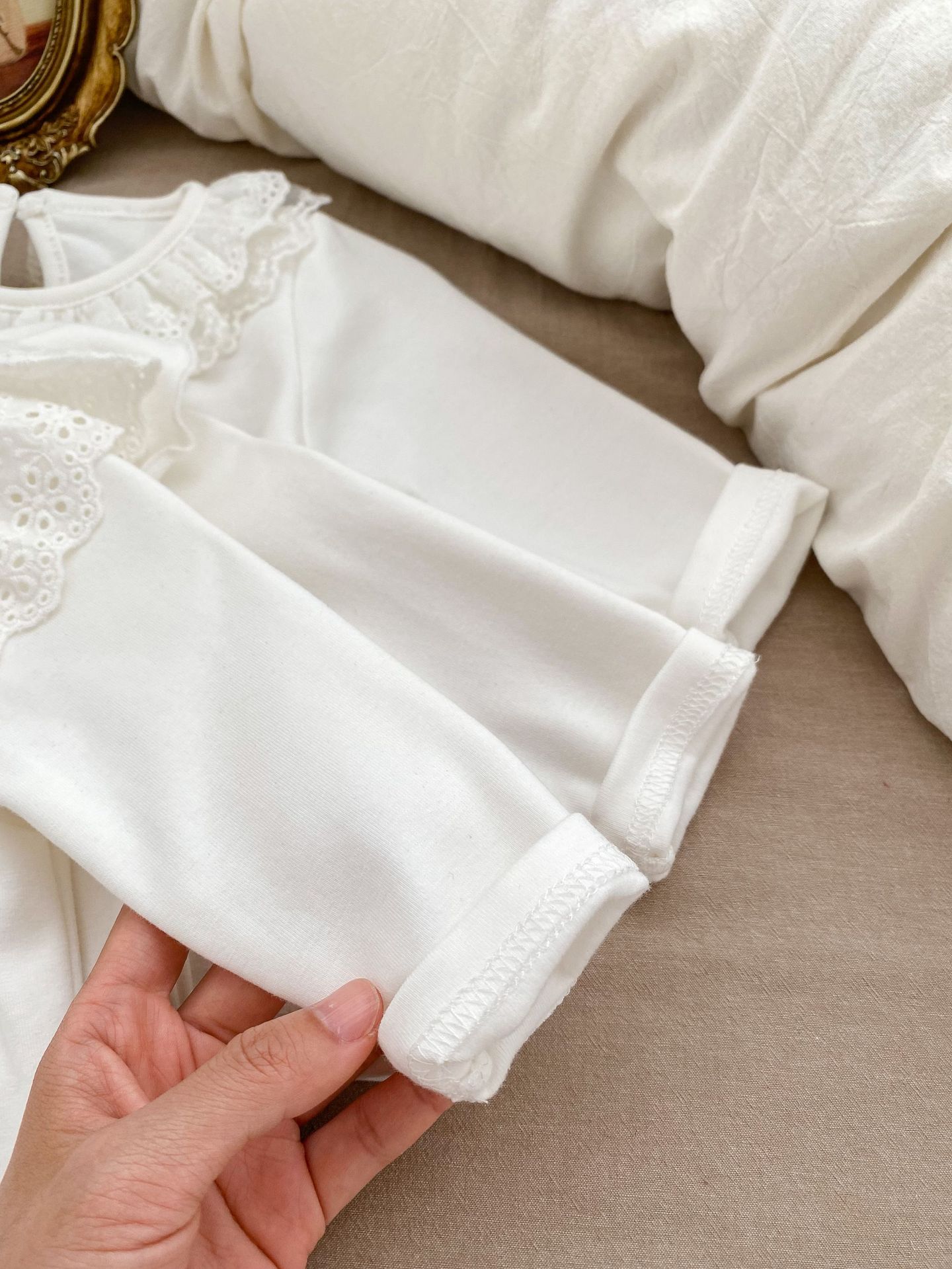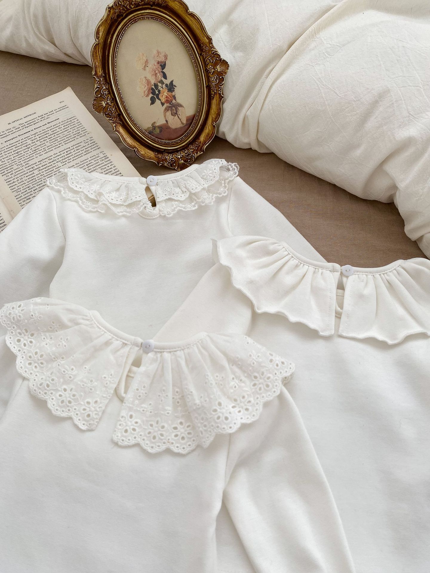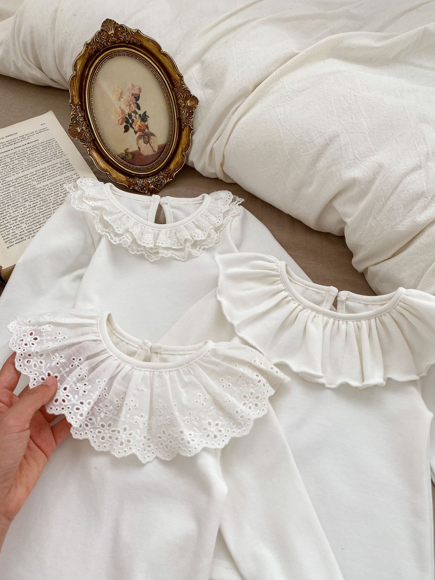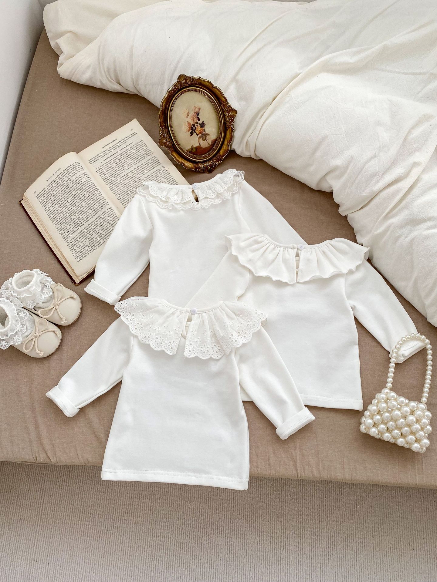 봄 2024 새로운 아기 다목적 레이스 칼라 바닥 셔츠 아기 긴 소매 아기 소녀 옷 단색 탑