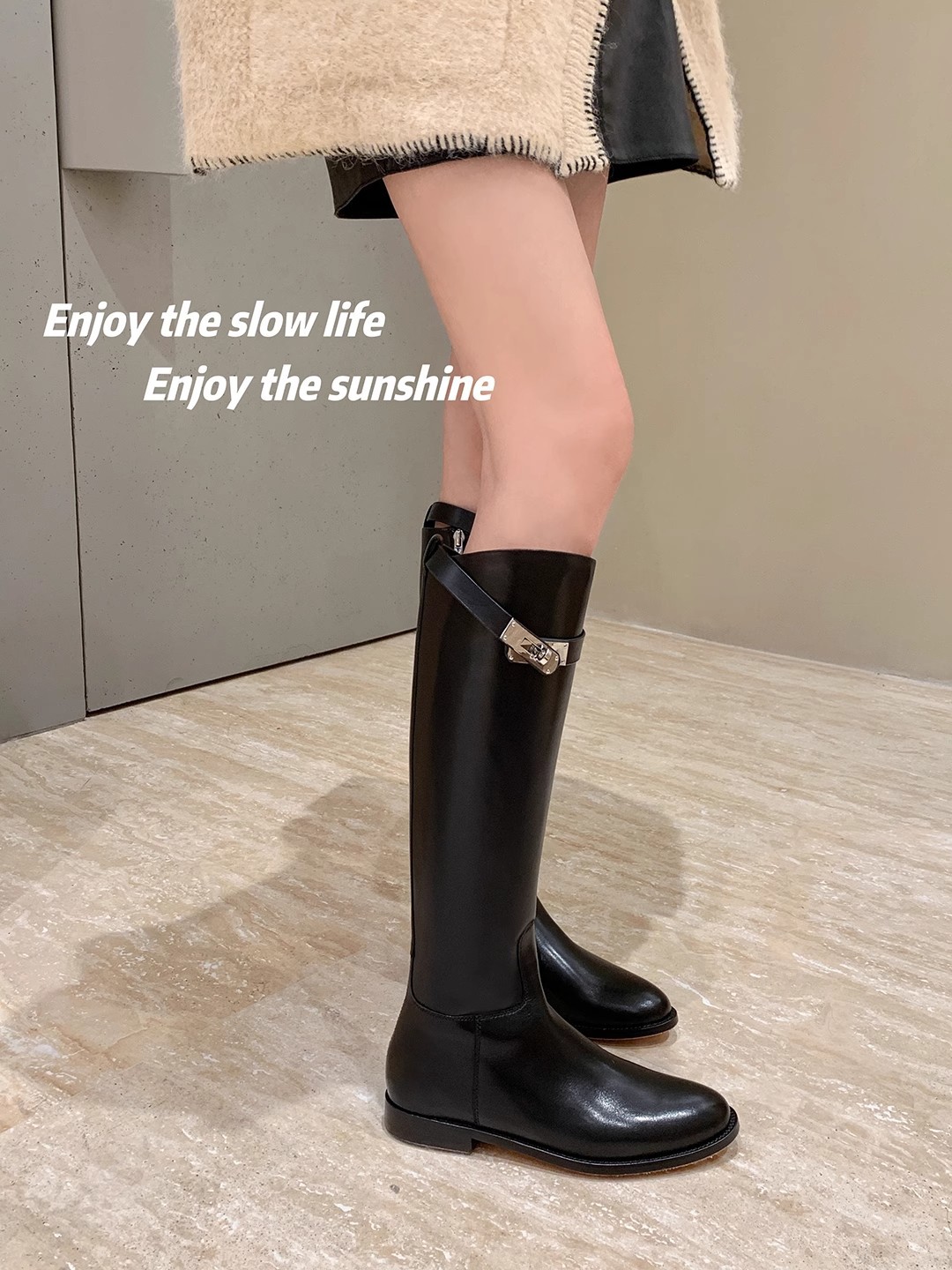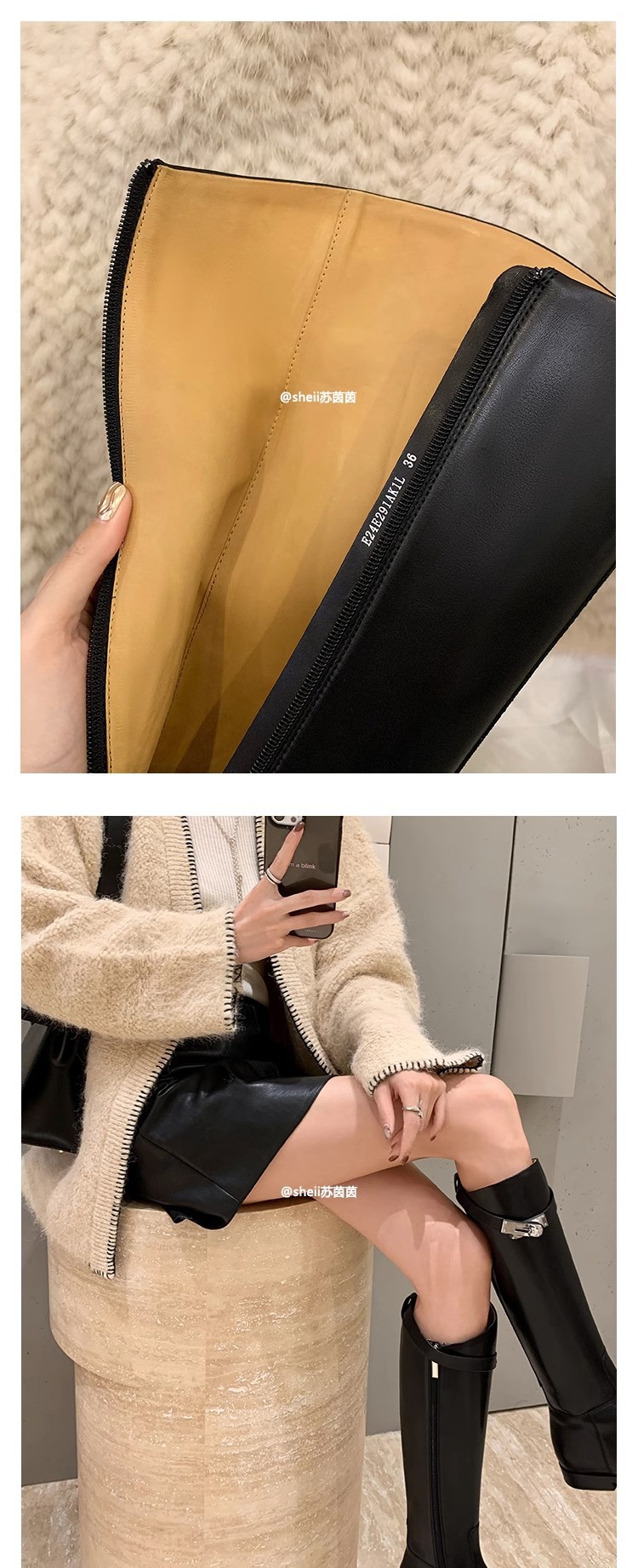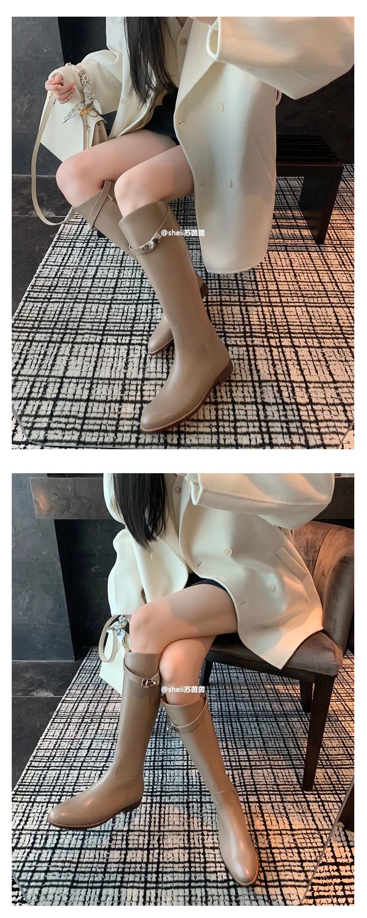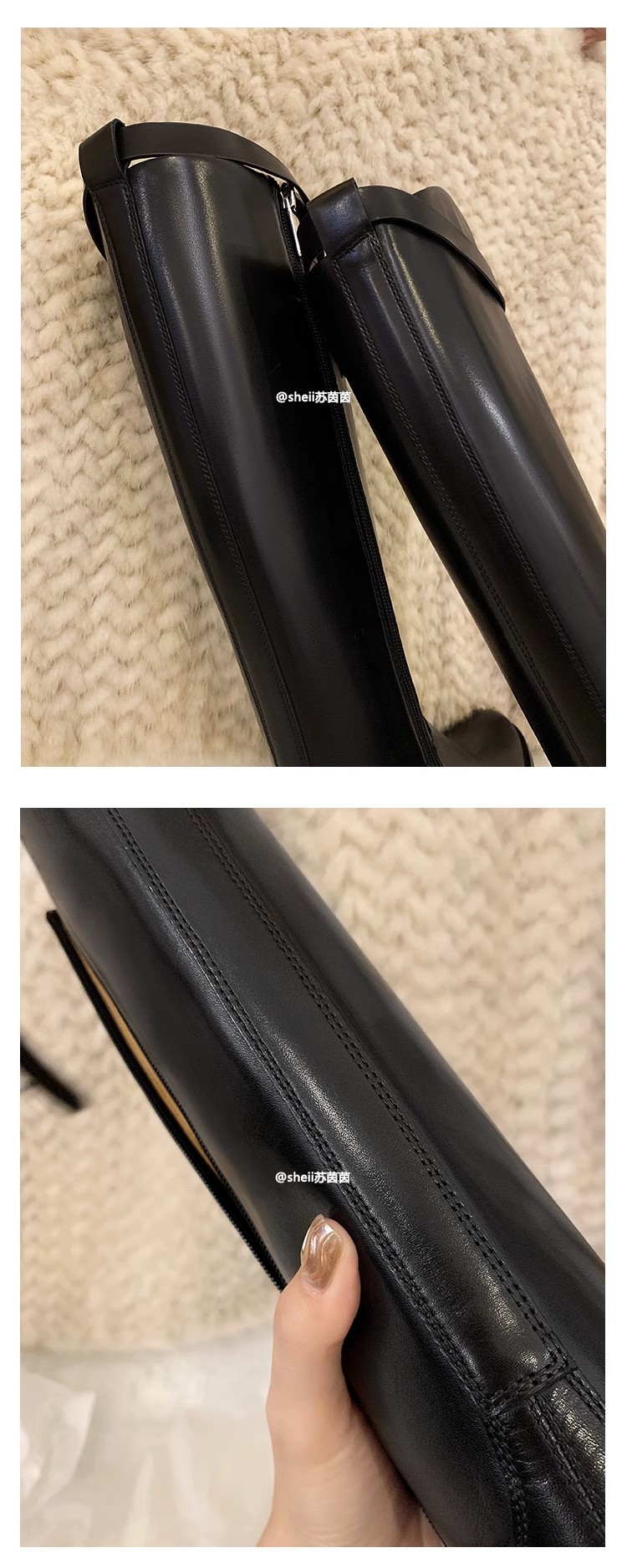 재고 즉시 배송! 봄 가을용 같은 스타일의 신발, 천연 가죽, 사선형 K* 잠금장치, 측면 지퍼, 두꺼운 굽, 여성용 롱부츠