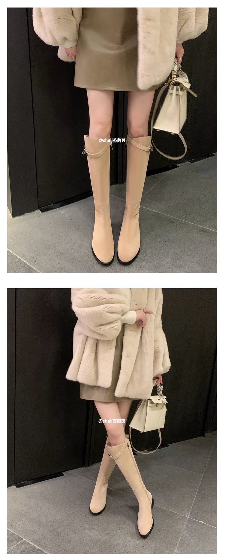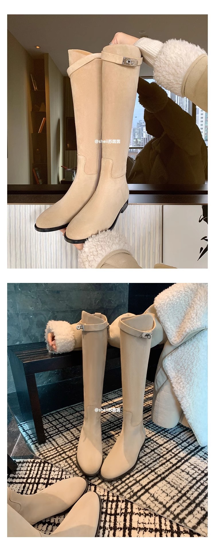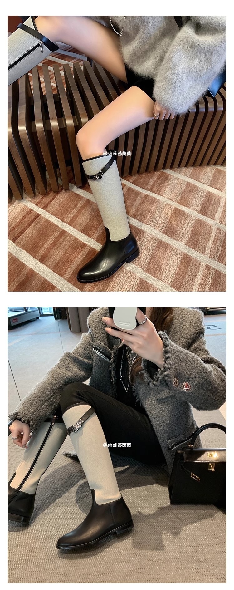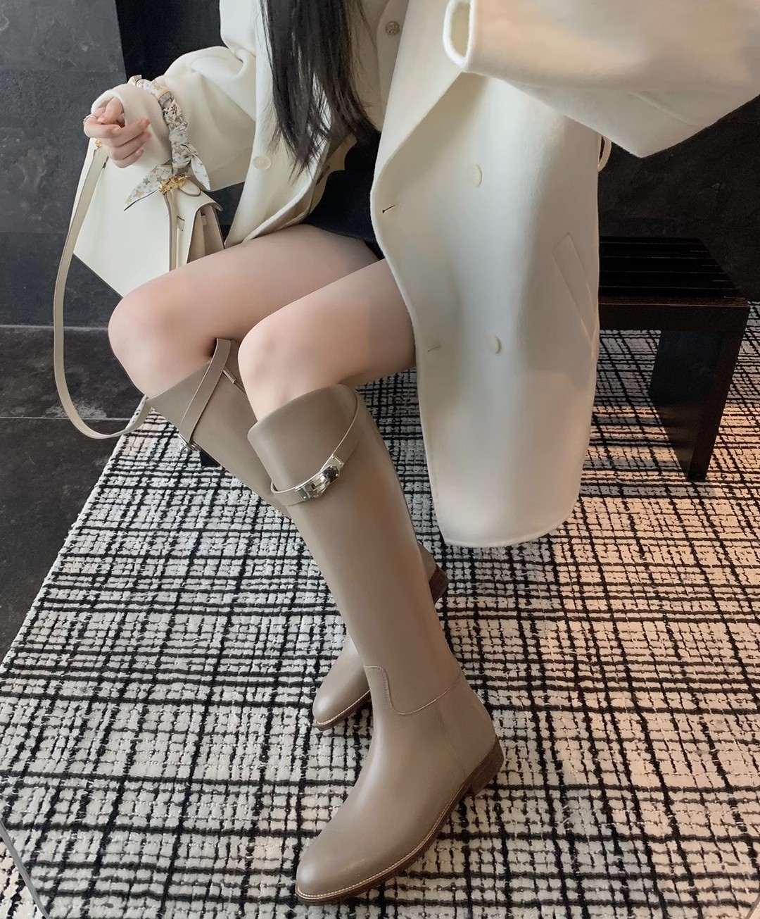재고 즉시 배송! 봄 가을용 같은 스타일의 신발, 천연 가죽, 사선형 K* 잠금장치, 측면 지퍼, 두꺼운 굽, 여성용 롱부츠