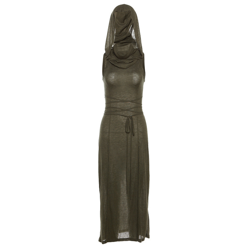 유럽과 미국의 스파이스 걸스 2023 여름 새로운 솔리드 컬러 민소매 풀오버 후드 섹시 스플릿 긴 할로우 여성 원피스스토어 가기