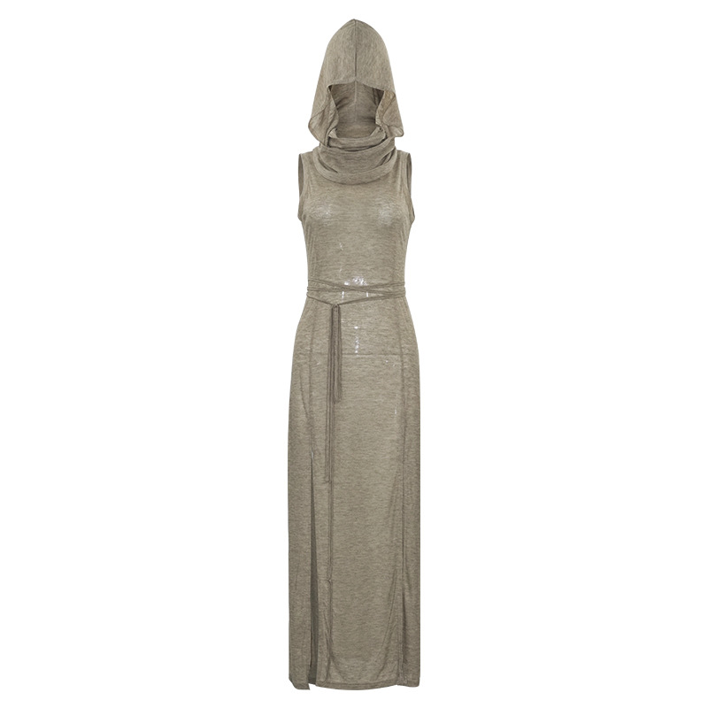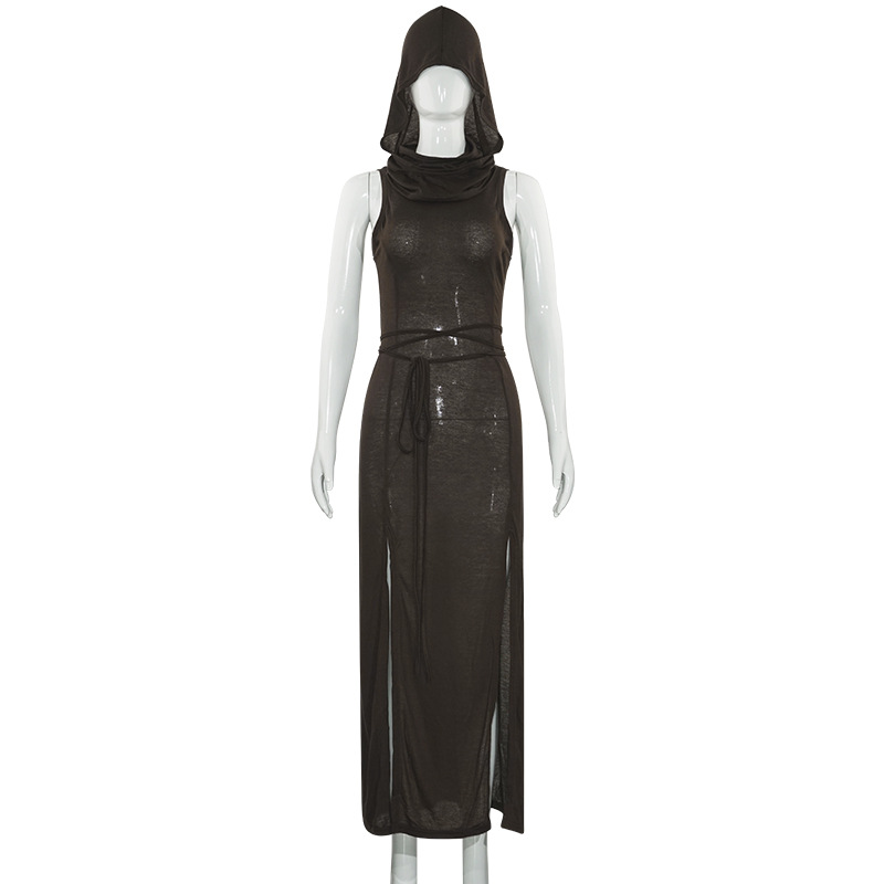 유럽과 미국의 스파이스 걸스 2023 여름 새로운 솔리드 컬러 민소매 풀오버 후드 섹시 스플릿 긴 할로우 여성 원피스