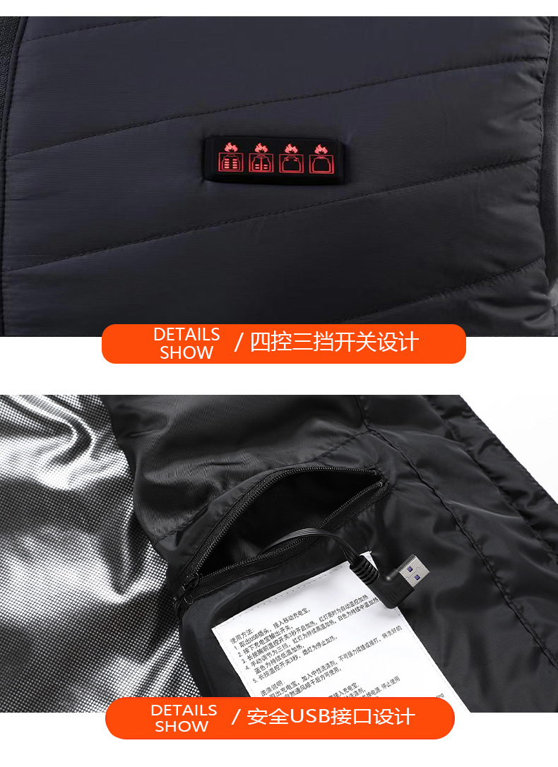 4개의 스위치로 제어되는 국경 간 인기 있는 가열 조끼, 탄소 섬유 가열 조끼, 남성과 여성이 착용할 수 있는 USB 가열 조끼스토어 가기