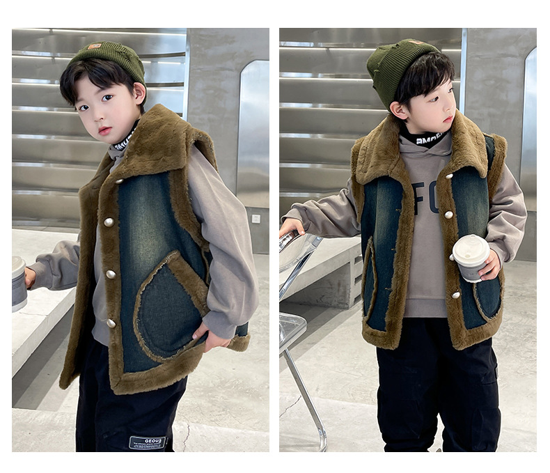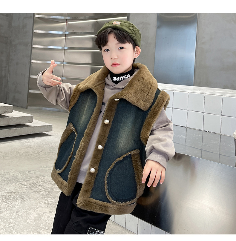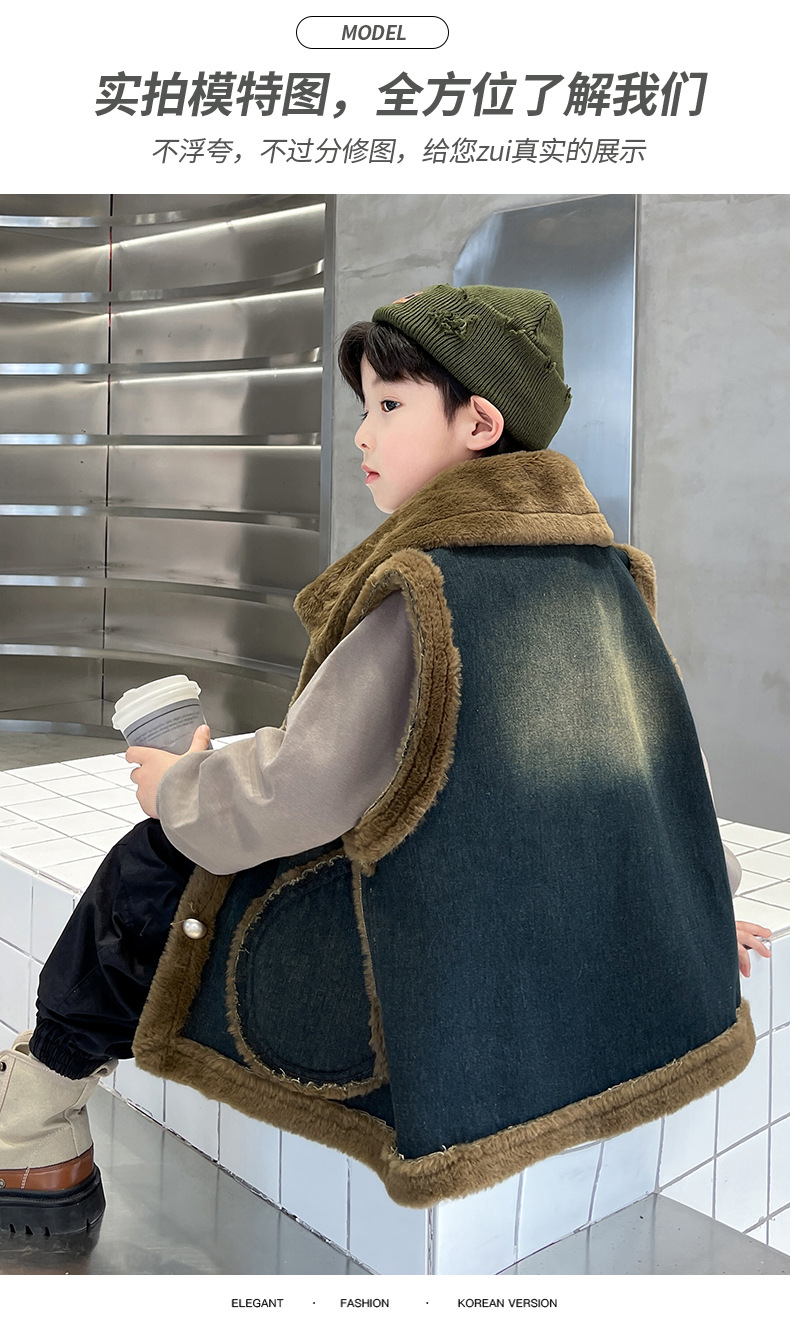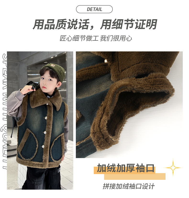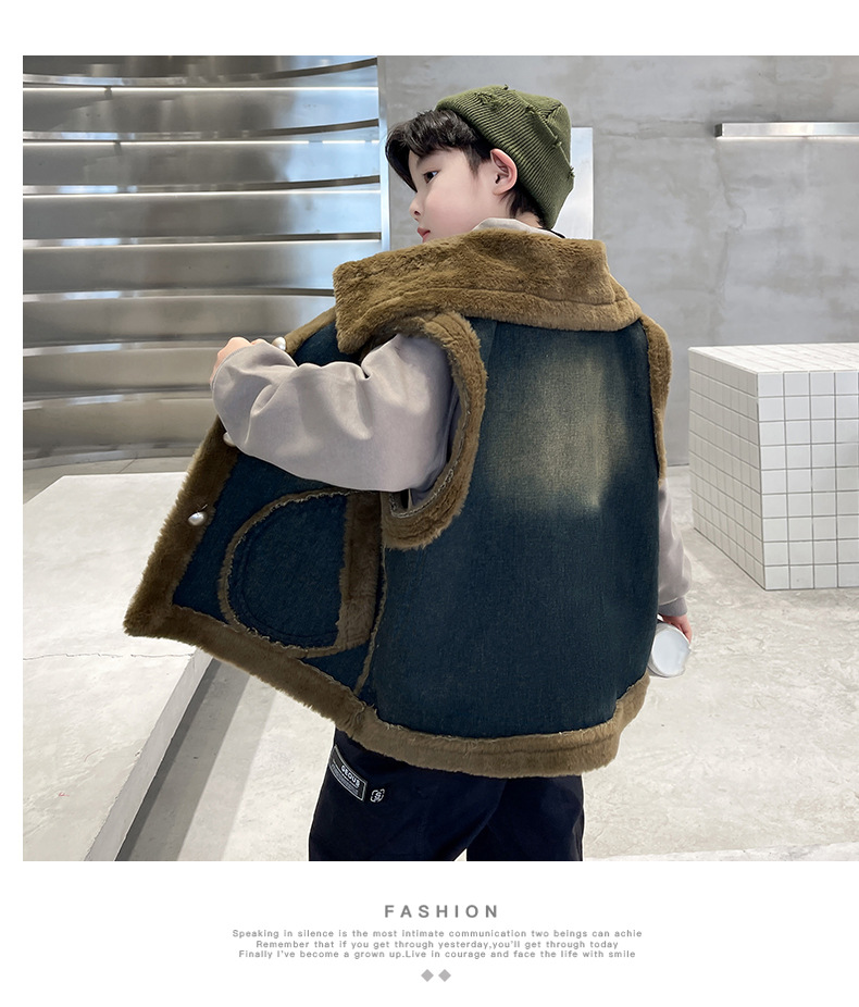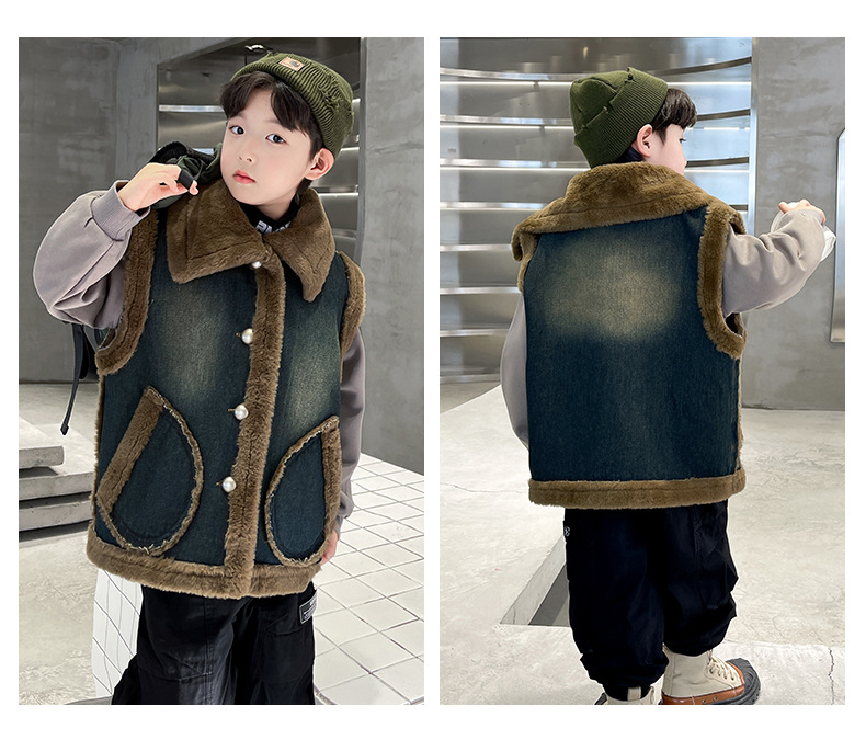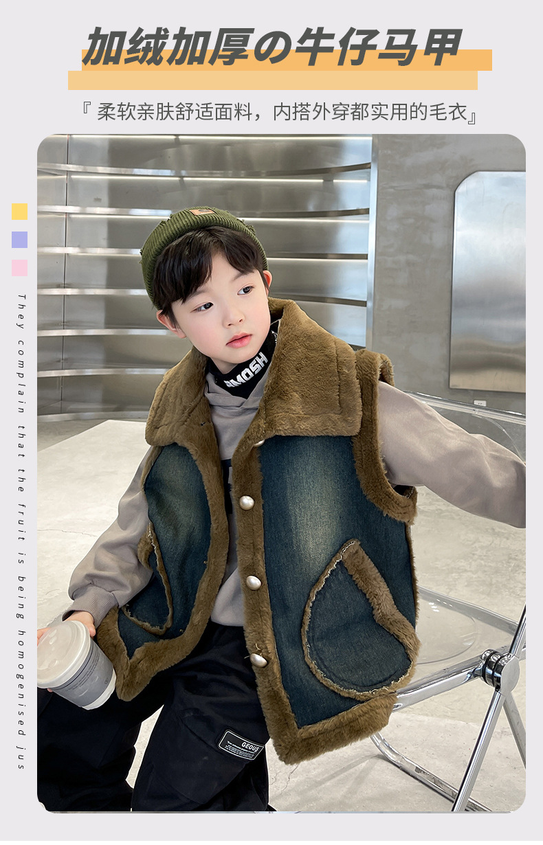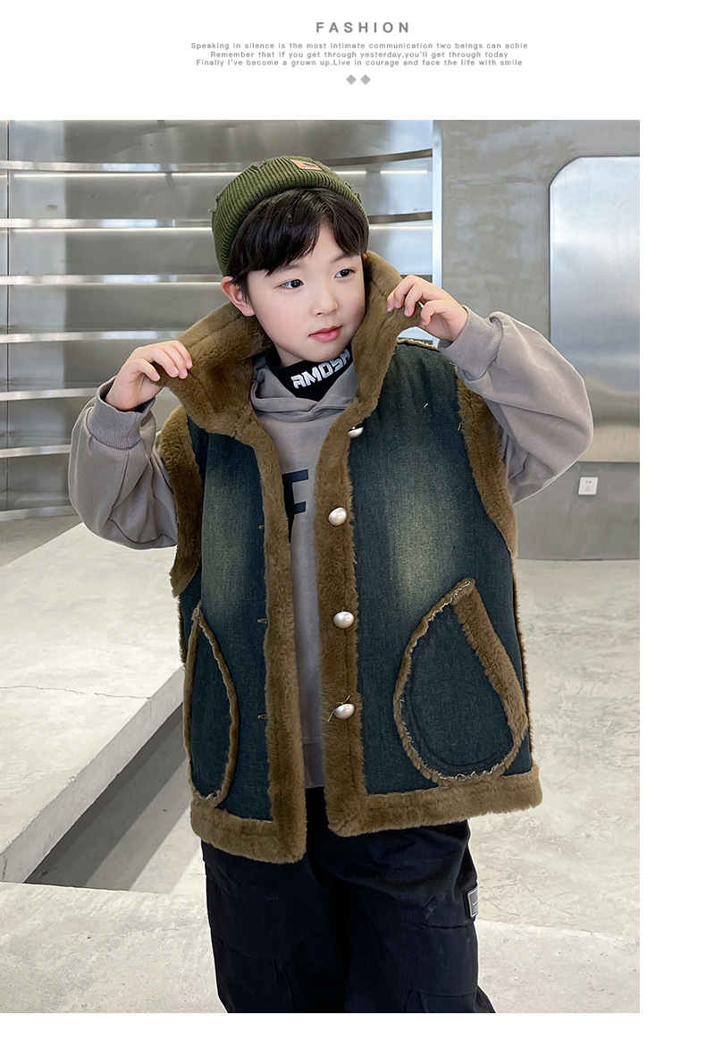 어린이 두꺼운 기모 데님 조끼 코트 겉옷 2023 겨울 소년의 새로운 미디어와 큰 아이들의 따뜻한 조끼 패션스토어 가기