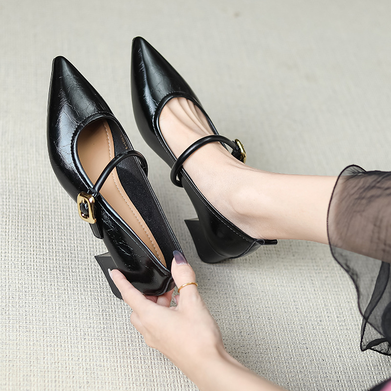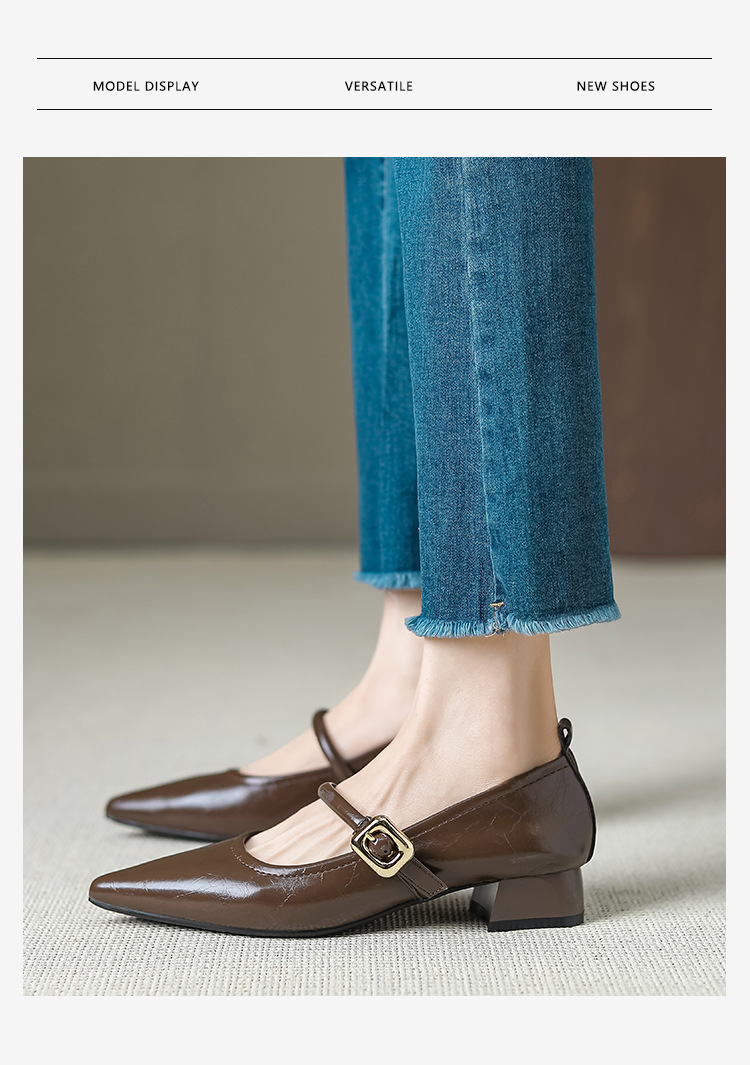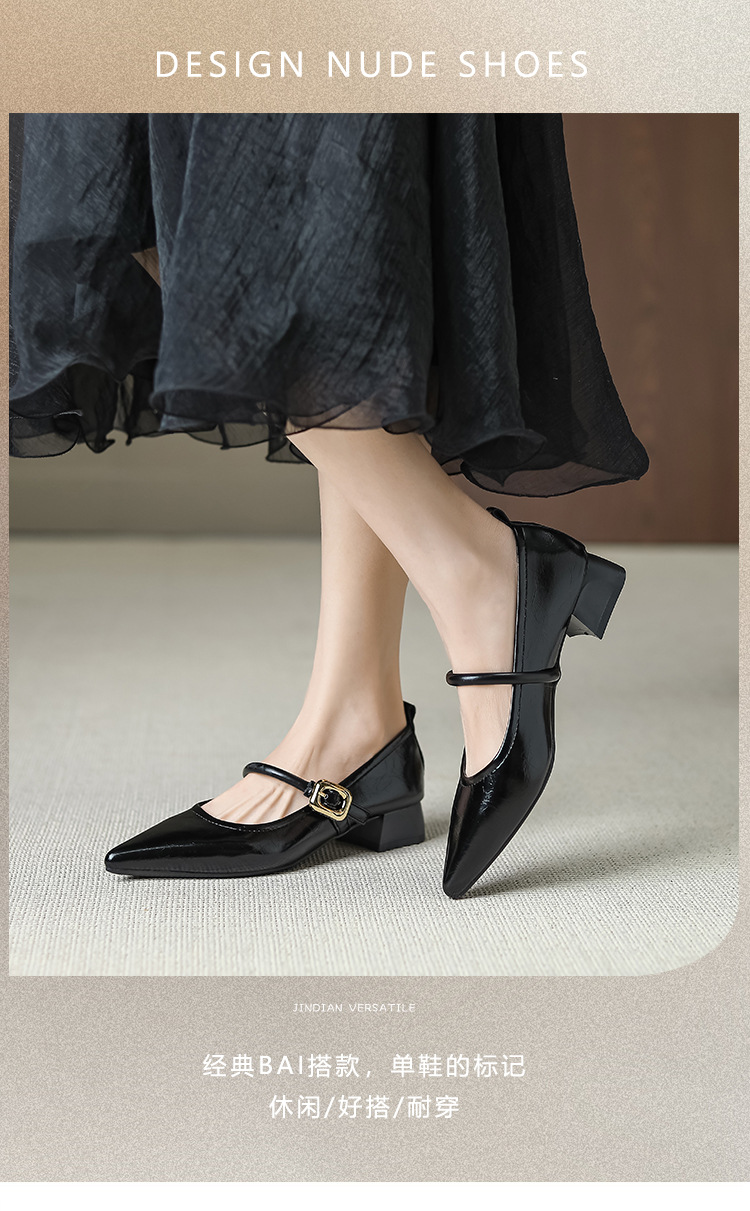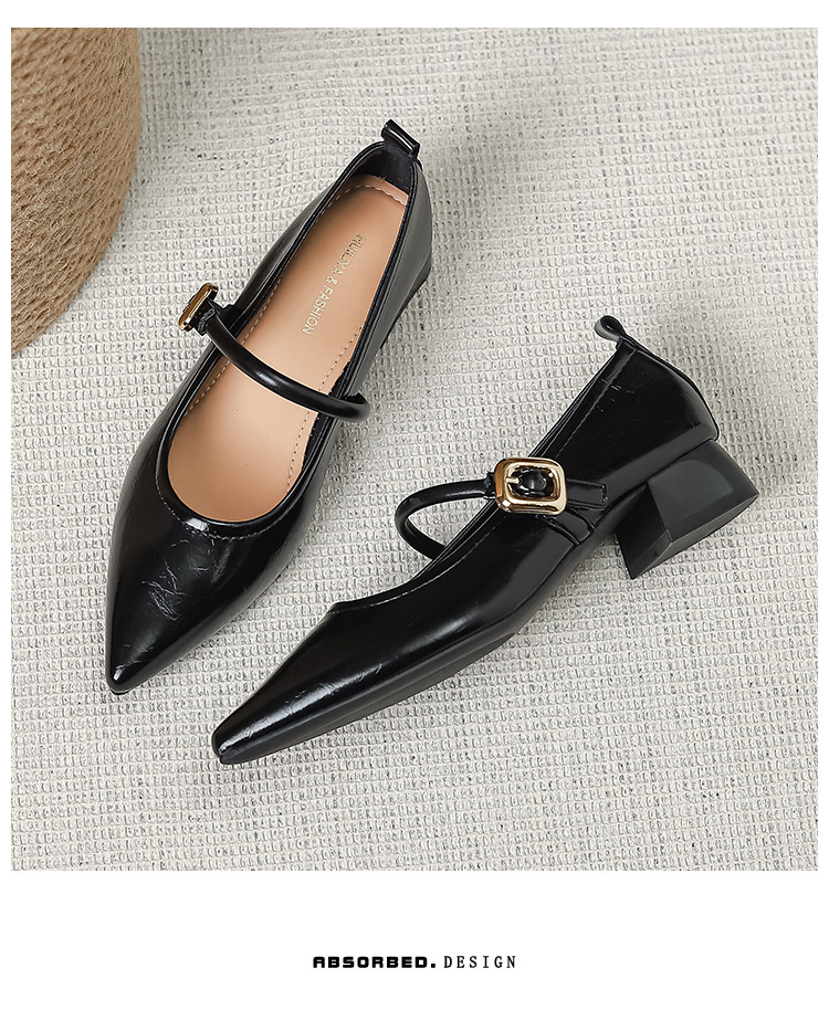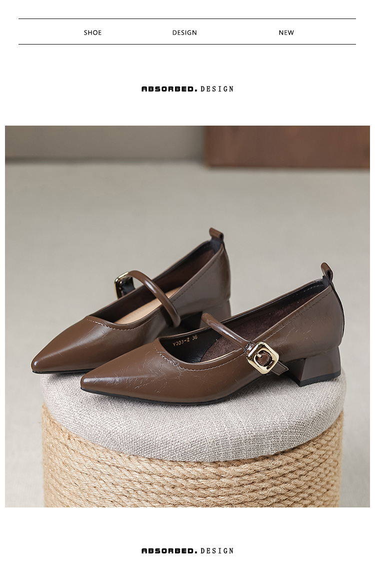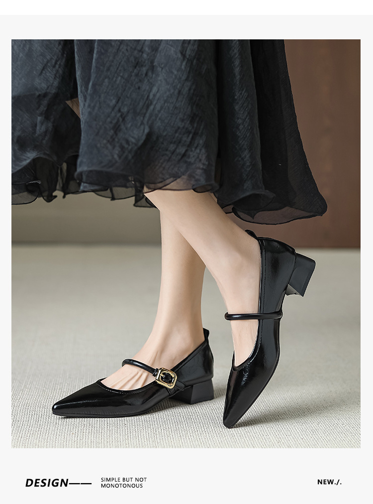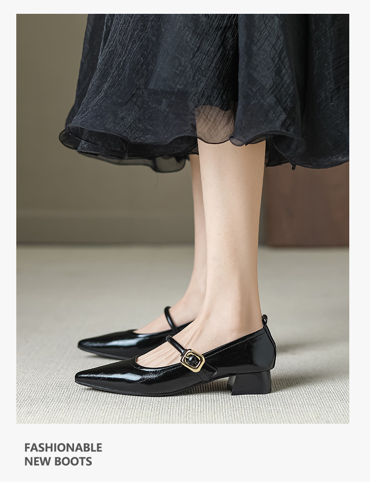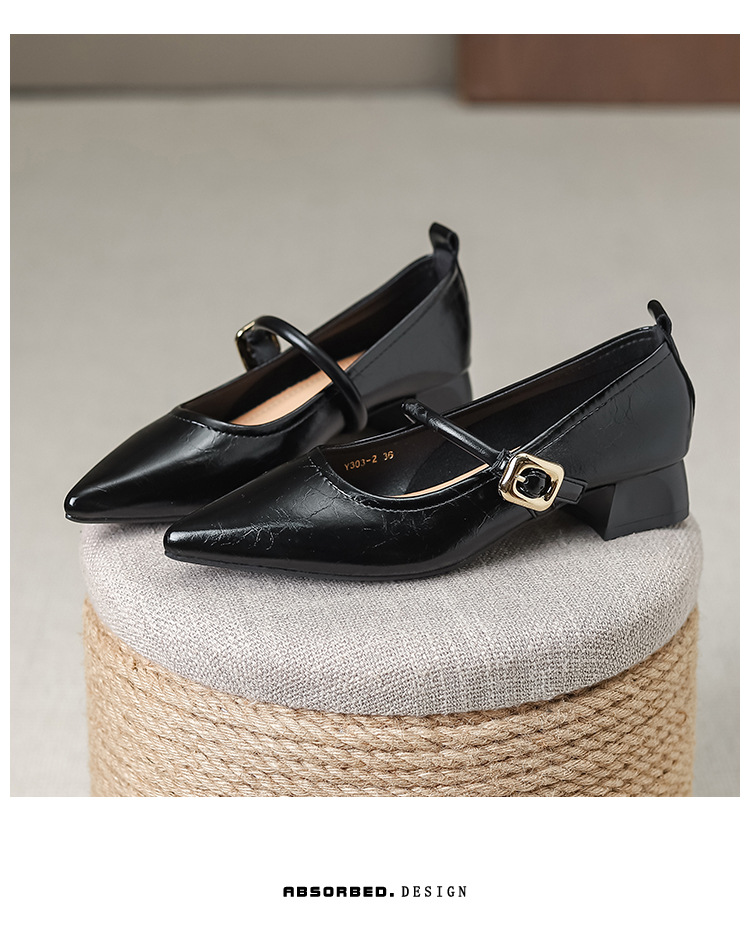 프랑스 뾰족한 발가락 신발 여성 2024 새로운 낮은 뒤꿈치 얕은 입 버클 청키 힐 메리 제인 작은 가죽 신발 Y303-2스토어 가기