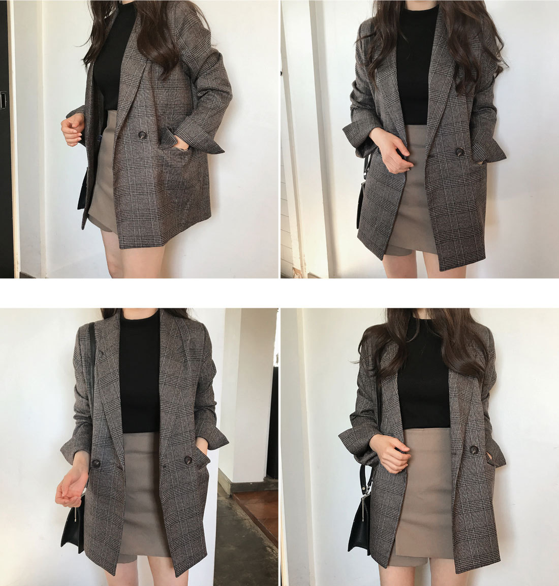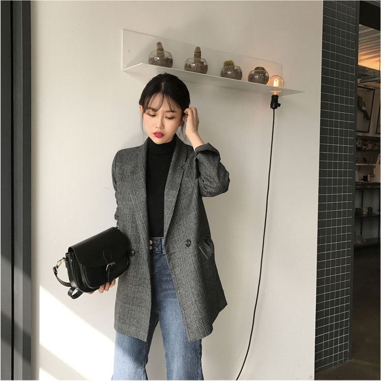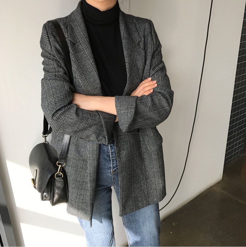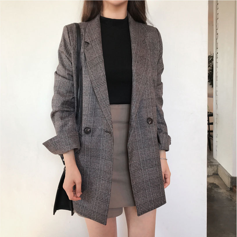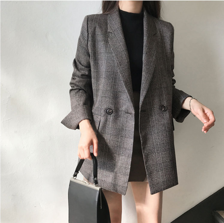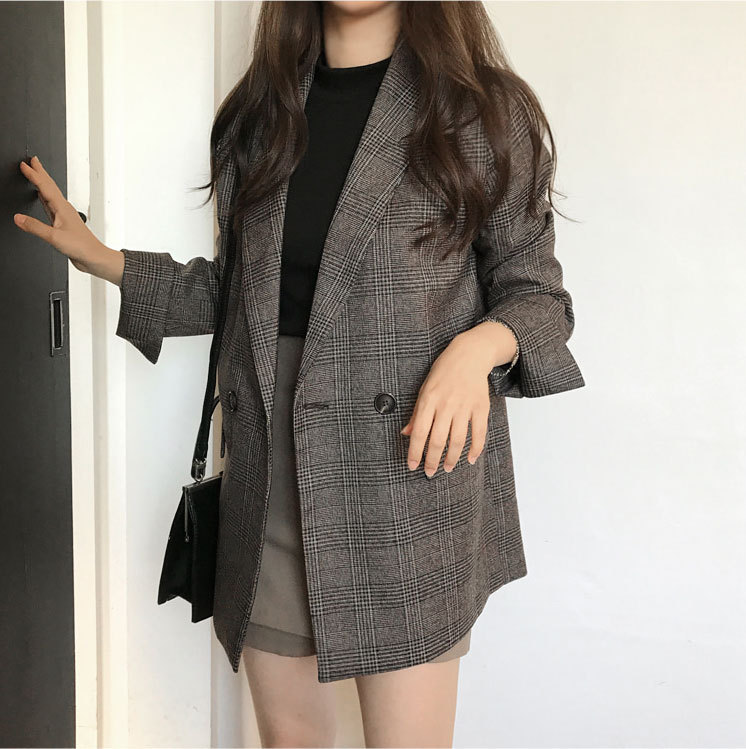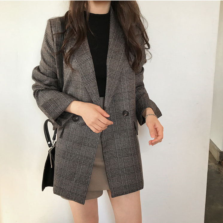 한국 세련된 가을과 겨울 간단한 빈티지 체크 옷깃 두 버클 느슨한 두 배 포켓 긴 소매 작은 세트 재킷스토어 가기
