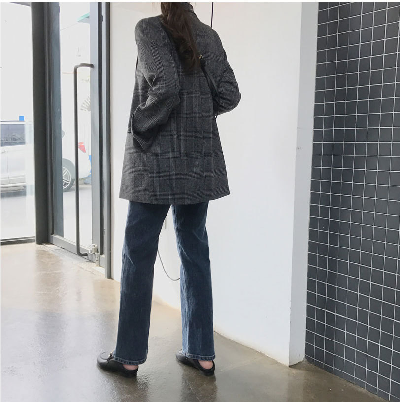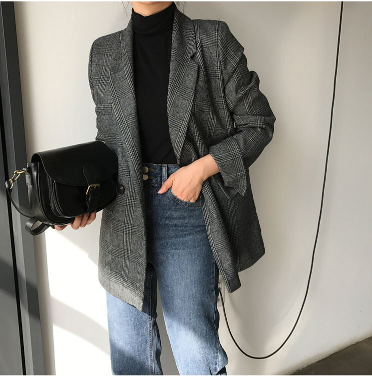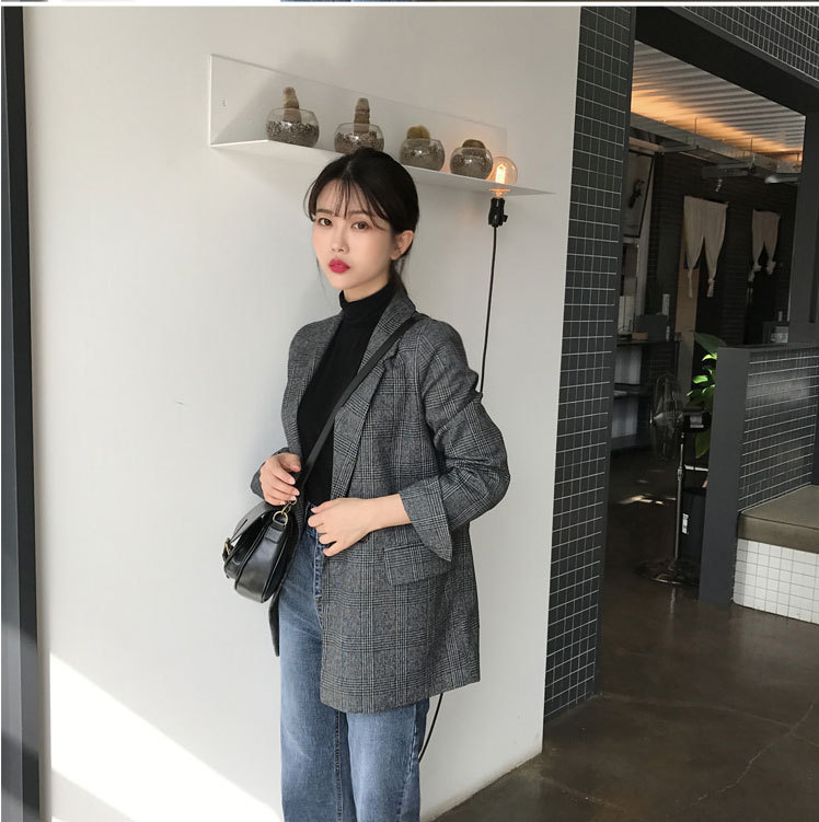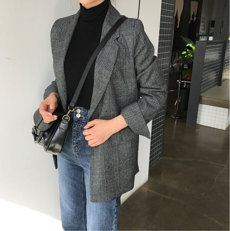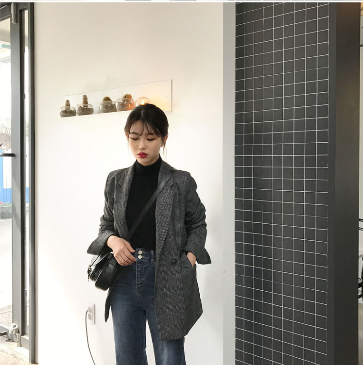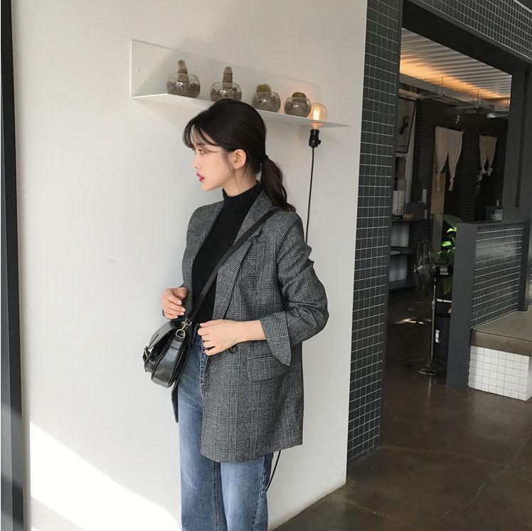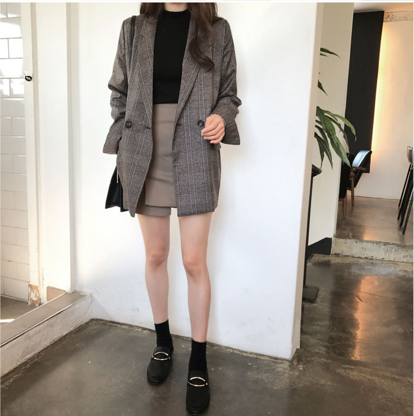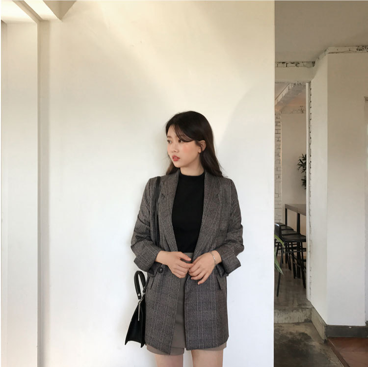 한국 세련된 가을과 겨울 간단한 빈티지 체크 옷깃 두 버클 느슨한 두 배 포켓 긴 소매 작은 세트 재킷스토어 가기