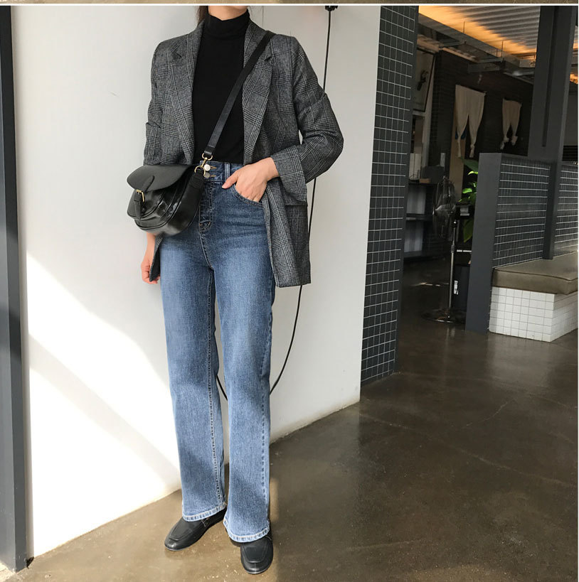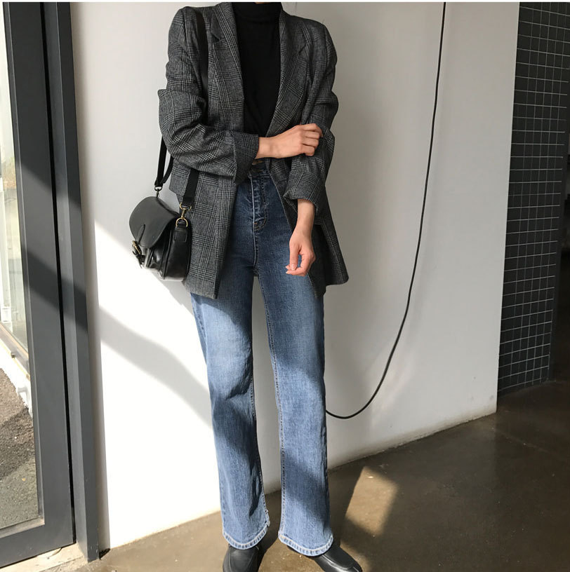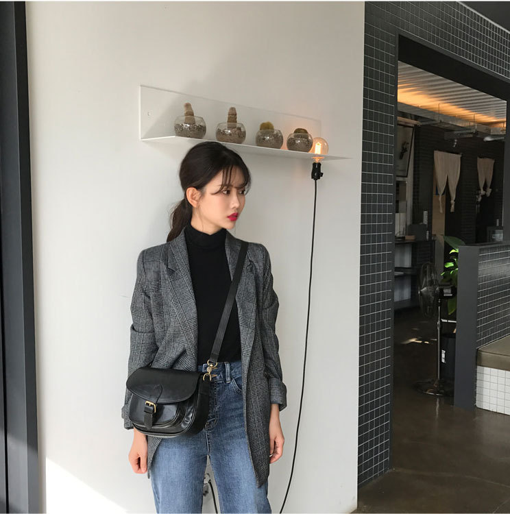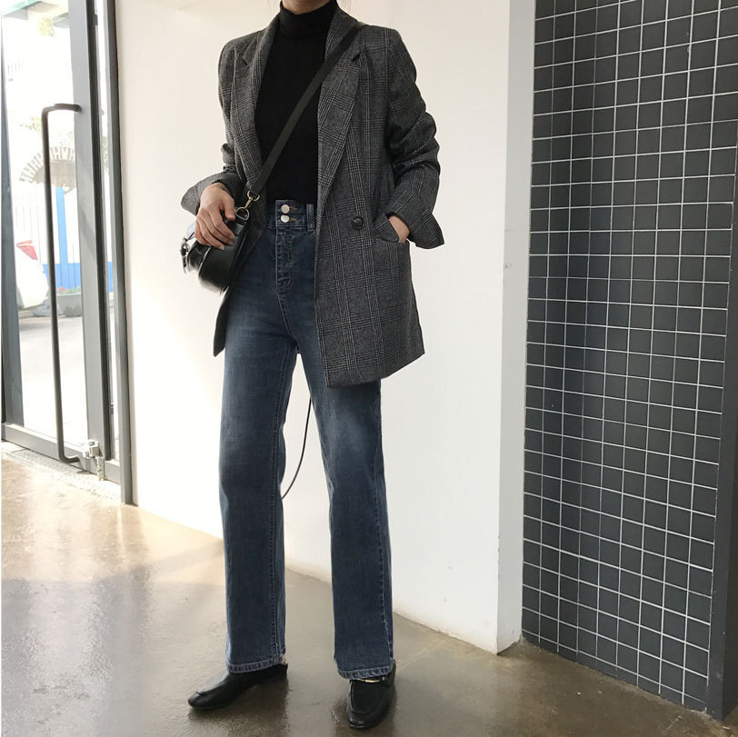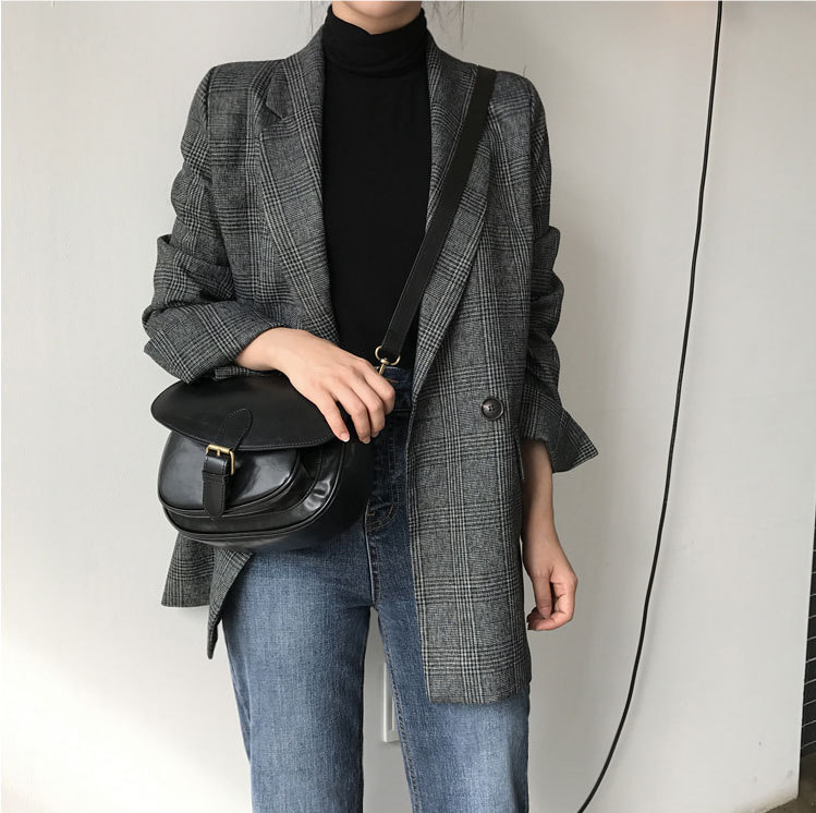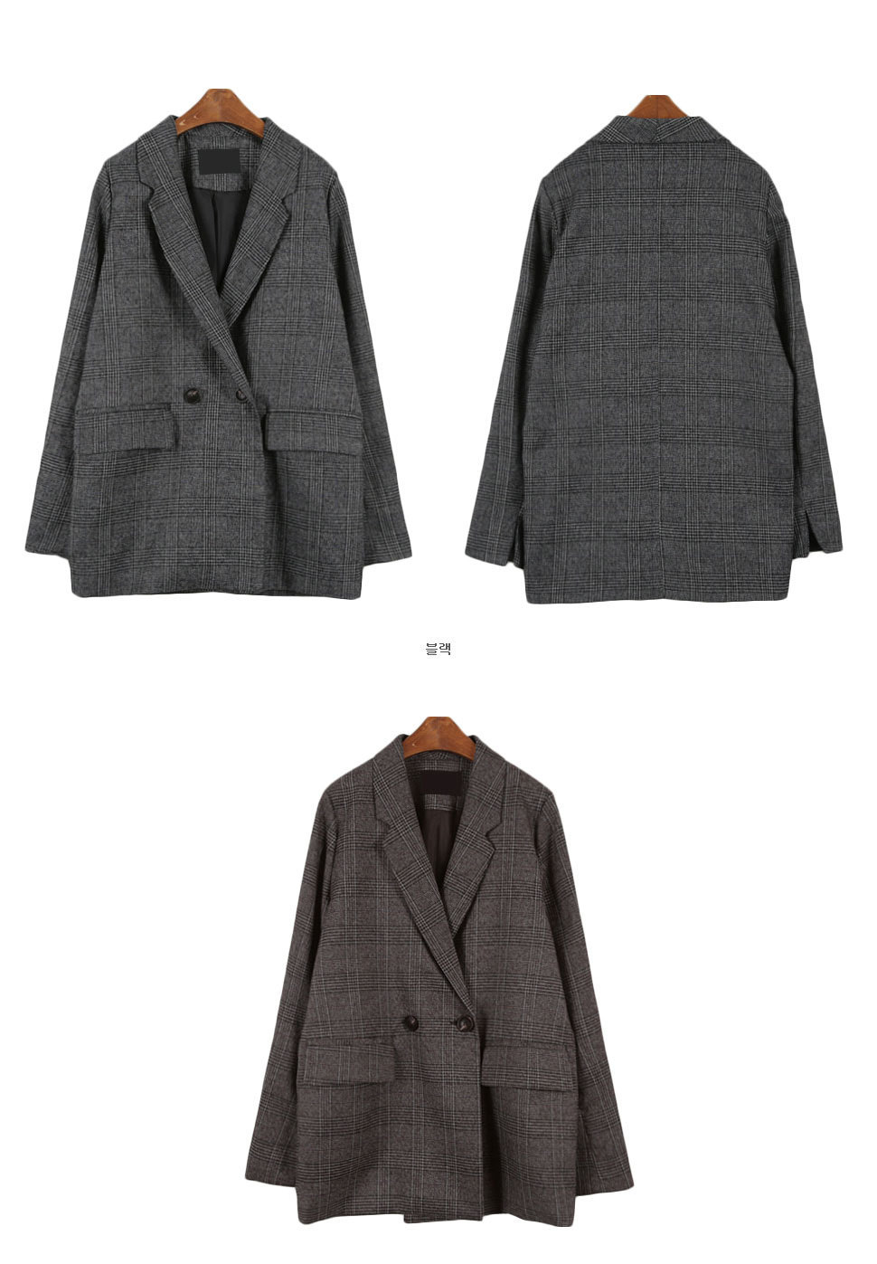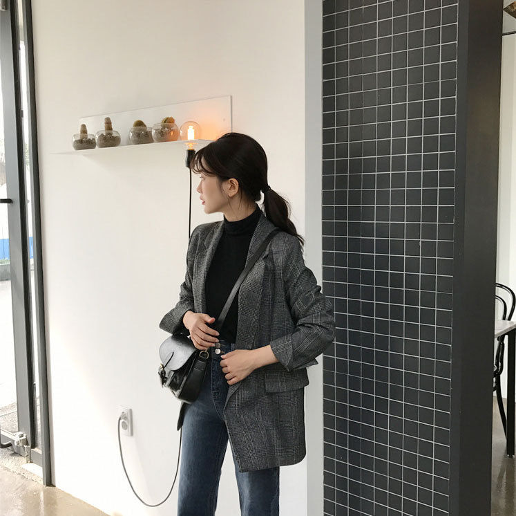 한국 세련된 가을과 겨울 간단한 빈티지 체크 옷깃 두 버클 느슨한 두 배 포켓 긴 소매 작은 세트 재킷스토어 가기