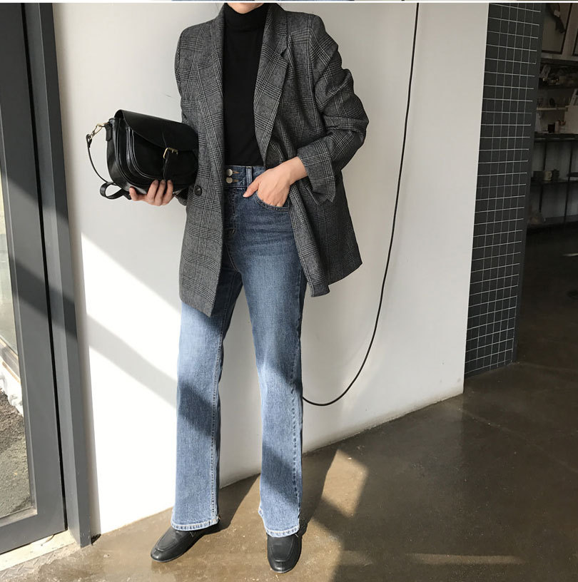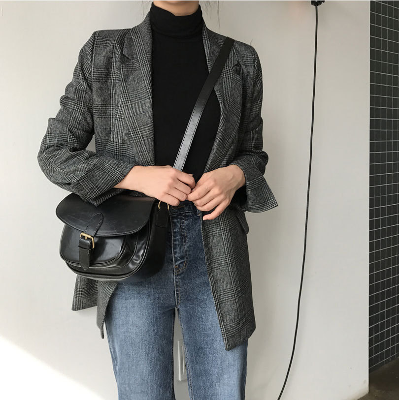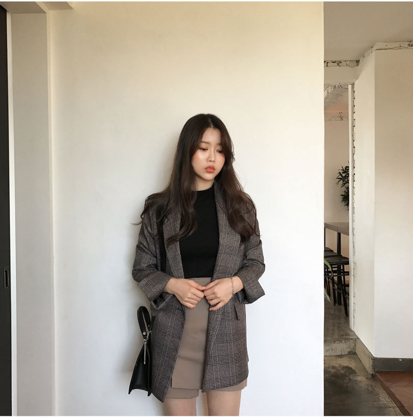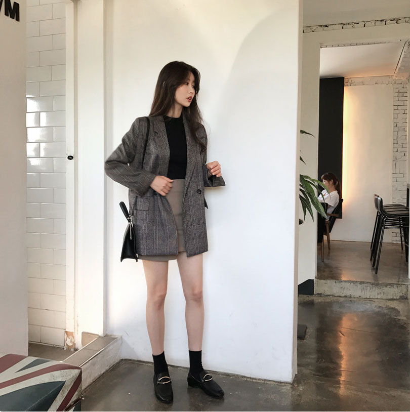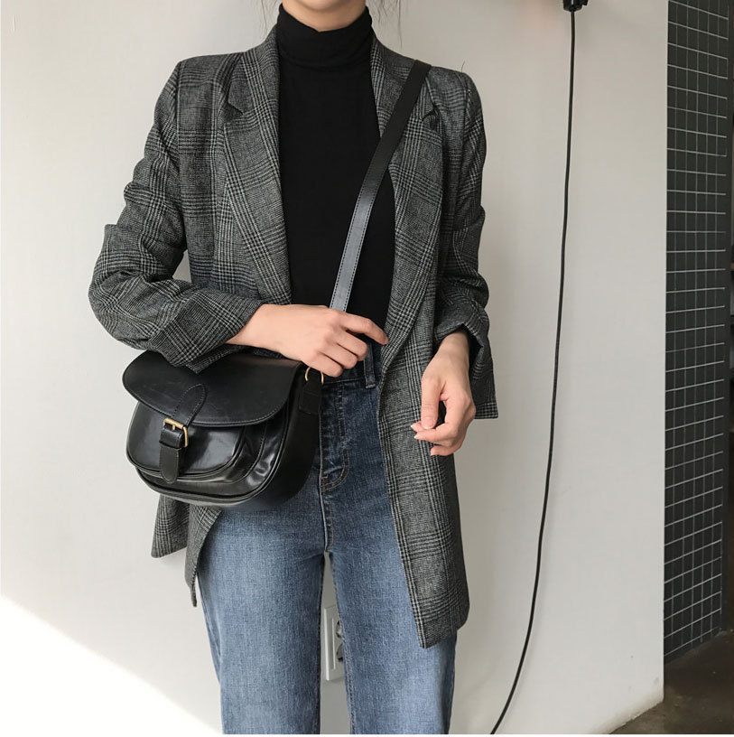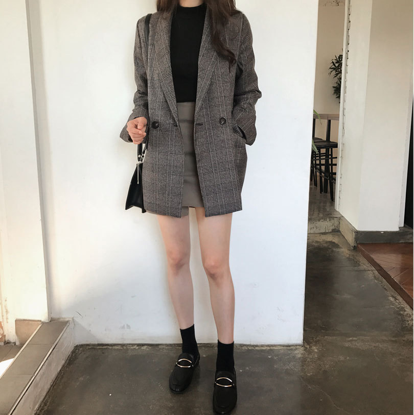 한국 세련된 가을과 겨울 간단한 빈티지 체크 옷깃 두 버클 느슨한 두 배 포켓 긴 소매 작은 세트 재킷