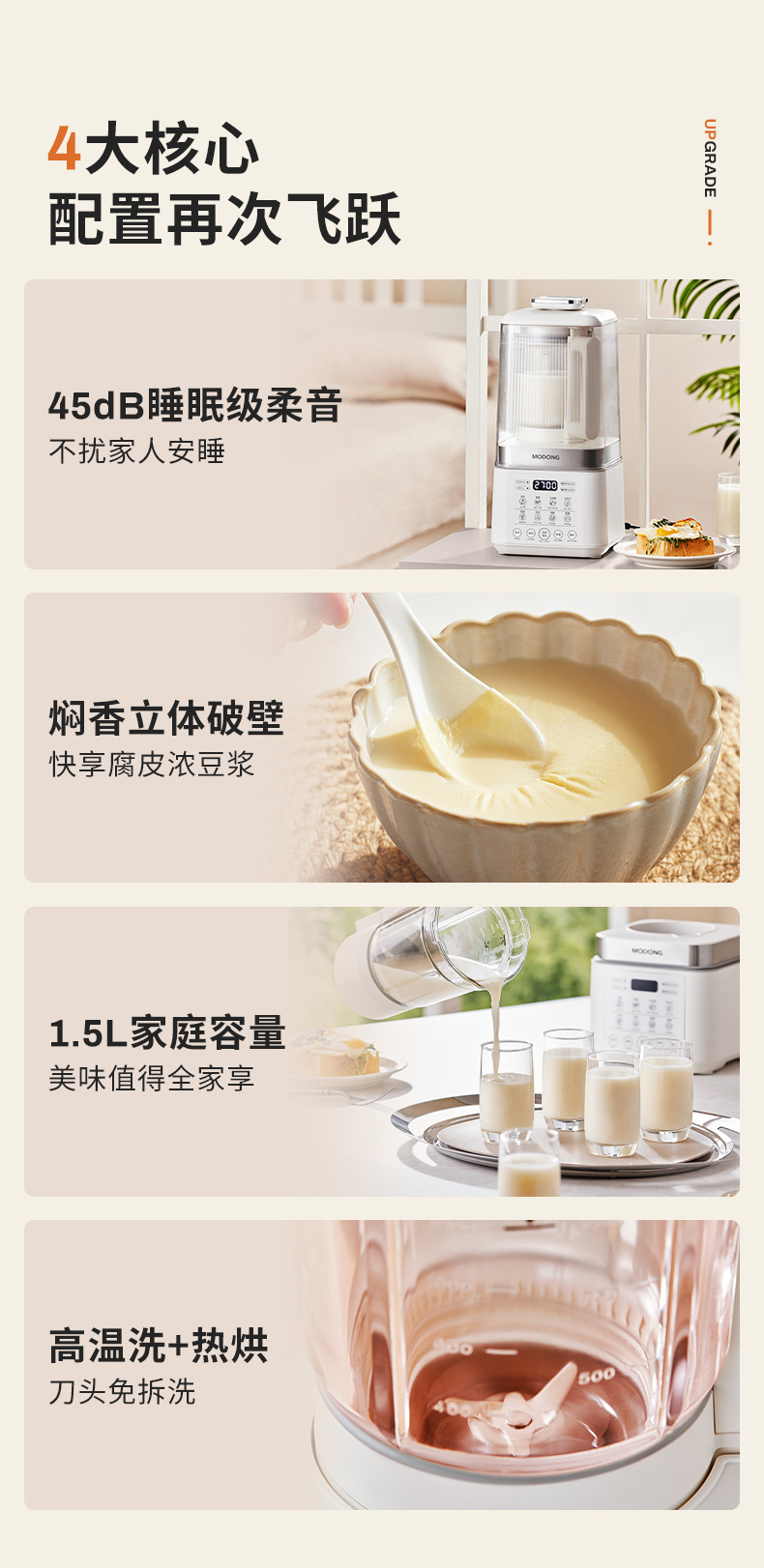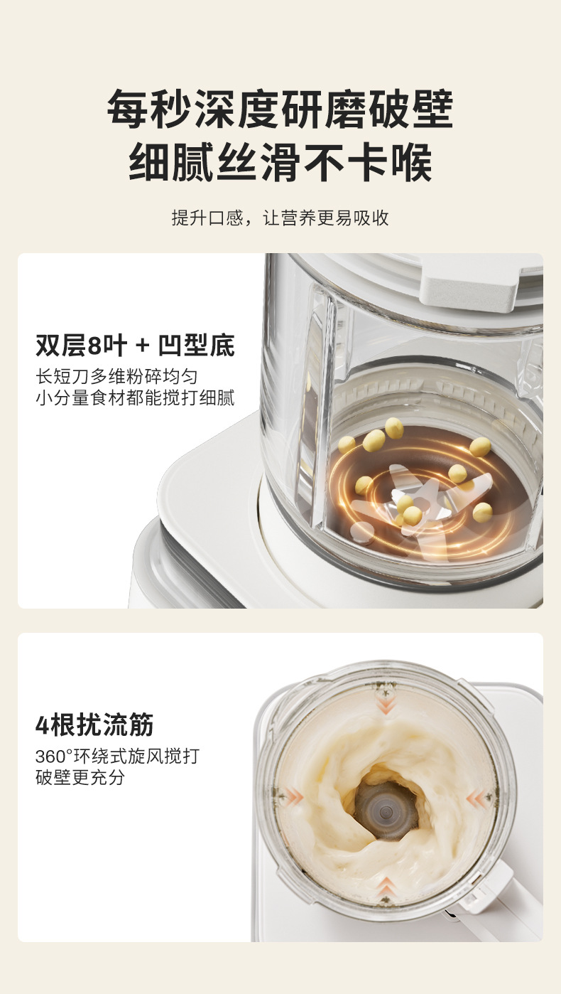 3.12大智能菜单,豆浆/玉米汁/米糊/炖汤/蒸煮/果蔬/奶昔/研磨/鱼汤/花茶/养生粥/清洗,实现细腻破壁,一机顶n台不闲置