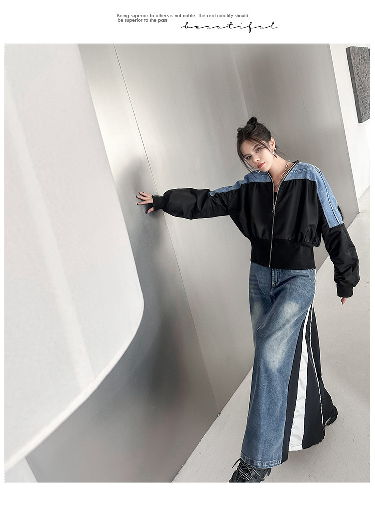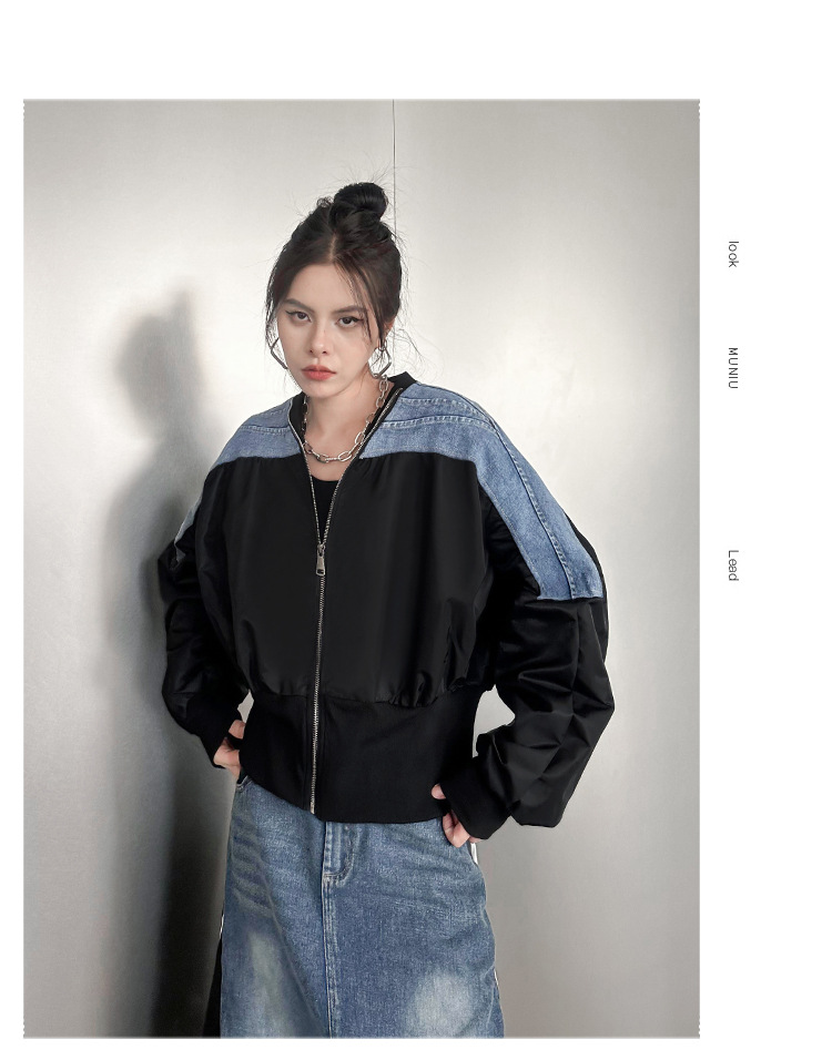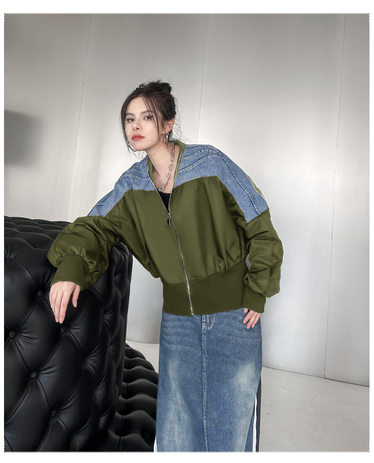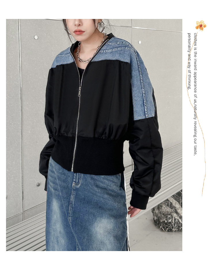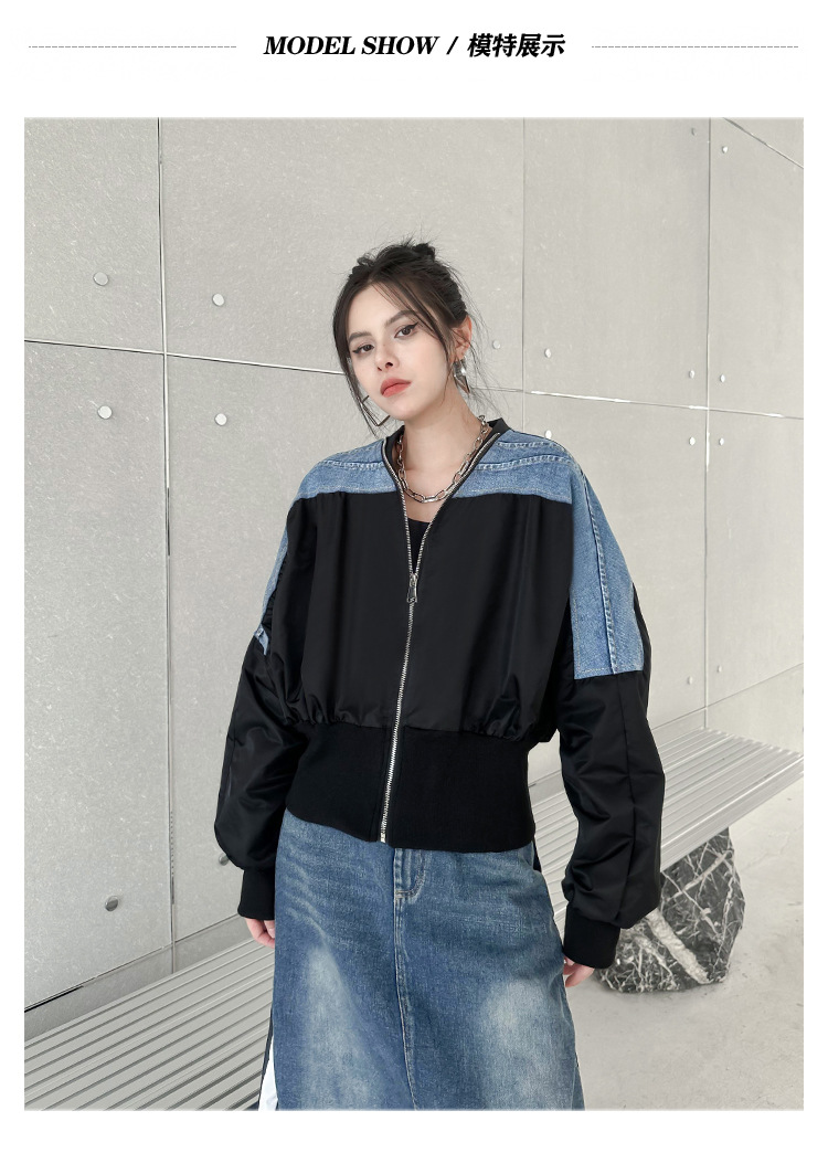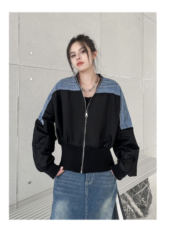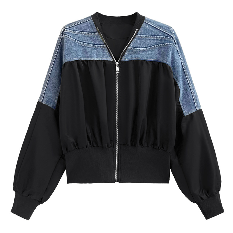 레트로 홍콩 스타일 대비 색상 스티칭 데님 짧은 코트 여성 봄과 가을 새로운 느슨한 슬리밍 캐주얼 지퍼 카디건 재킷