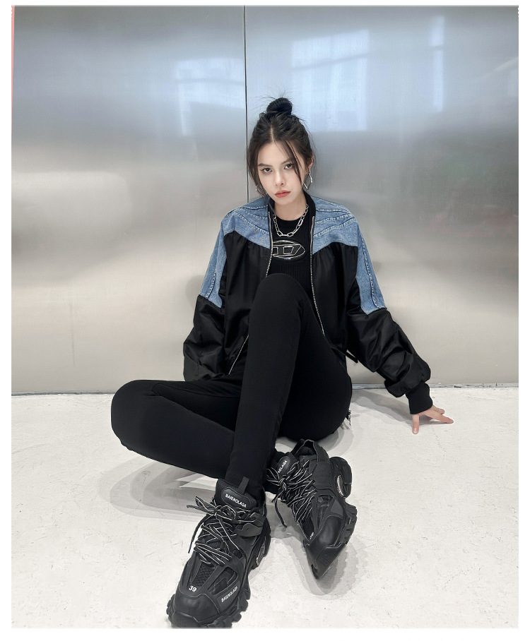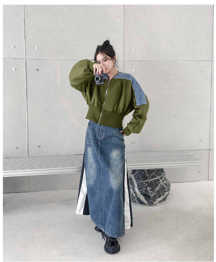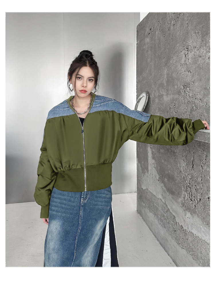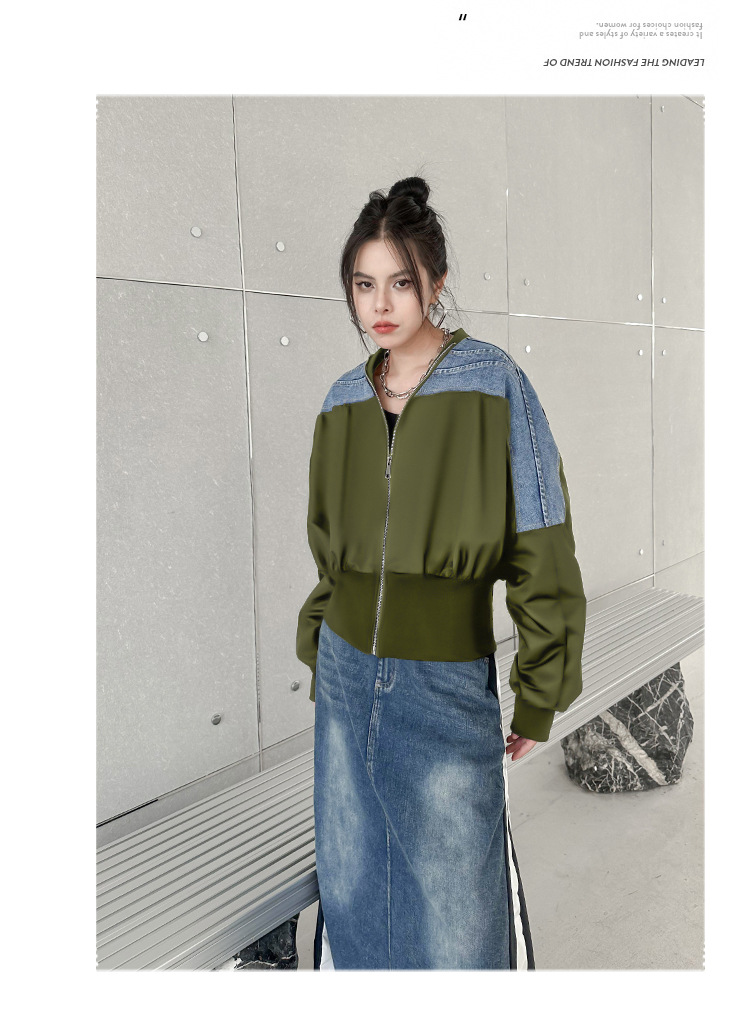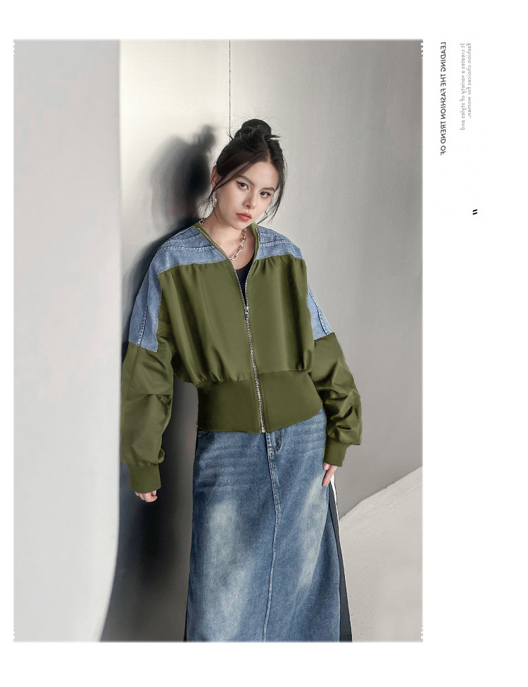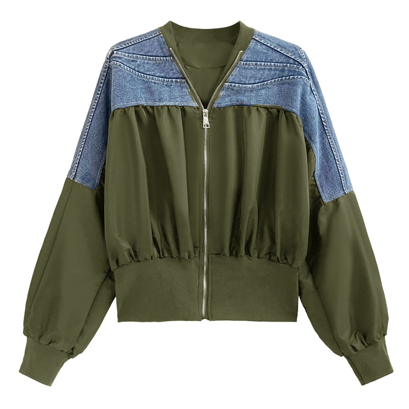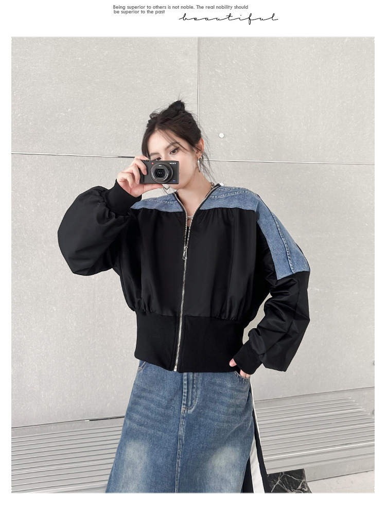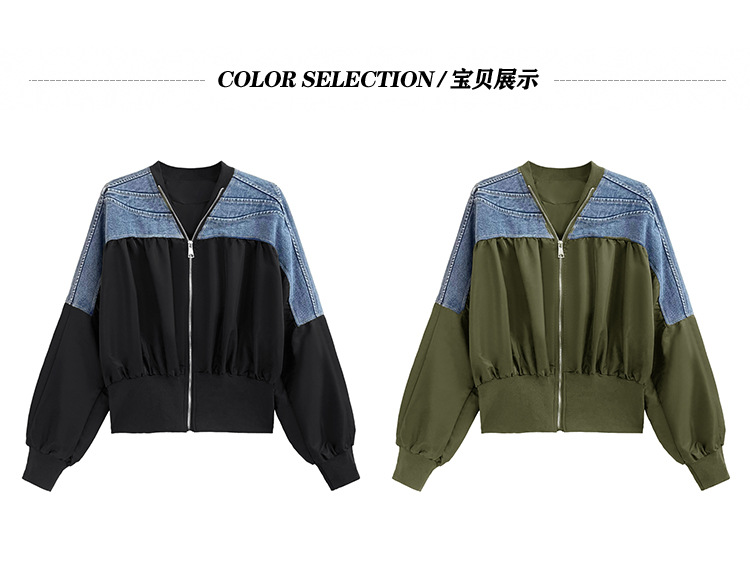 레트로 홍콩 스타일 대비 색상 스티칭 데님 짧은 코트 여성 봄과 가을 새로운 느슨한 슬리밍 캐주얼 지퍼 카디건 재킷
