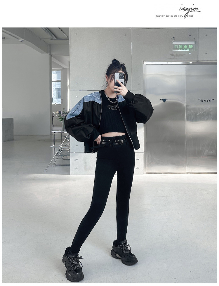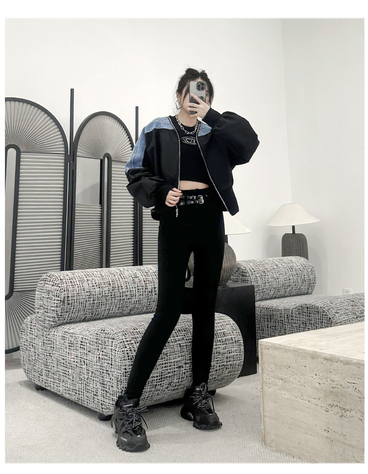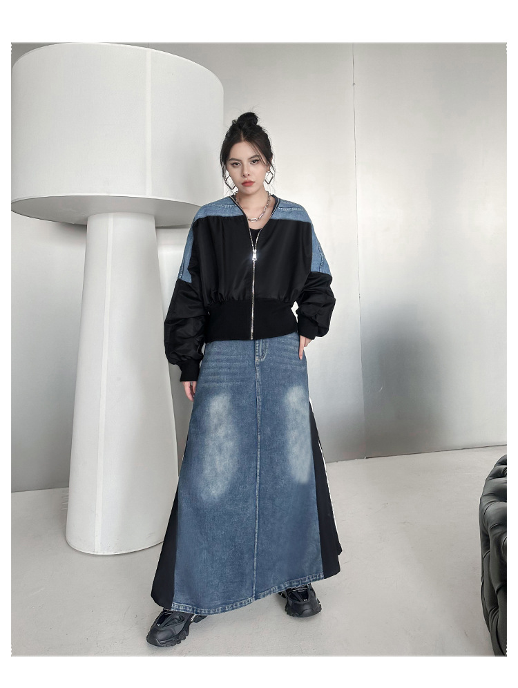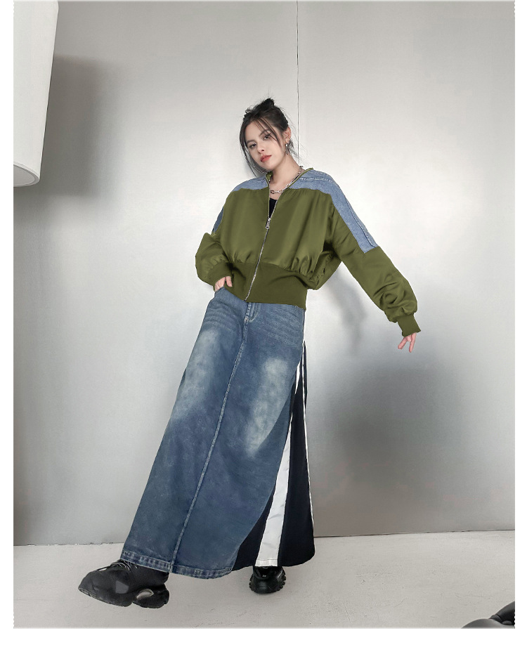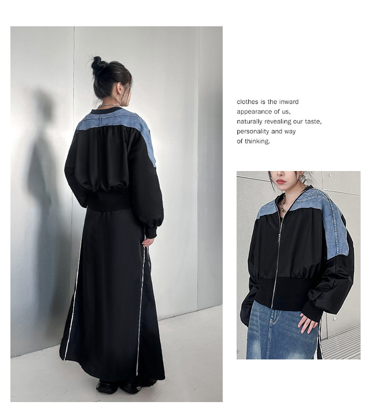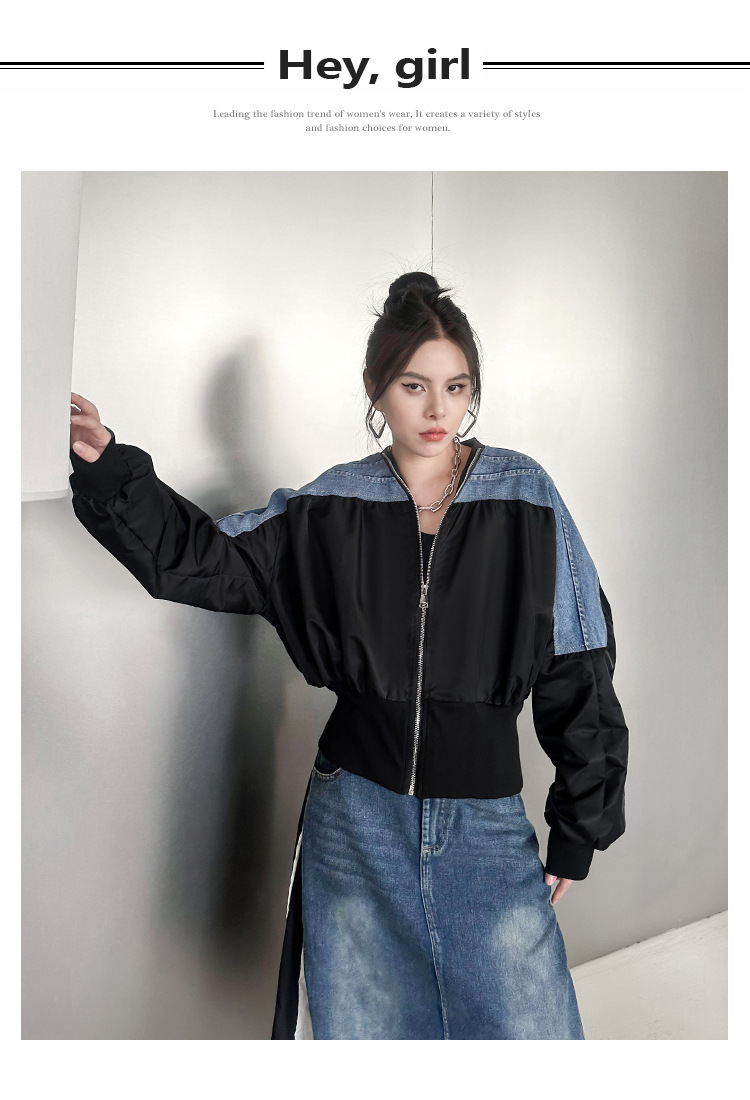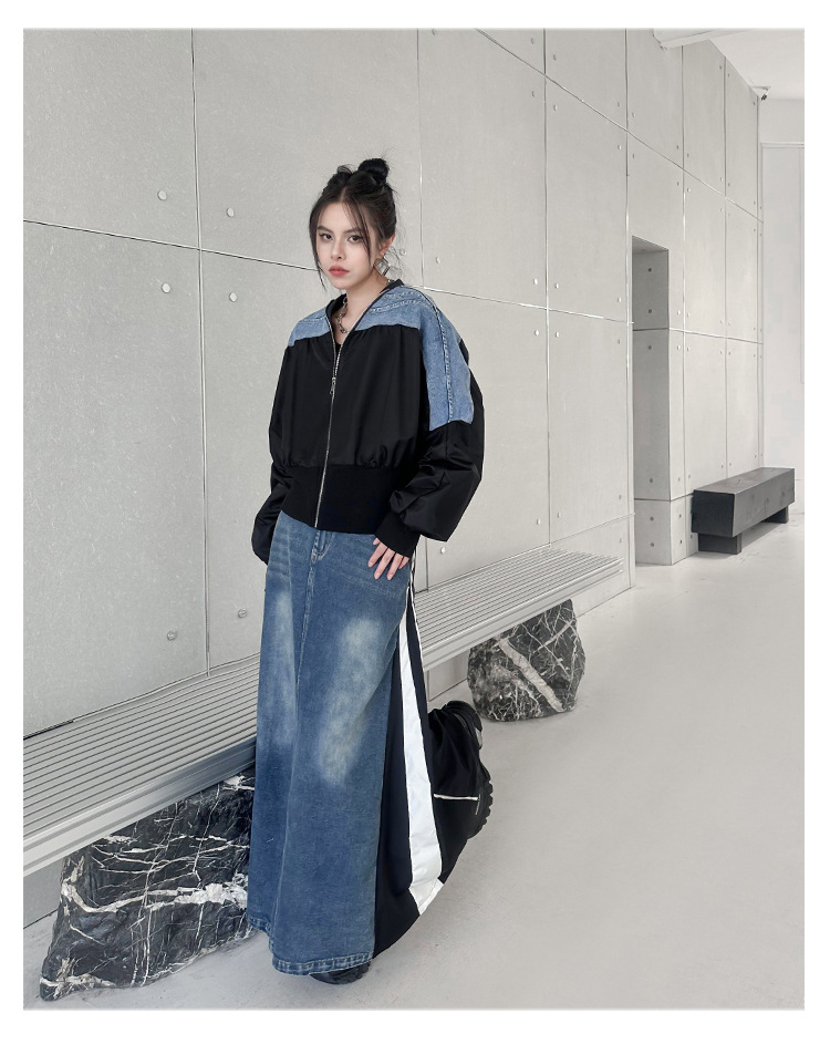 레트로 홍콩 스타일 대비 색상 스티칭 데님 짧은 코트 여성 봄과 가을 새로운 느슨한 슬리밍 캐주얼 지퍼 카디건 재킷