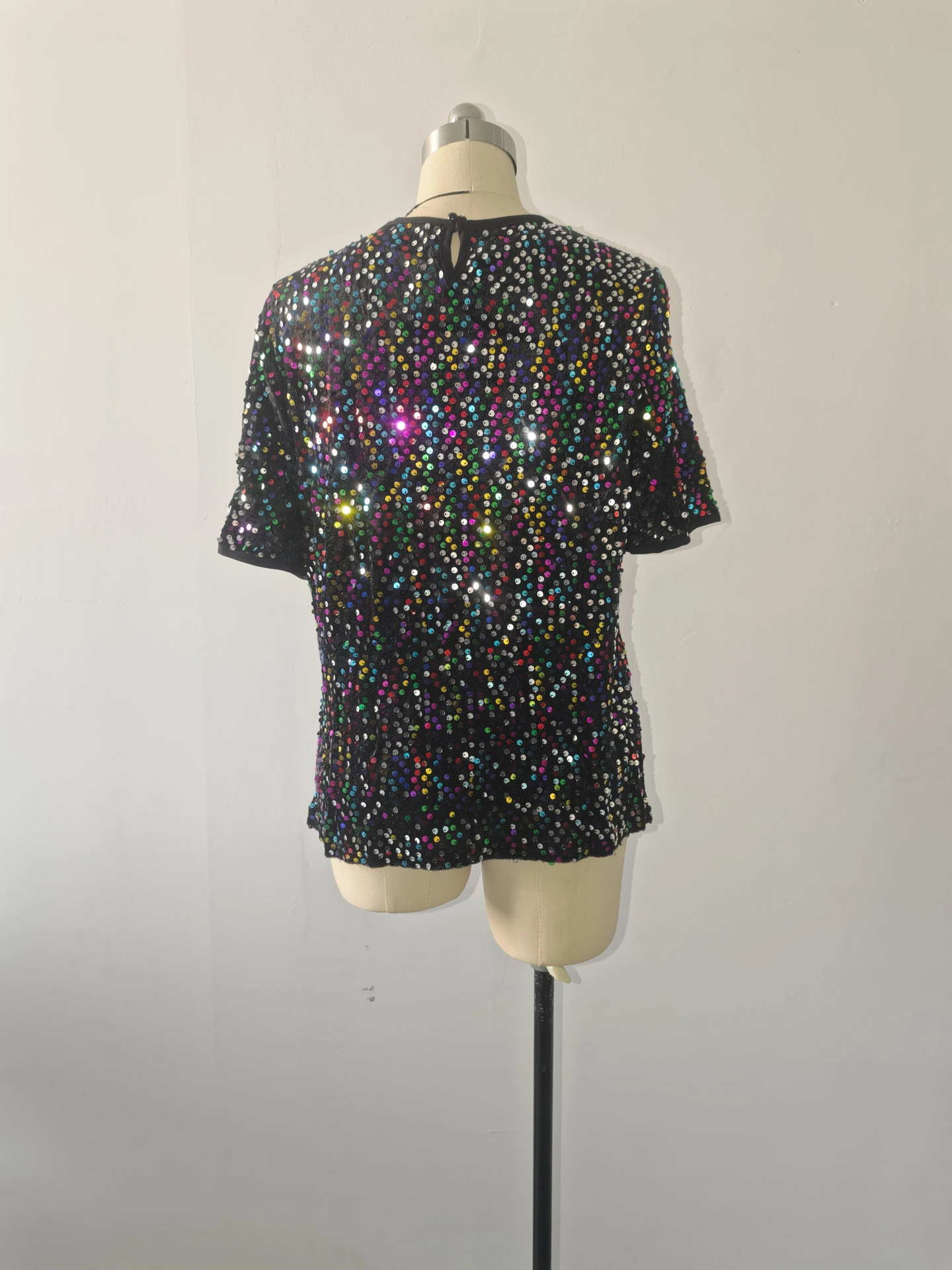 유럽과 미국의 아마존 국경 간 새로운 인기있는 통근 느슨한 짧은 소매 가방 칼라 라운드 넥 여성 스팽글 티셔츠