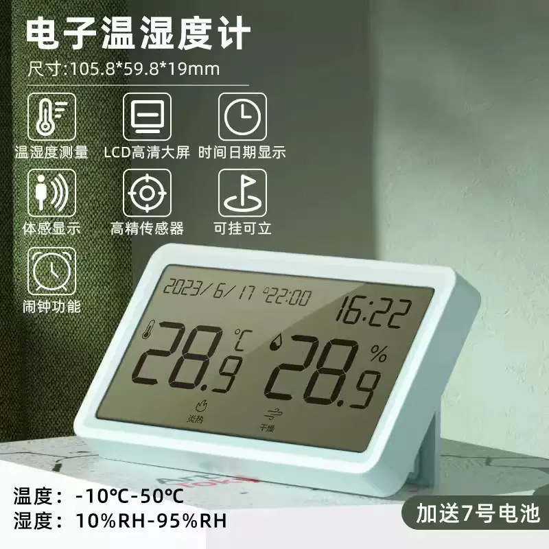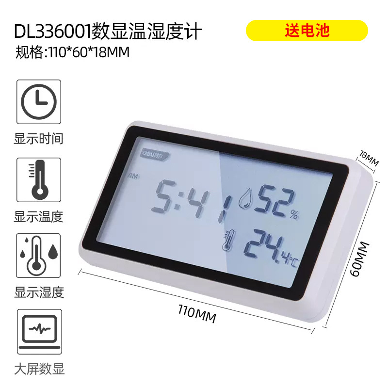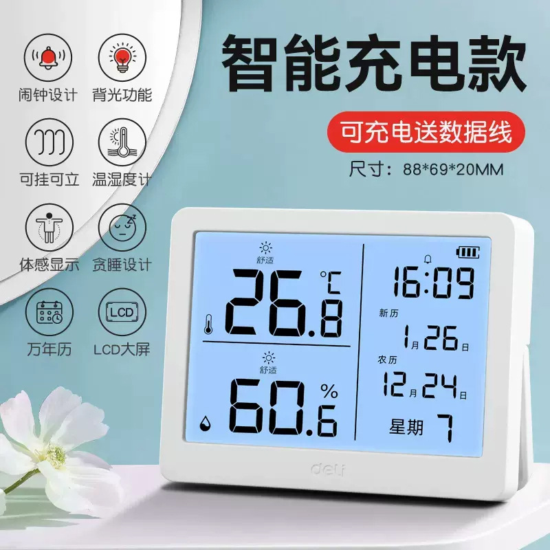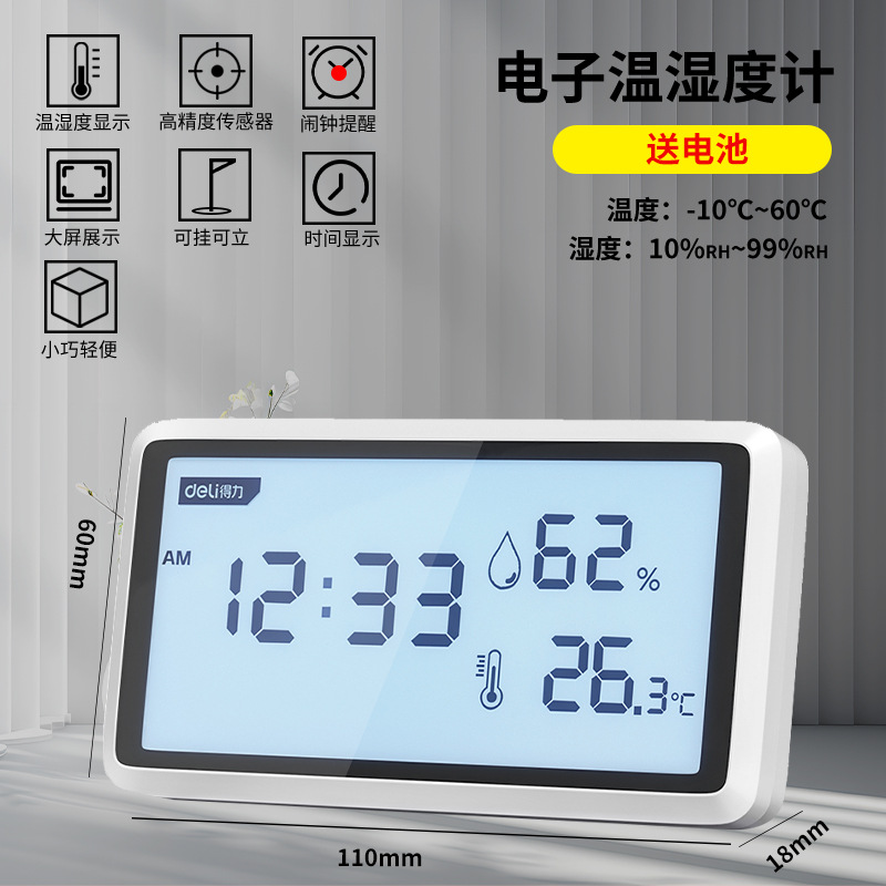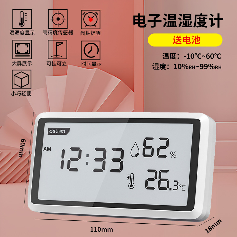 델리 DL336003 전자 습도계 실내 가정용 온도계 디지털 디스플레이 백라이트 알람 시계 건조 습도 측정기