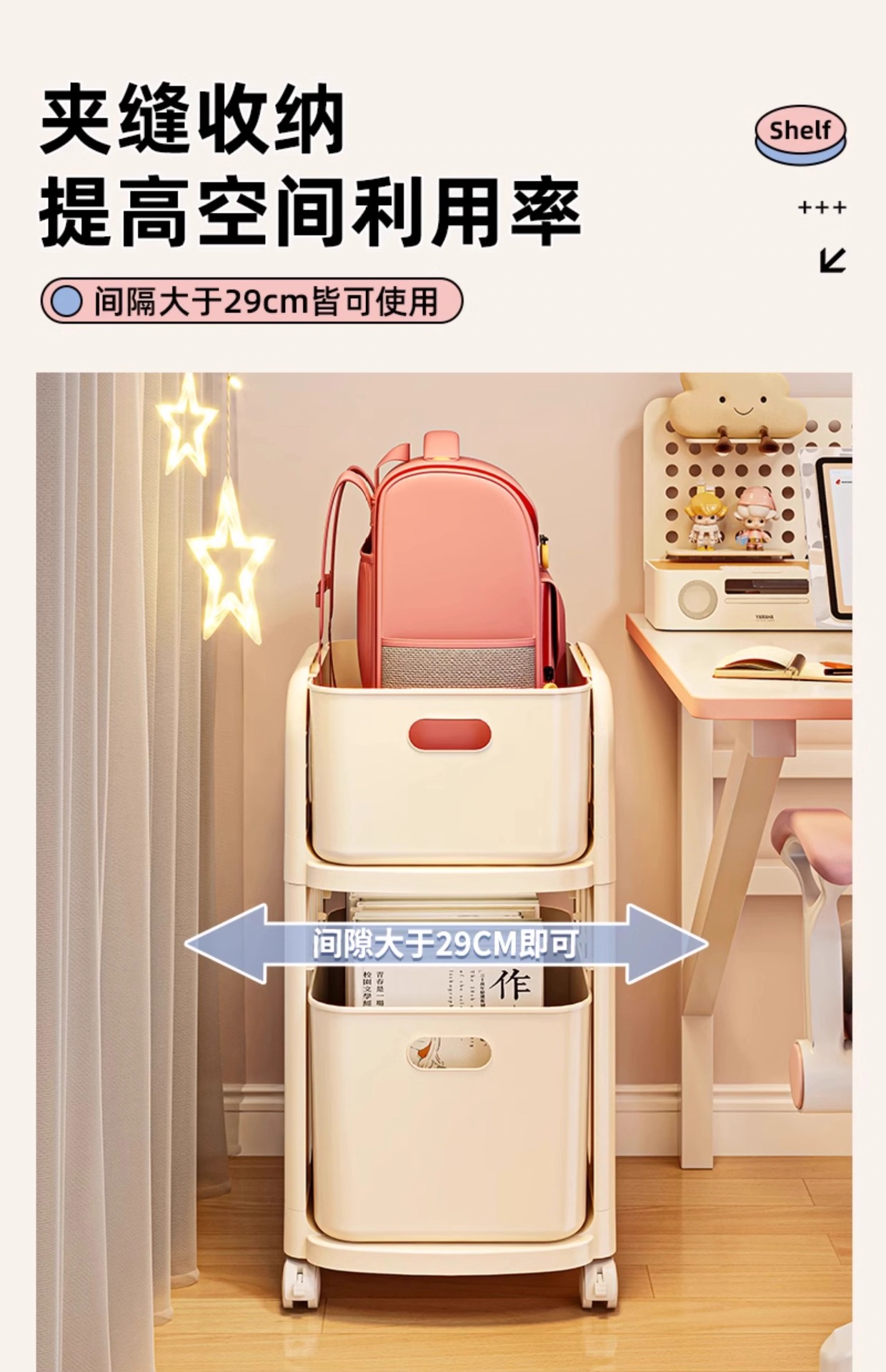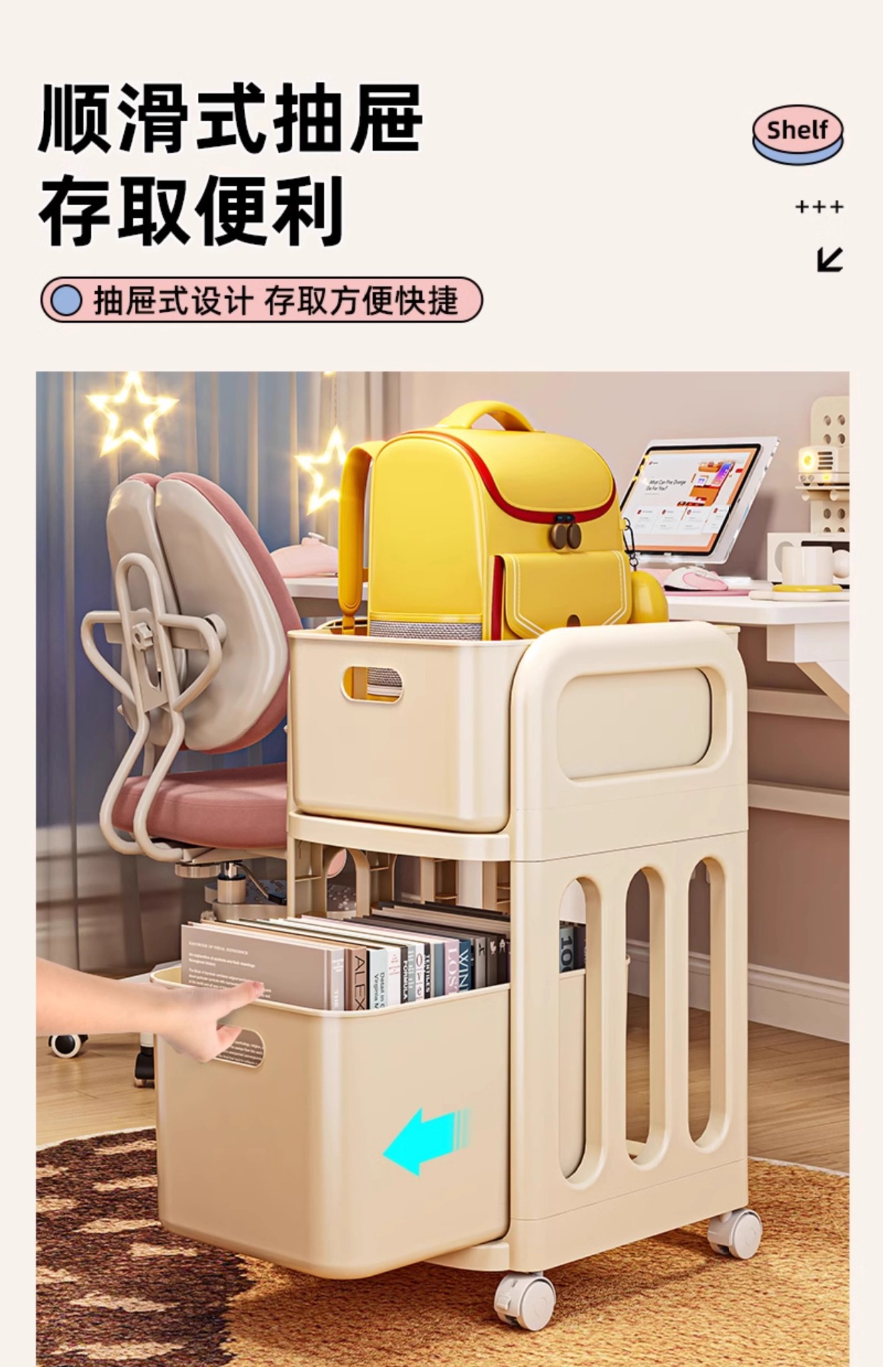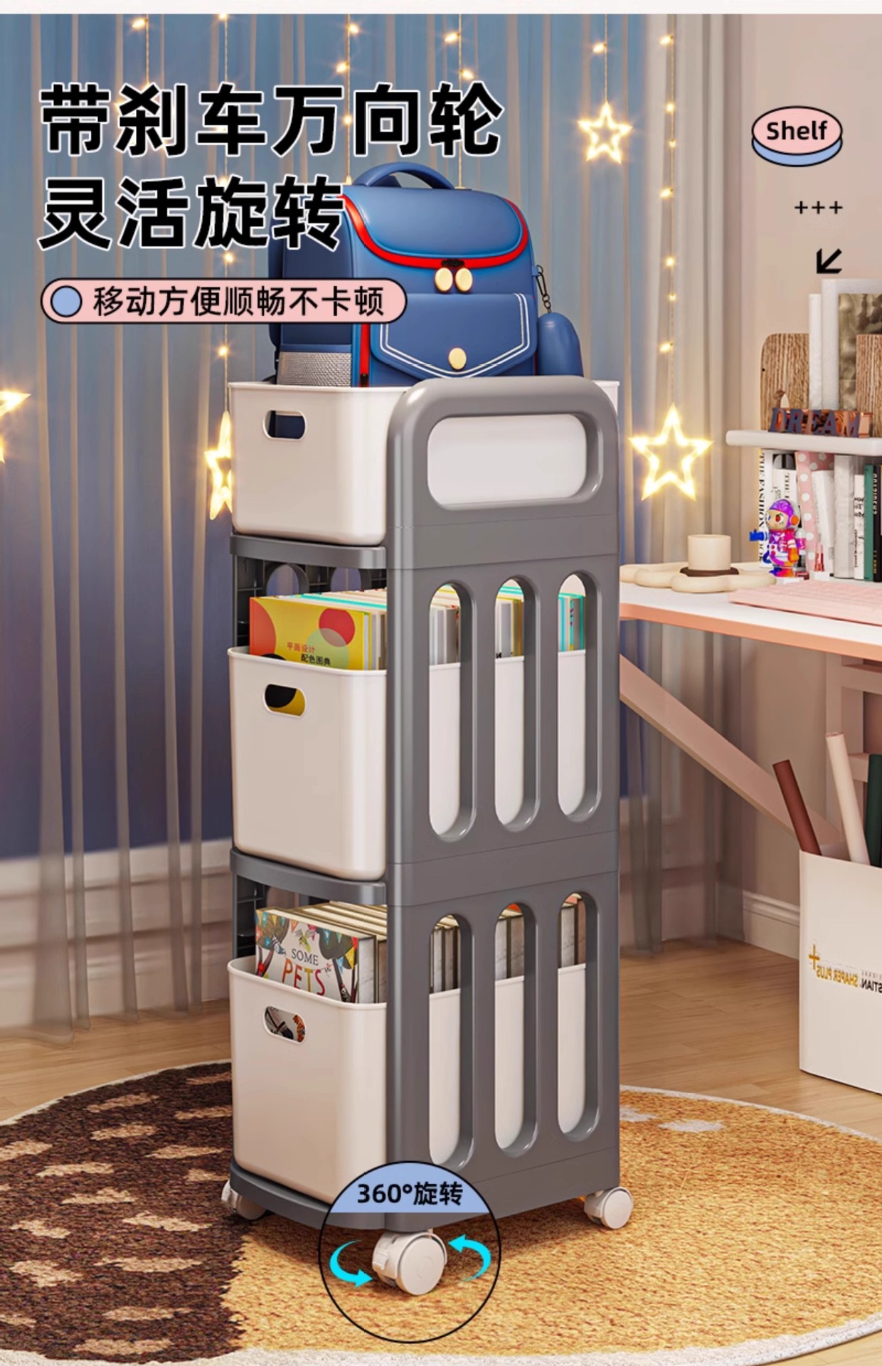 书包架 多层 分类 带格 轻奢 简约 大容量 分层 置物架 小推车 可移动 整理 收纳 杂物 文件 文具 零食 玩具 家用 家居 日用 卧室 学生 寝室 宿舍 客厅 书房