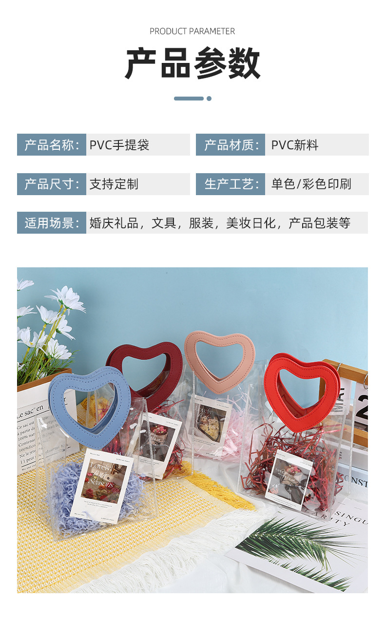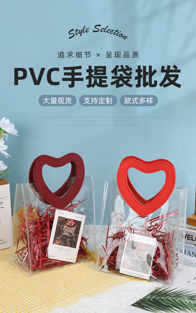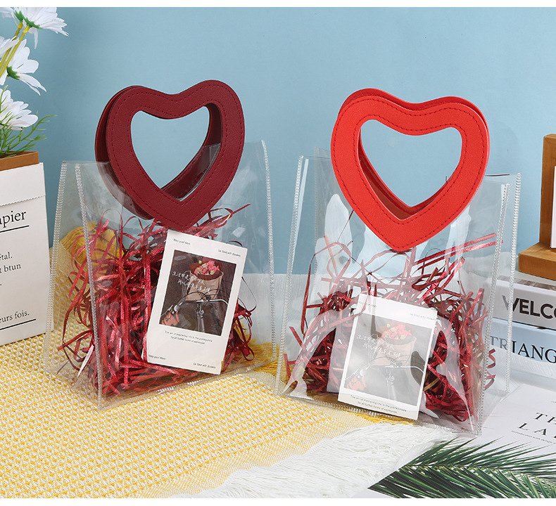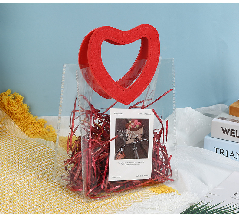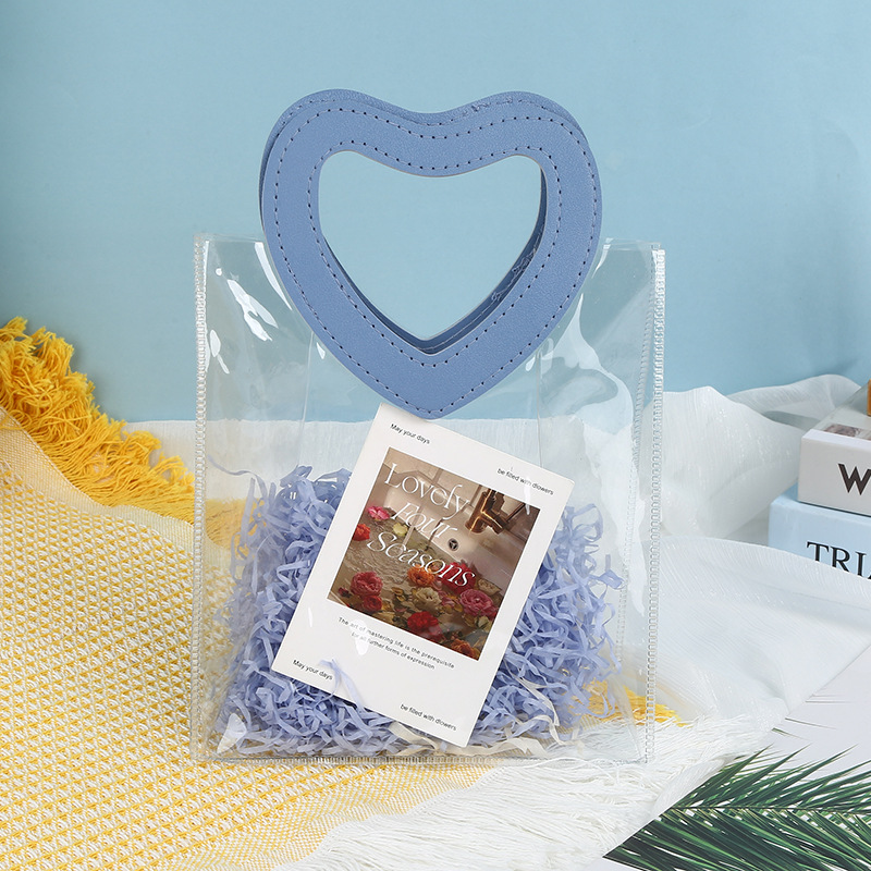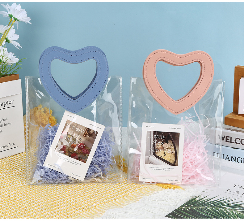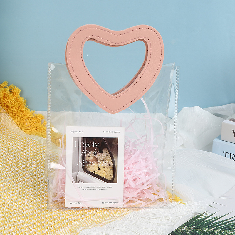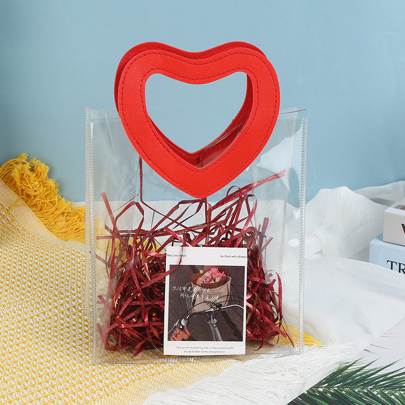 재고 손 선물 가방 투명 선물 가방 pvc 핸드백 도매 하트 모양의 선물 사탕 플라스틱 포장 가방스토어 가기