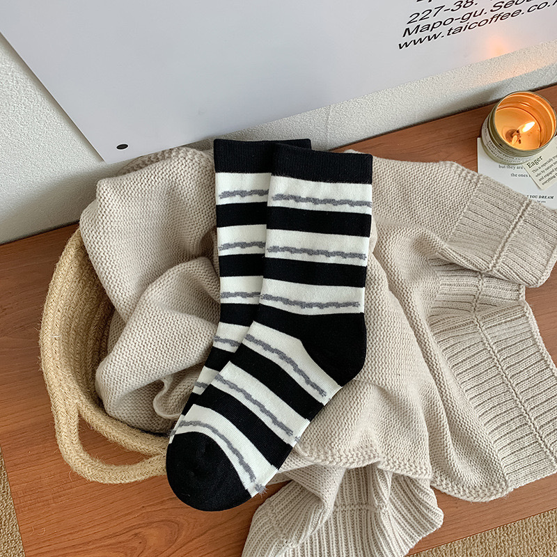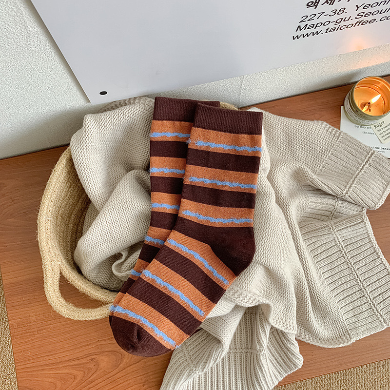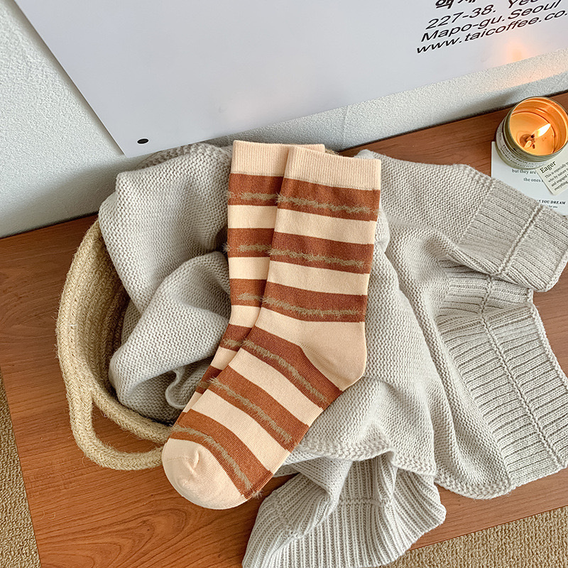 가을과 겨울 무리 줄무늬 Maillard 색상 대비 색상 중간 송아지 코튼 양말 여성 양말 다목적 캐주얼 컬러 매칭 복고풍 틈새 양말스토어 가기