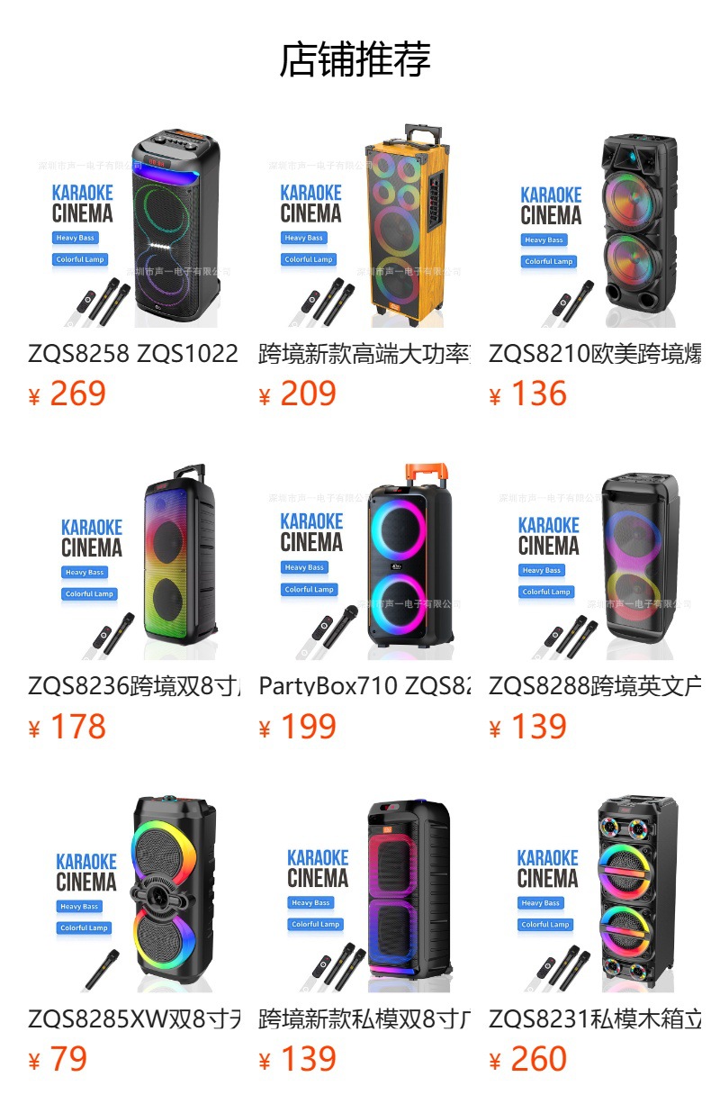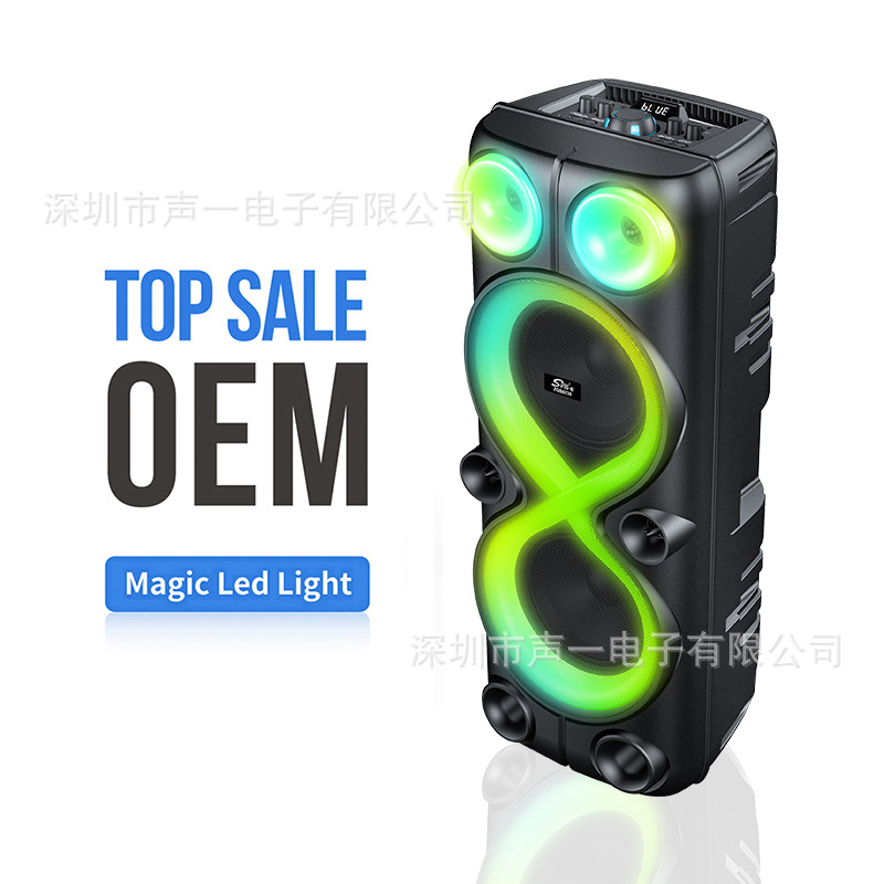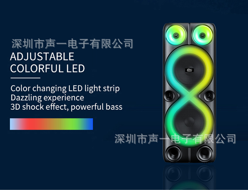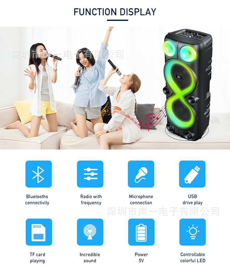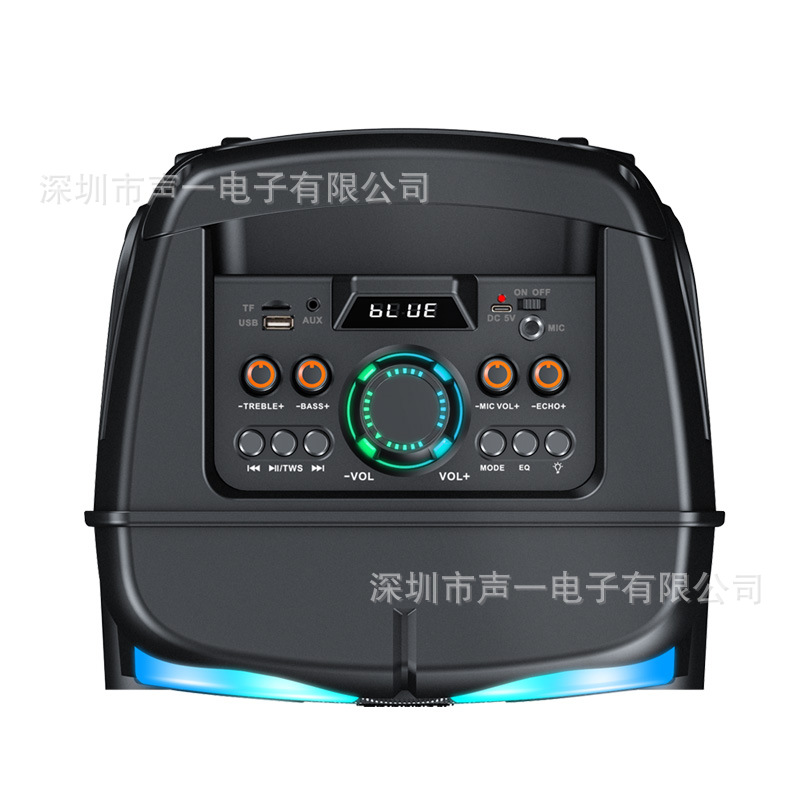 Equipped with BT/USB/TF card/MIC/AUX/FM/remote control, wireless microphone function, DC-5V charging (TYPE-C charging port). Please note that the charging light uses a plug-in red light, dual power amplifier+treble, with lithium battery protection/potentiometer volume, USB with 5V boost, display screen, box matching function, and LED button control (short press to control the rainbow, long press to control the rainbow)