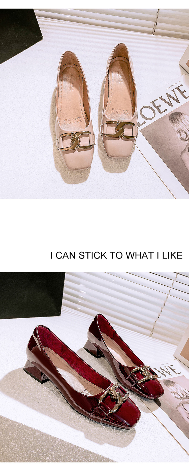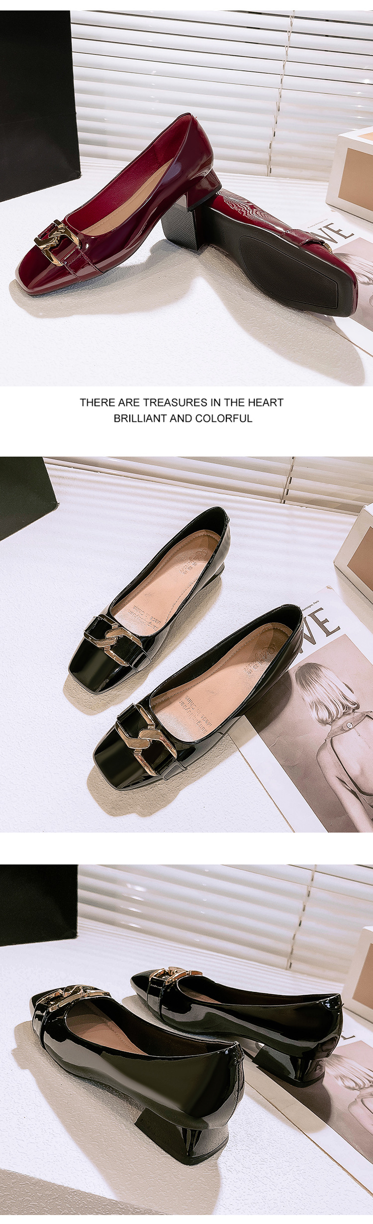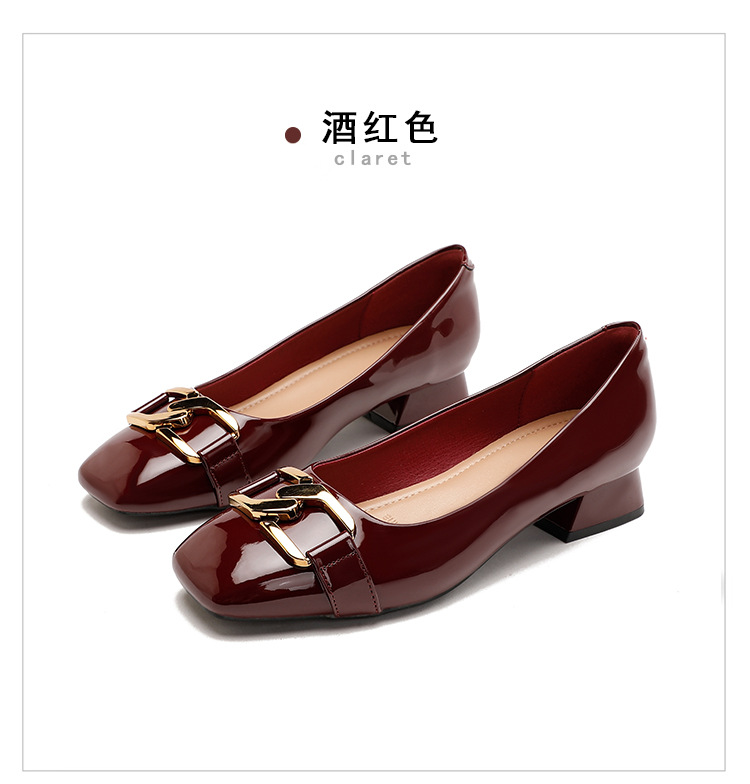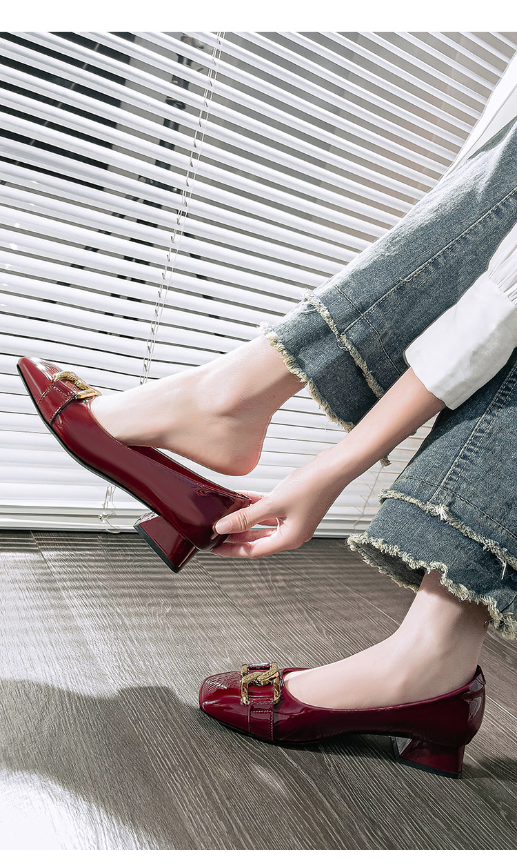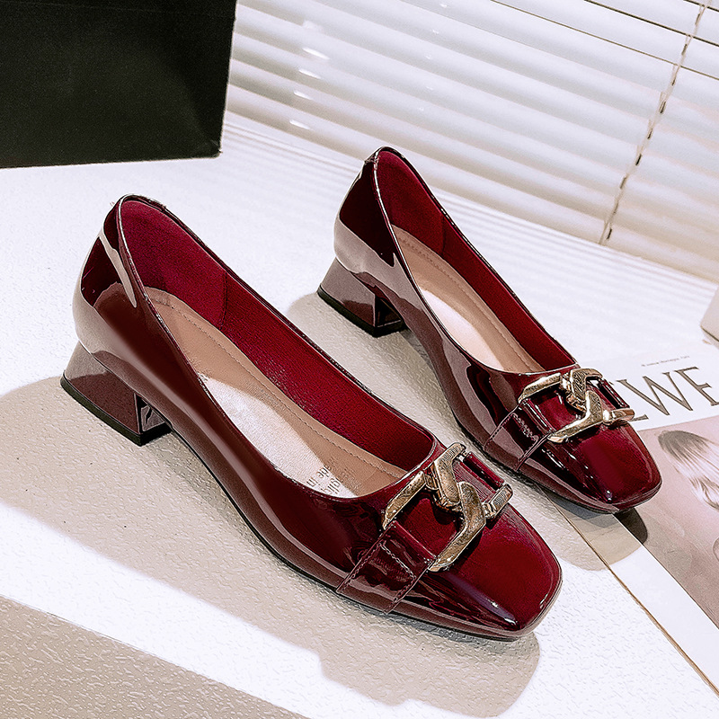 여성용 청키 힐 싱글 레이어 신발 2024 봄 새로운 프랑스 복고풍 로우 힐 여성 신발 특허 가죽 버건디 스퀘어 토 하이힐