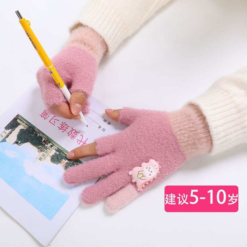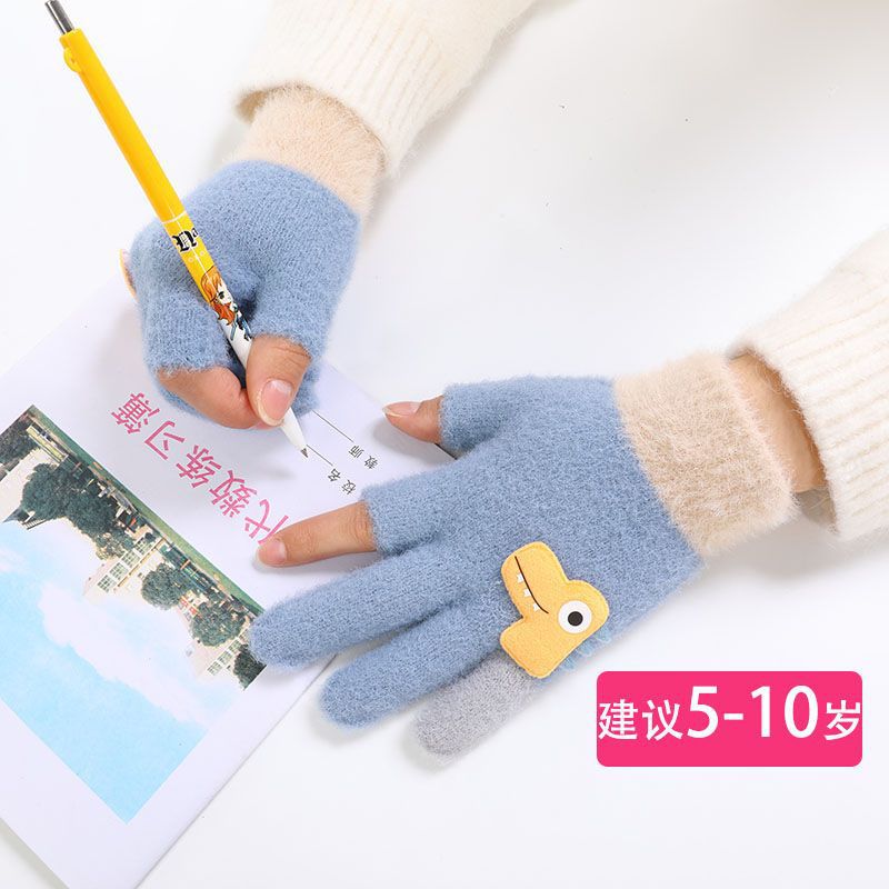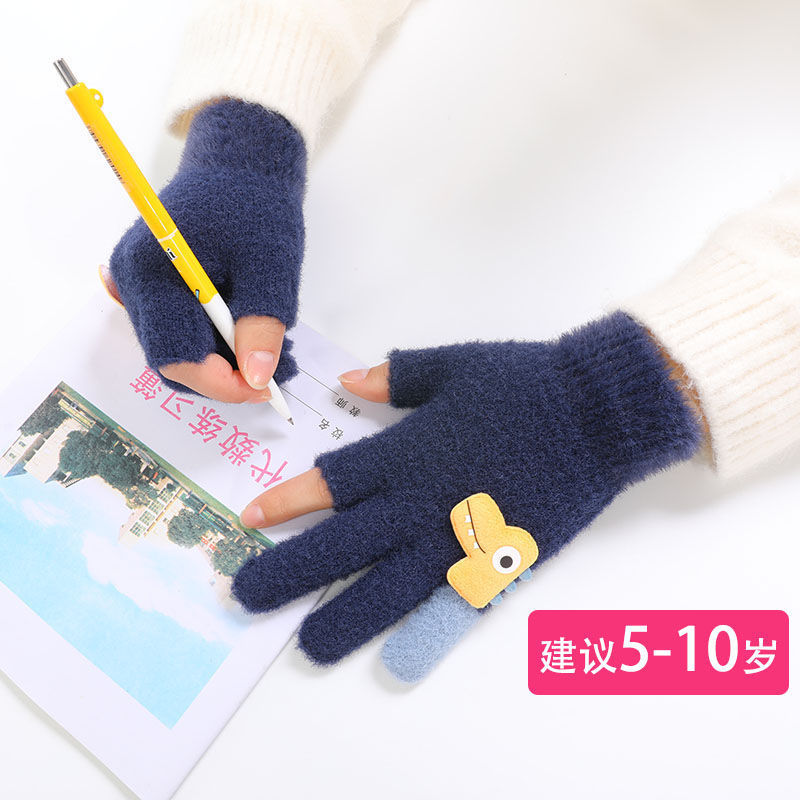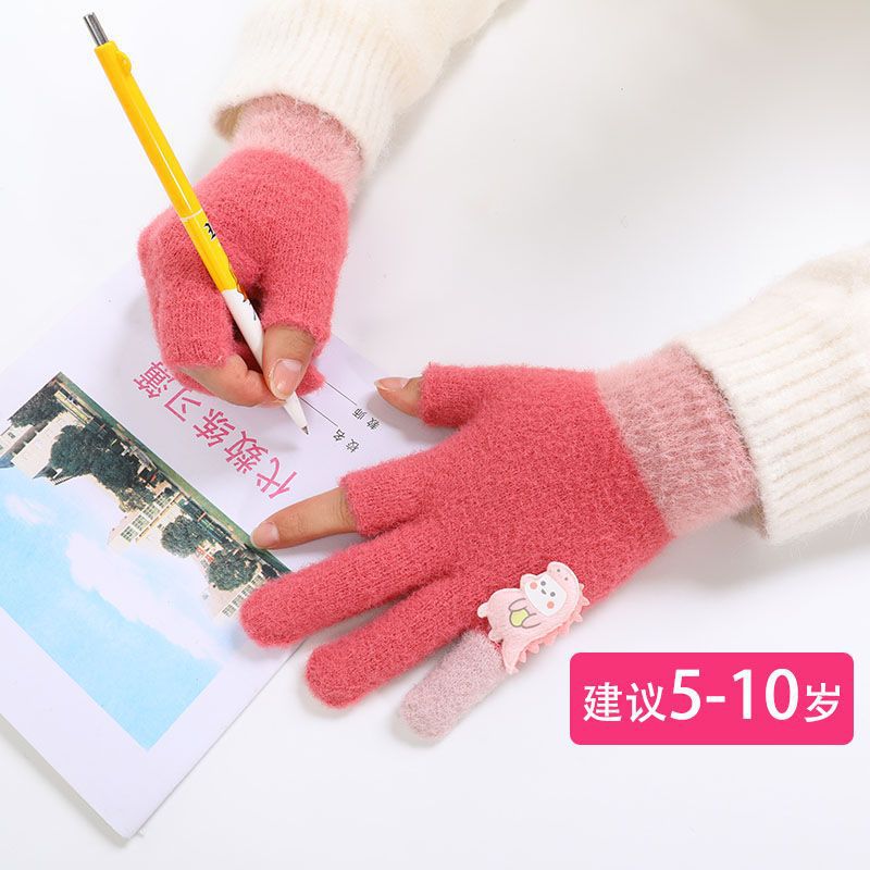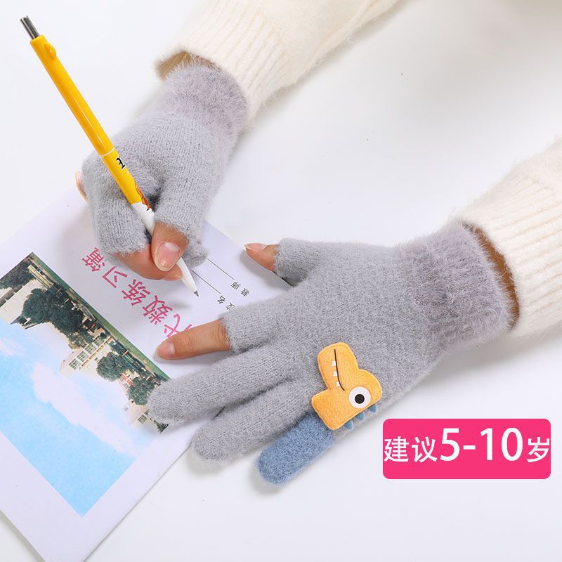 두 손가락 노출 어린이 장갑 가을과 겨울 귀여운 봉제 따뜻한 반 손가락 장갑 소년 소녀 초등학생 장갑 글쓰기