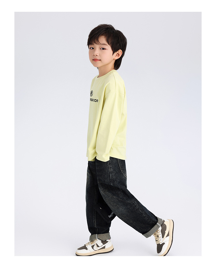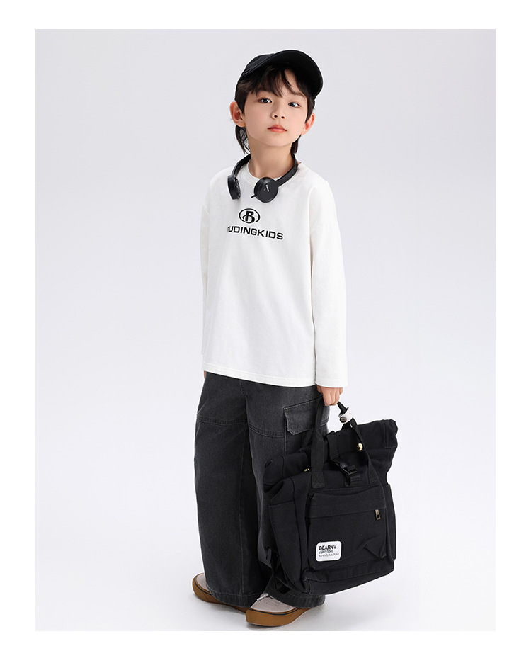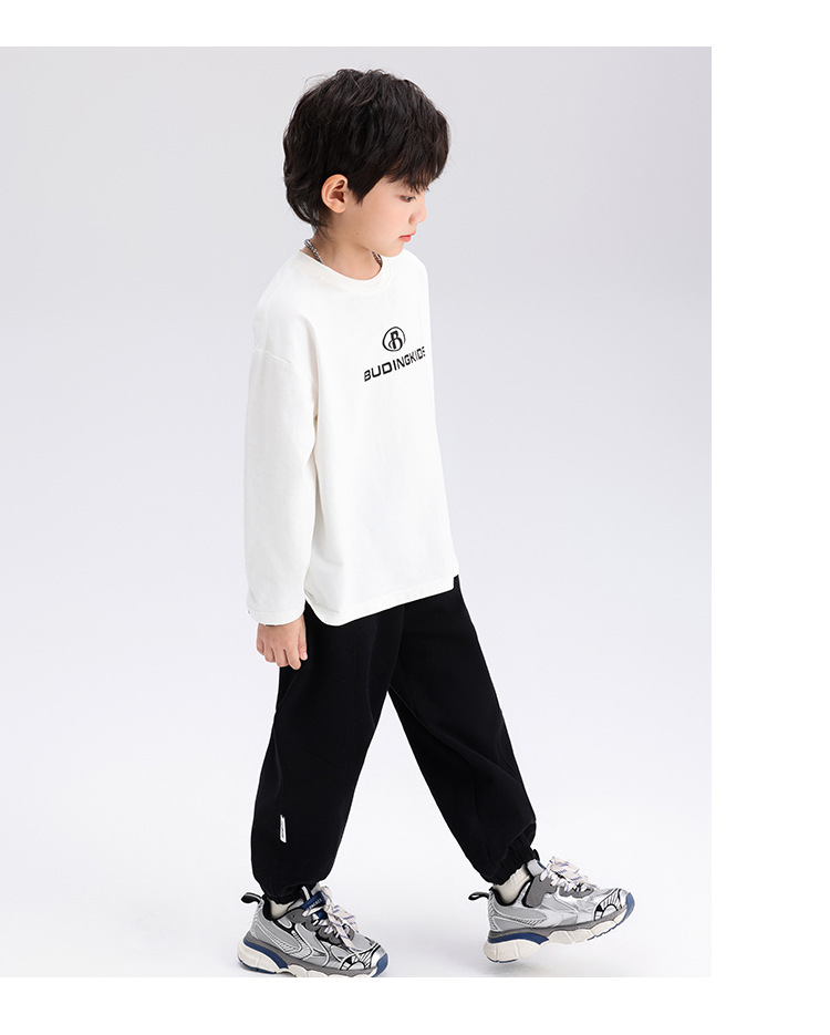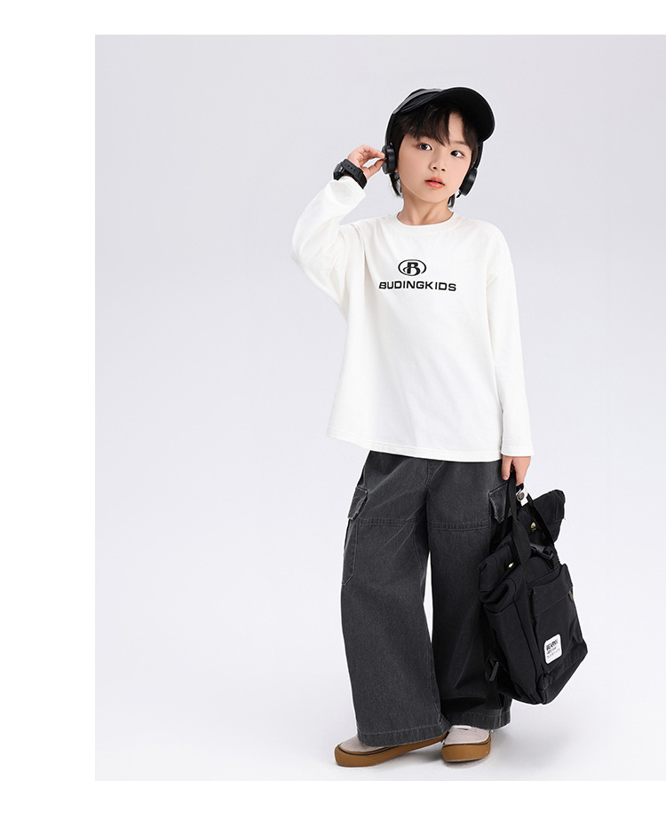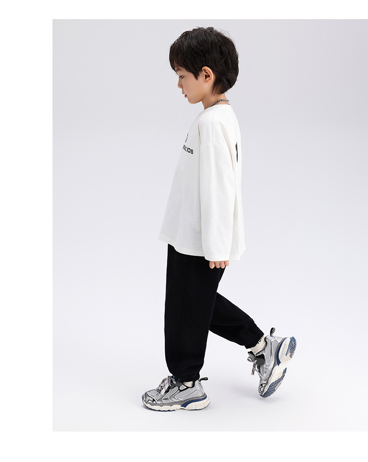 소년의 봄과 가을 긴팔 티셔츠 2024 봄과 가을 새로운 중대형 어린이 크루 넥 베이비 자켓 레터 프린트 티셔츠
