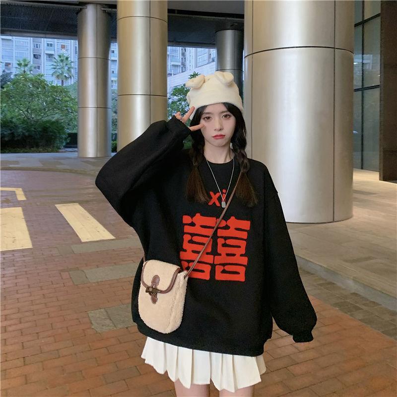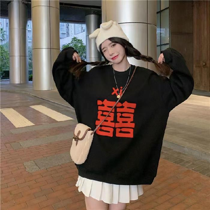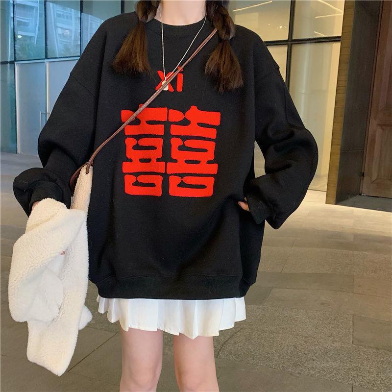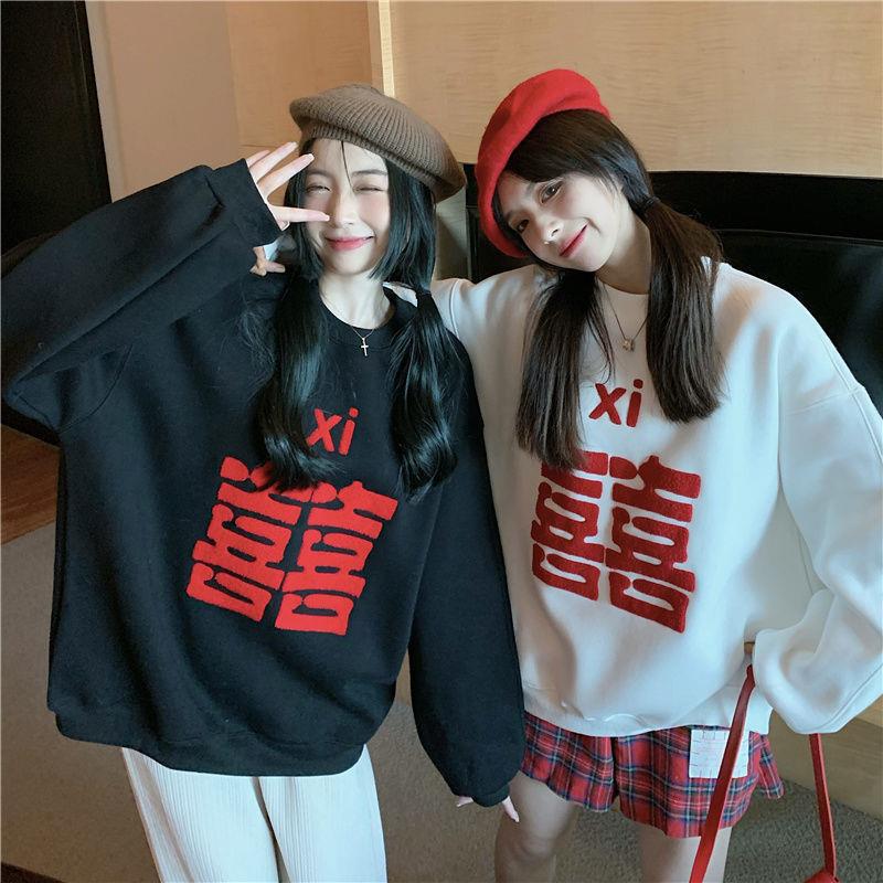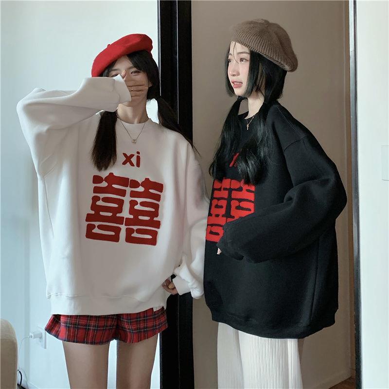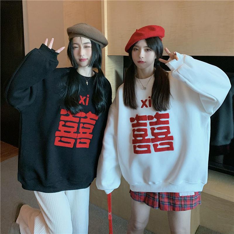 大量现货#加绒加厚卫衣女刺绣中国风国潮圆领情侣装秋冬加绒男女