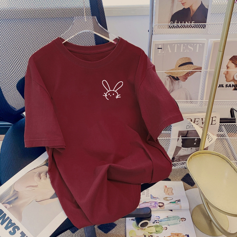 纯棉短袖T恤女2023夏季新款宽松韩版大码女装休闲百搭中长款酒红色