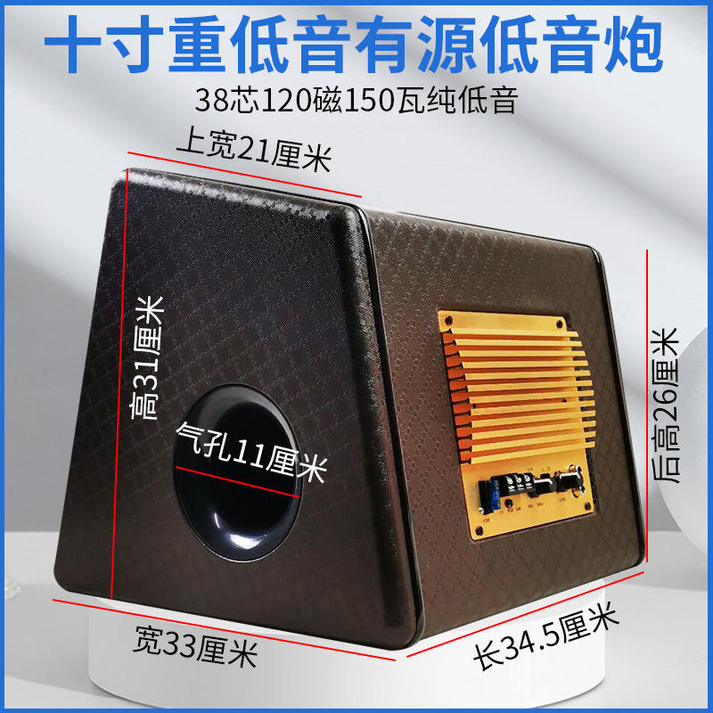 十寸有源重低音空箱,统一采用15厘密度板内打胶密封,高端皮革面料,默认有配送气孔和吸音棉,没有其他配件;