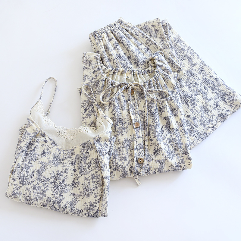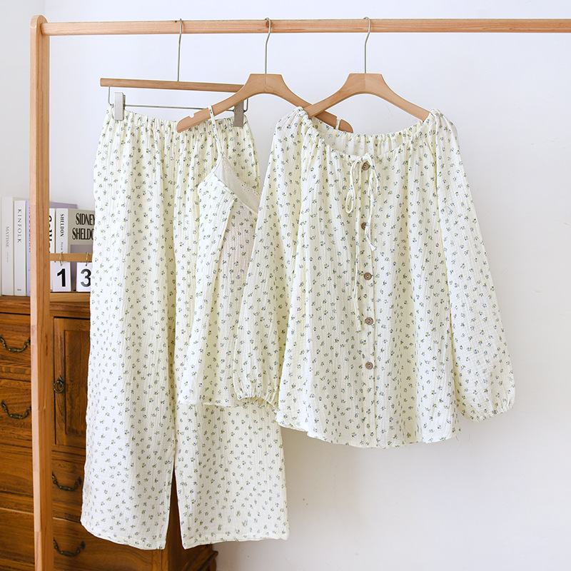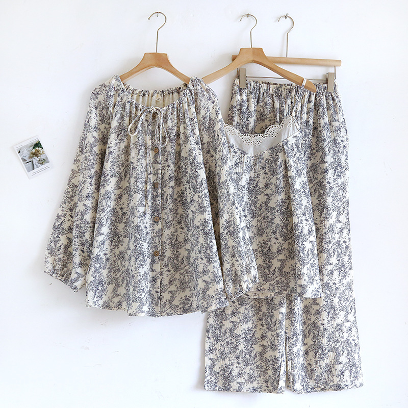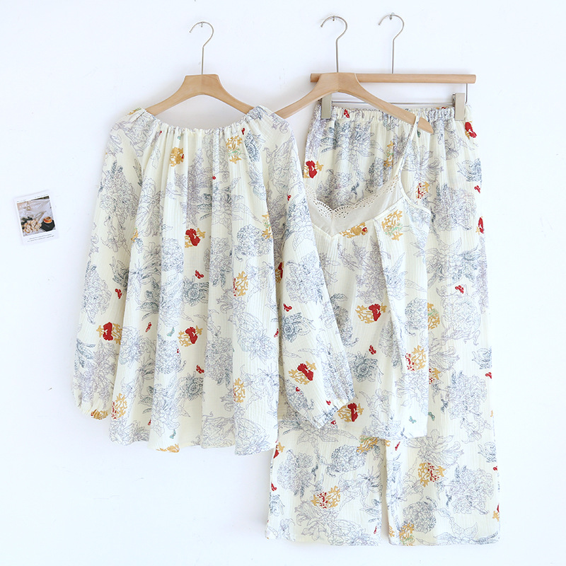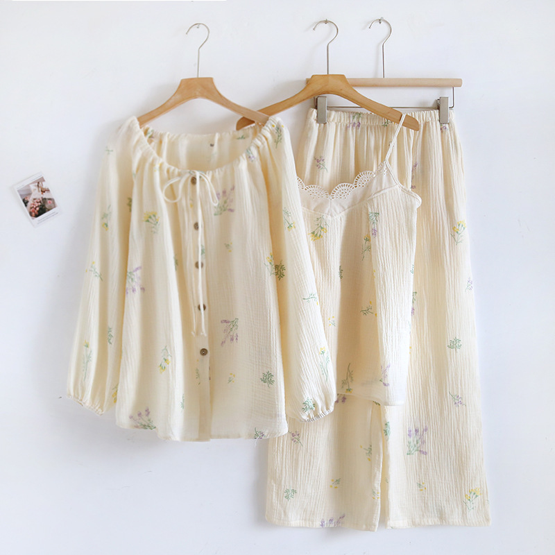 새로운 코튼 크레이프 3 피스 잠옷 여성용 긴팔 카디건 스트랩 레이스 스위트 스타일 홈웨어 세트스토어 가기