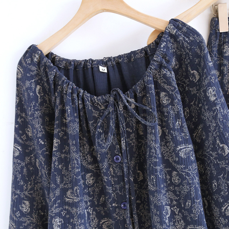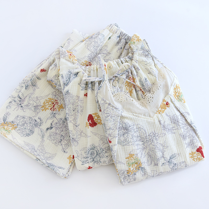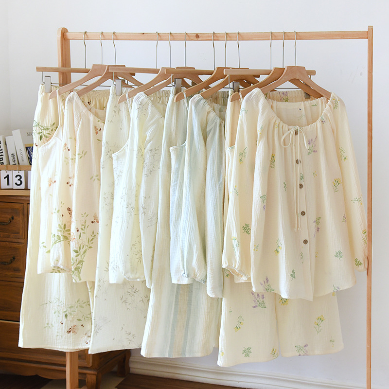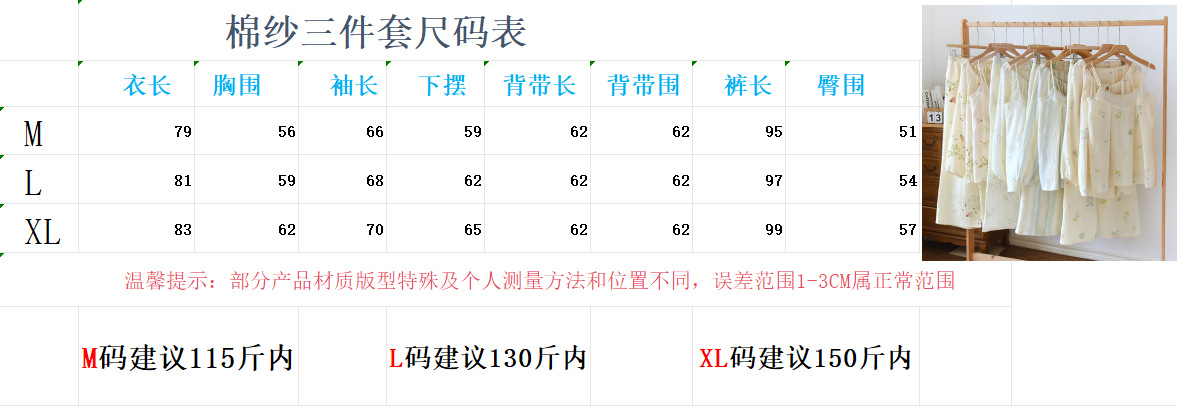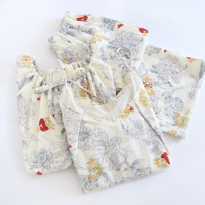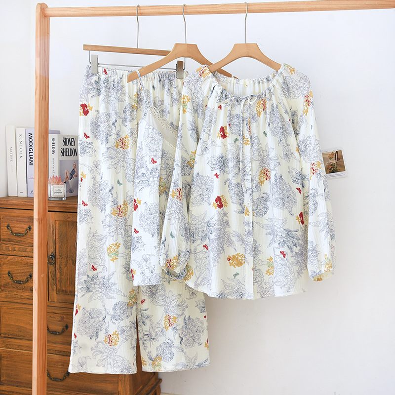 새로운 코튼 크레이프 3 피스 잠옷 여성용 긴팔 카디건 스트랩 레이스 스위트 스타일 홈웨어 세트스토어 가기