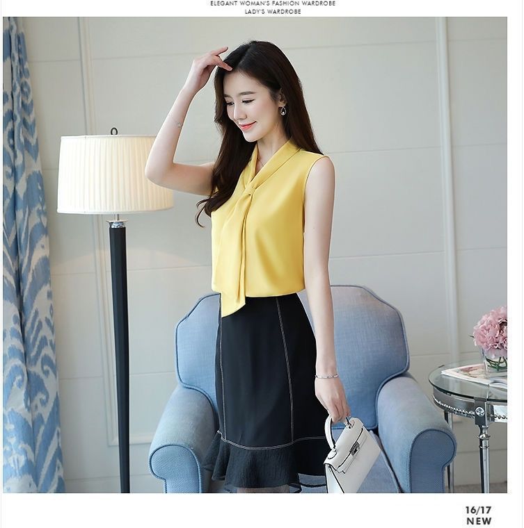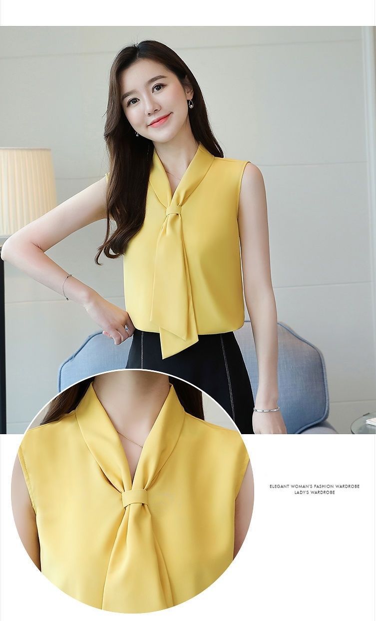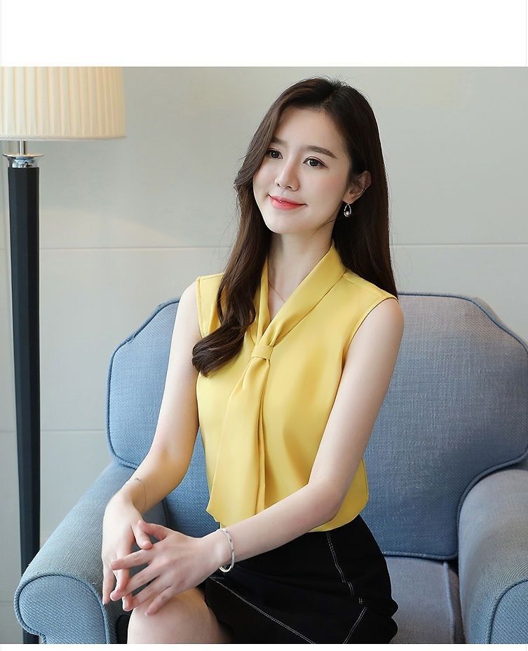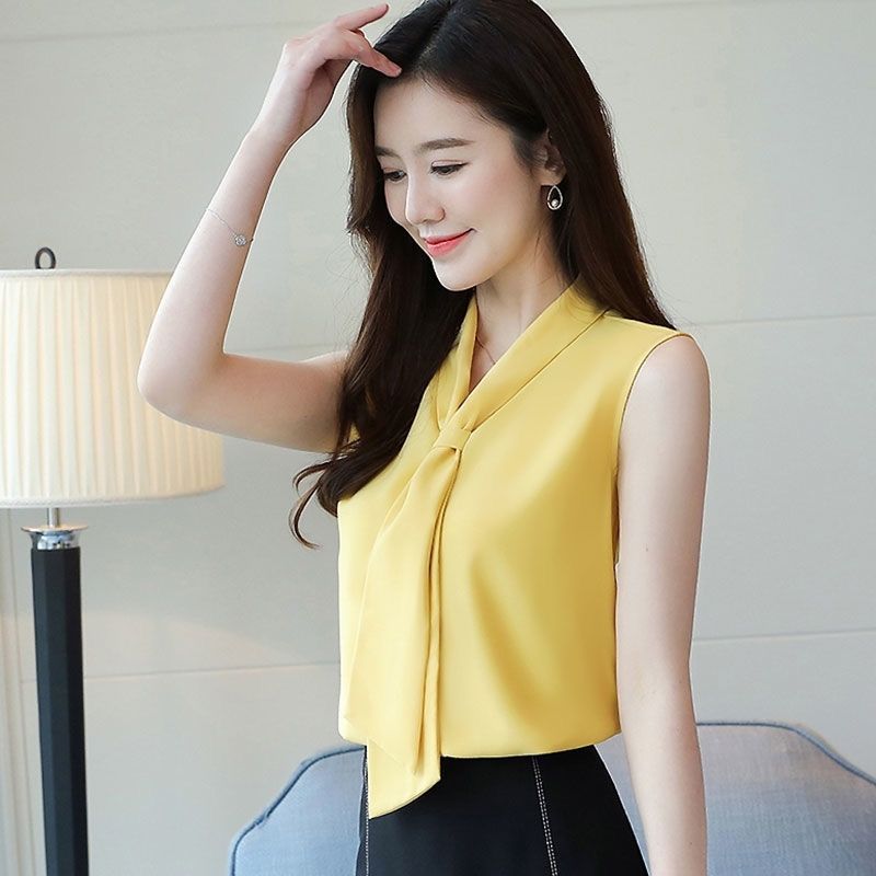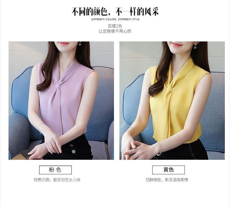 2025 여름 신상 나비넥타이 프로페셔널 웨어, 플로팅 칼라 민소매 루즈핏 시폰 셔츠, 산뜻한 한국 스타일스토어 가기