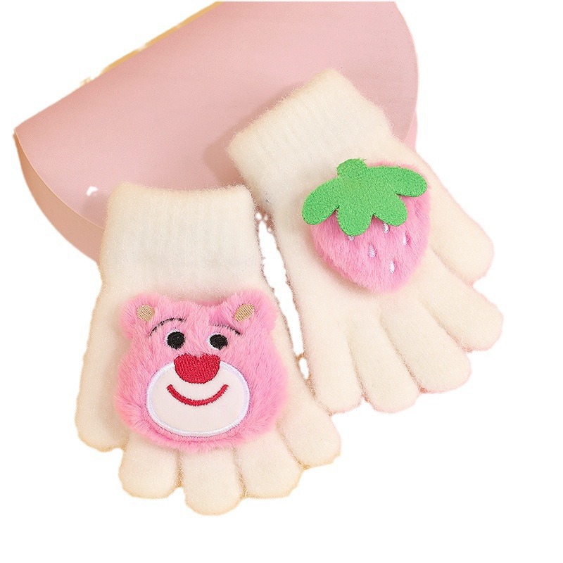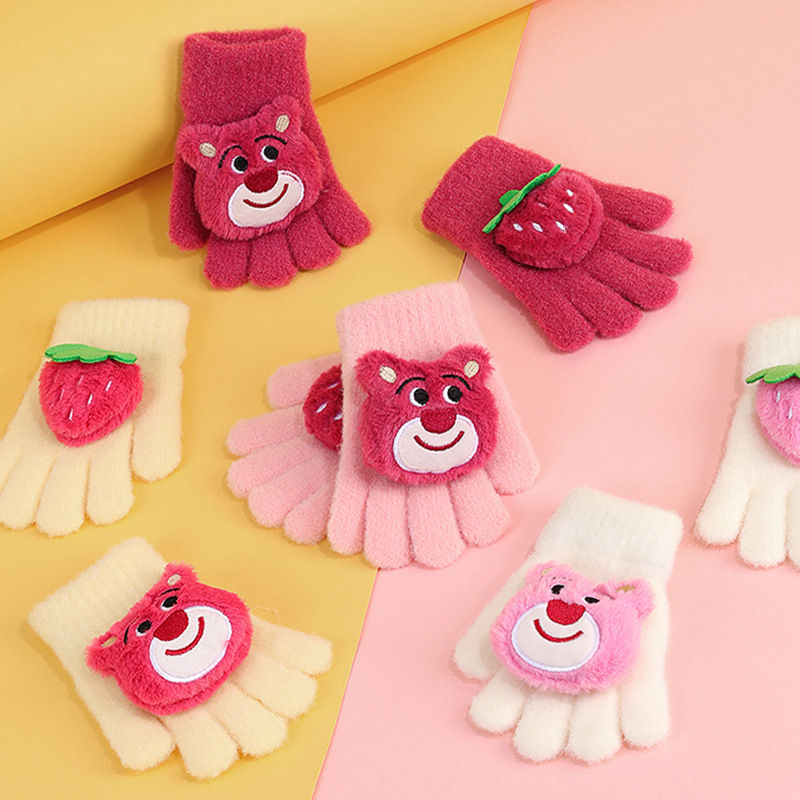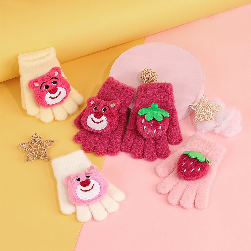 2024 딸기 곰 따뜻한 장갑 귀여운 만화 두꺼운 다섯 손가락 장갑 모방 밍크 모피