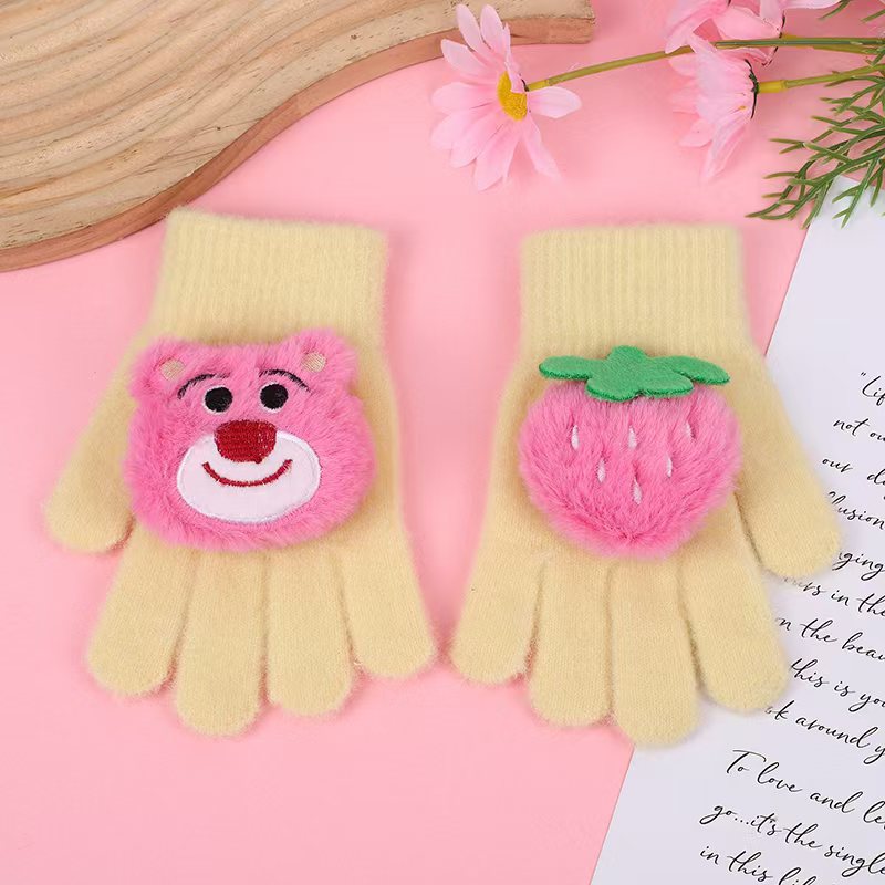 2024 딸기 곰 따뜻한 장갑 귀여운 만화 두꺼운 다섯 손가락 장갑 모방 밍크 모피스토어 가기