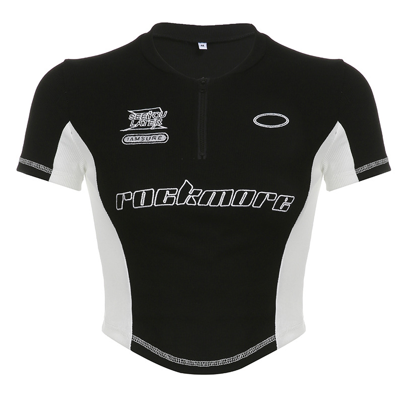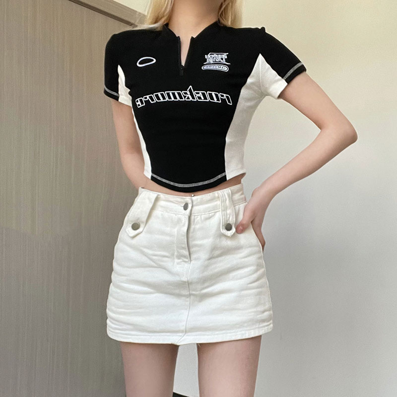미국 스타일 기능성 스타일 스티칭 대비 컬러 인쇄 슬림 핏 슬리밍 라운드 넥 지퍼 탑 짧은 소녀 Navel 티셔츠 여성용스토어 가기
