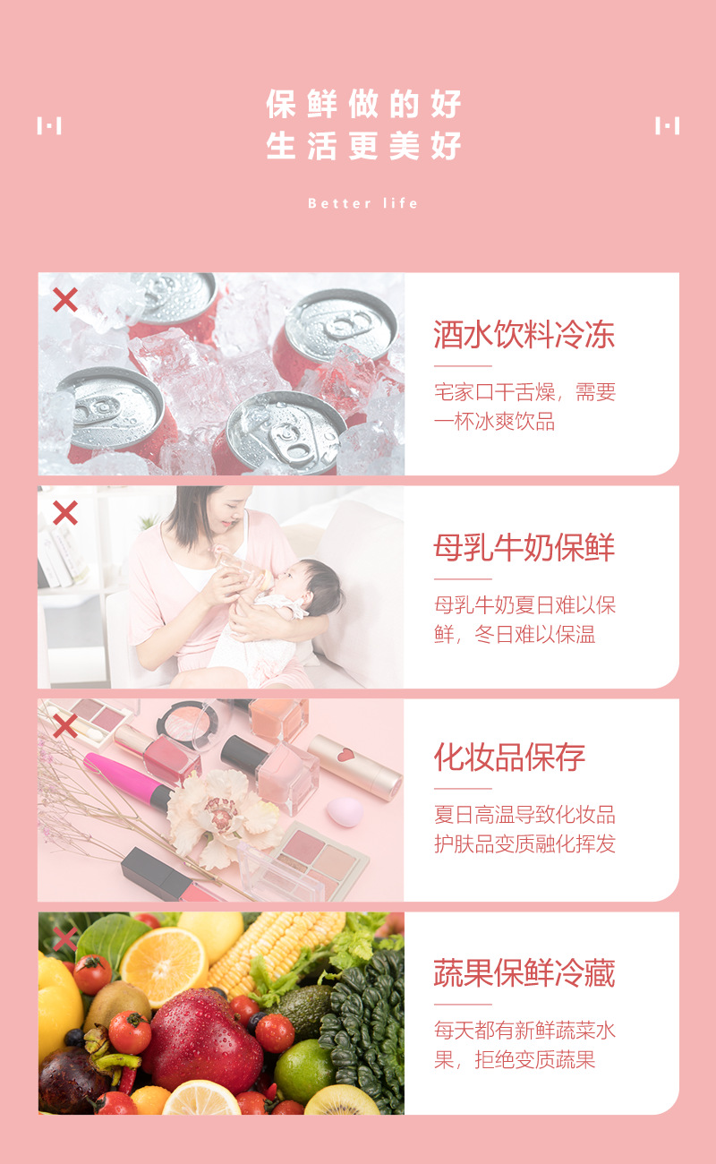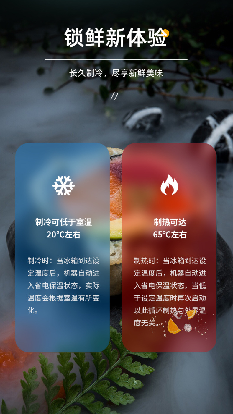 冷热双效多功能制冷可达低于环境温度 15-18℃,稳定保鲜饮料、面膜、精华;制热可达 55-65℃,可温奶、热饮、保温辅食,四季可用,一机多用。