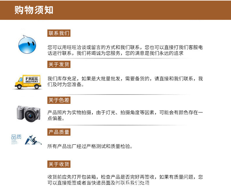 【产品供应】本店是工厂店,直接工厂出货,薄利多销!让你直接拿到一手货源!本厂具有实体网供店!支持全国一件代发! 本店招收地区代理!招收淘宝代理需要图片数据包联系客服!如有问题联系客服!