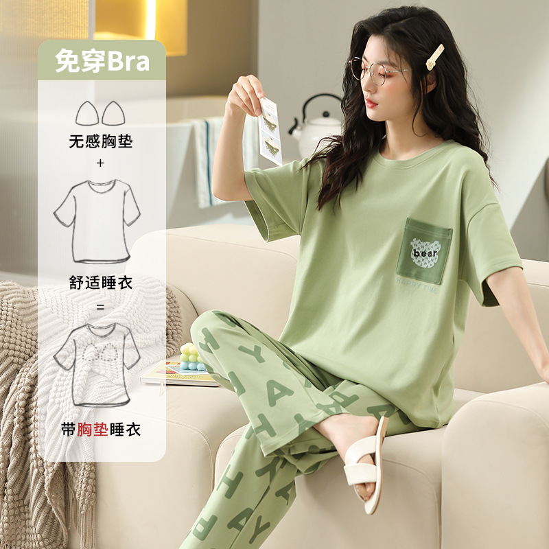 여성용 가슴 패드가 있는 잠옷, 여름 순면 루즈 캐주얼 반팔 바지, 여성용 세트, 홈웨어, 면 여름 아우터웨어스토어 가기