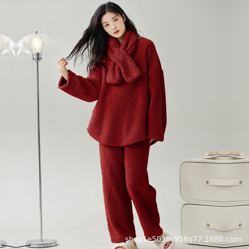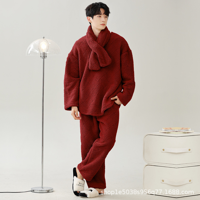 스카프가 달린 빨간 잠옷 가을과 겨울 산호 양털을 두껍게 한 따뜻한 축제 결혼식 남자 야외 홈 웨어