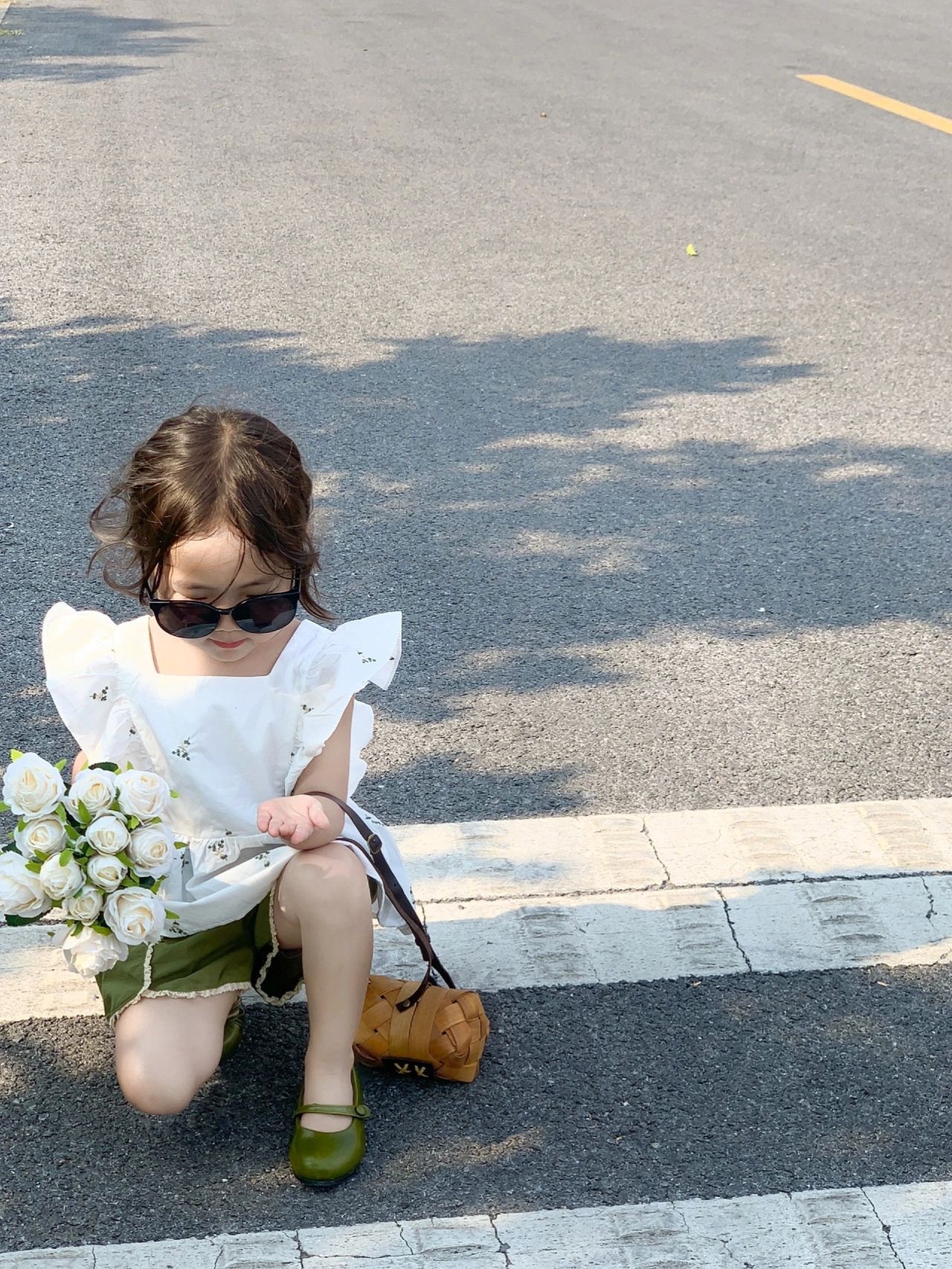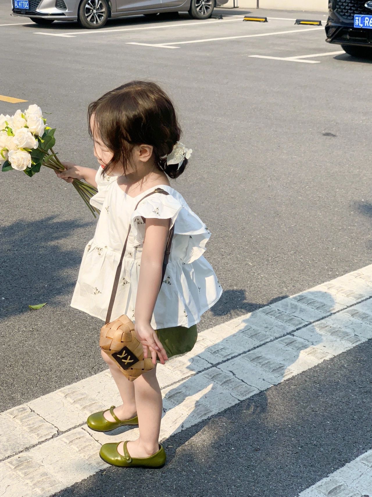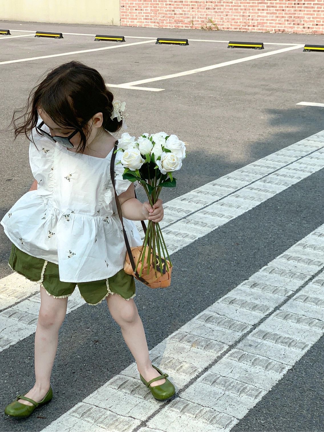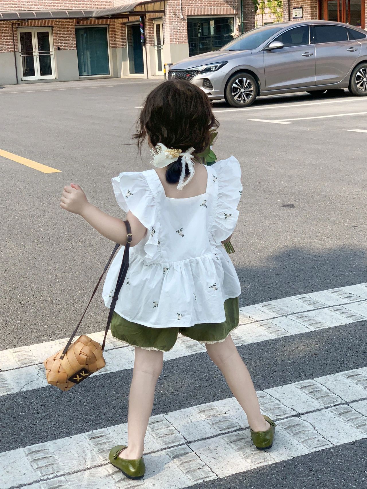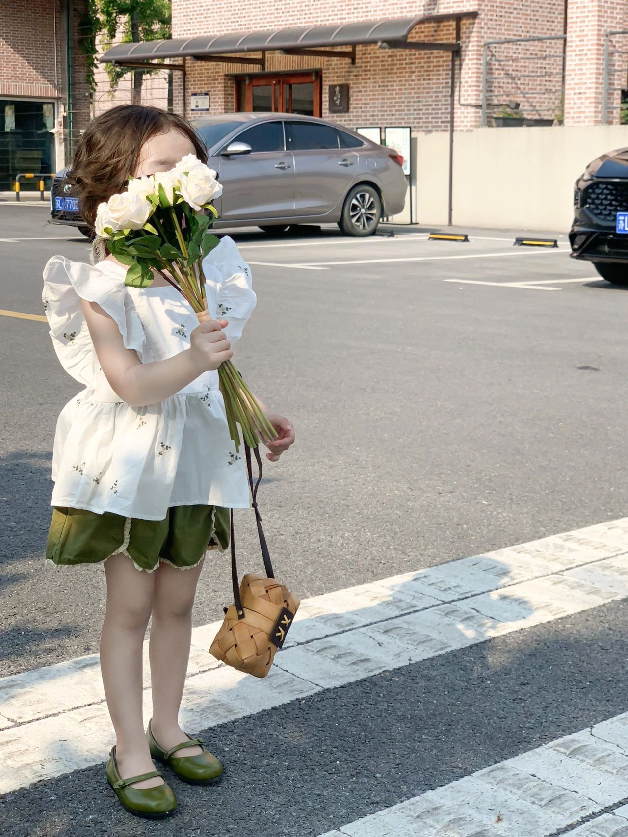 아동복 2025 여름 한국 스타일 소녀의 달콤한 자수 꽃 플라잉 슬리브 조끼 + 레이스 반바지 투피스 양복스토어 가기