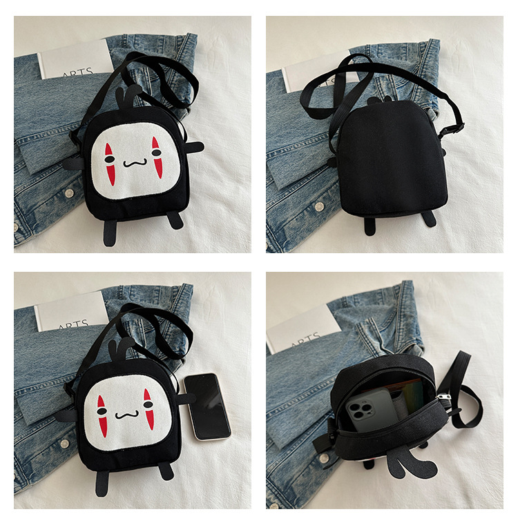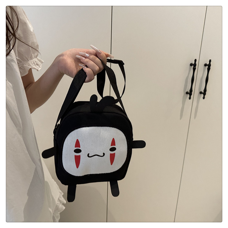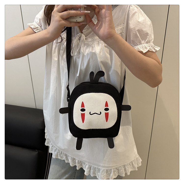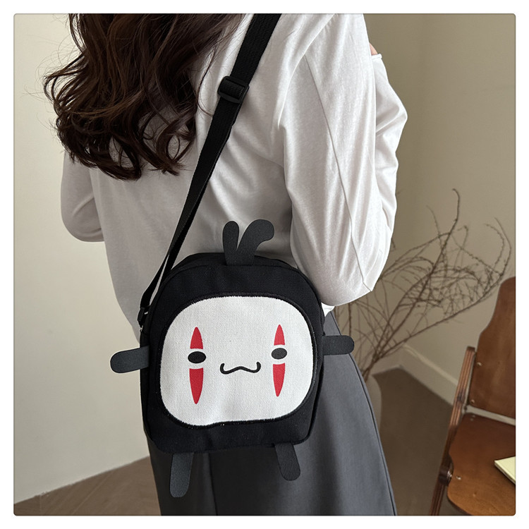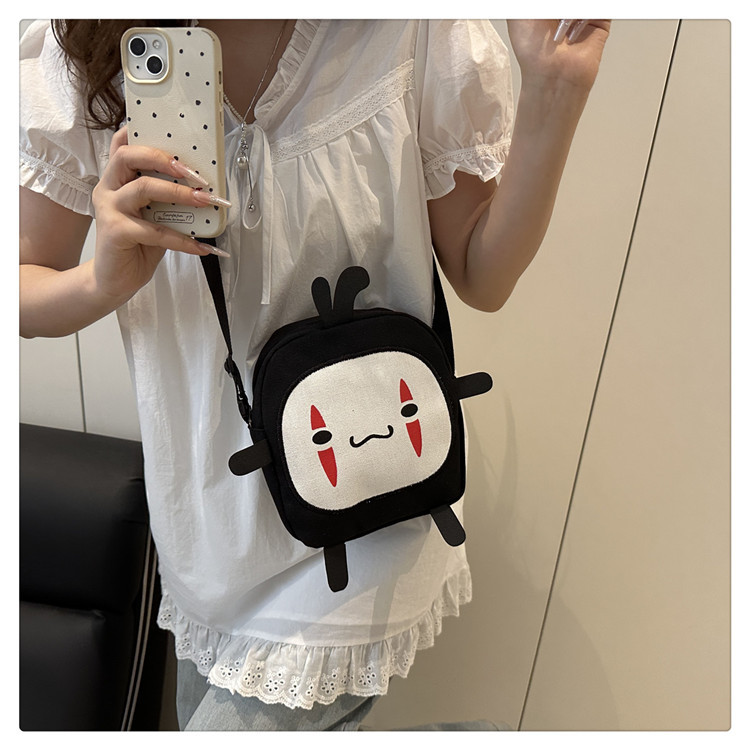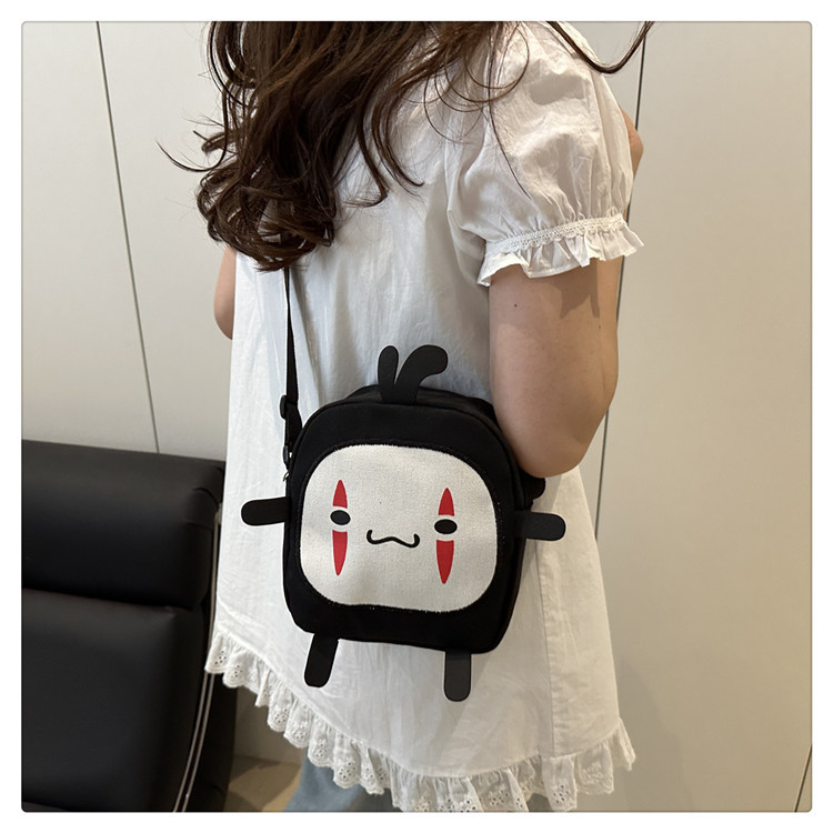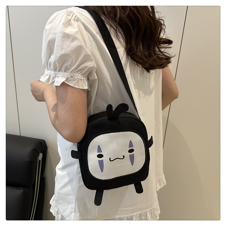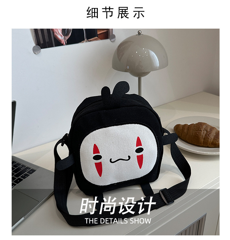 한국 스타일 추악한 귀여운 작은 가방 여성 가방 새로운 2024 여름 작은 둥근 가방 괴물 만화 캔버스 메신저 가방스토어 가기