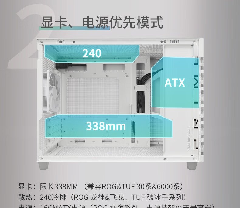 电源长度:支持 140-180mm ATX 电源(如华硕 PRIME 750W 金牌全模组),前置电源仓设计优化理线空间。